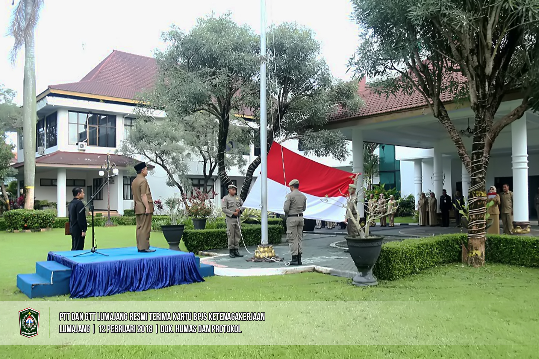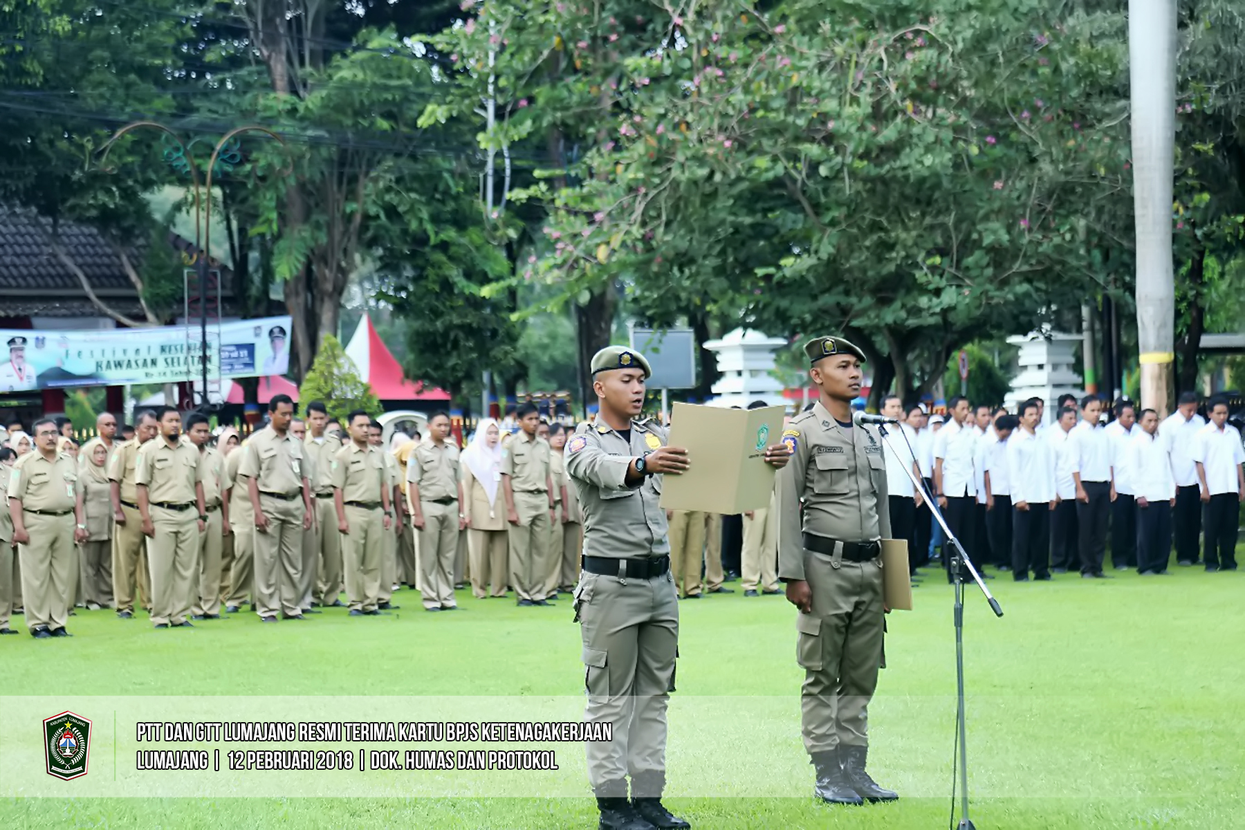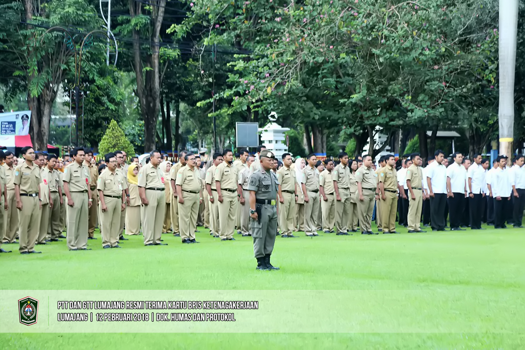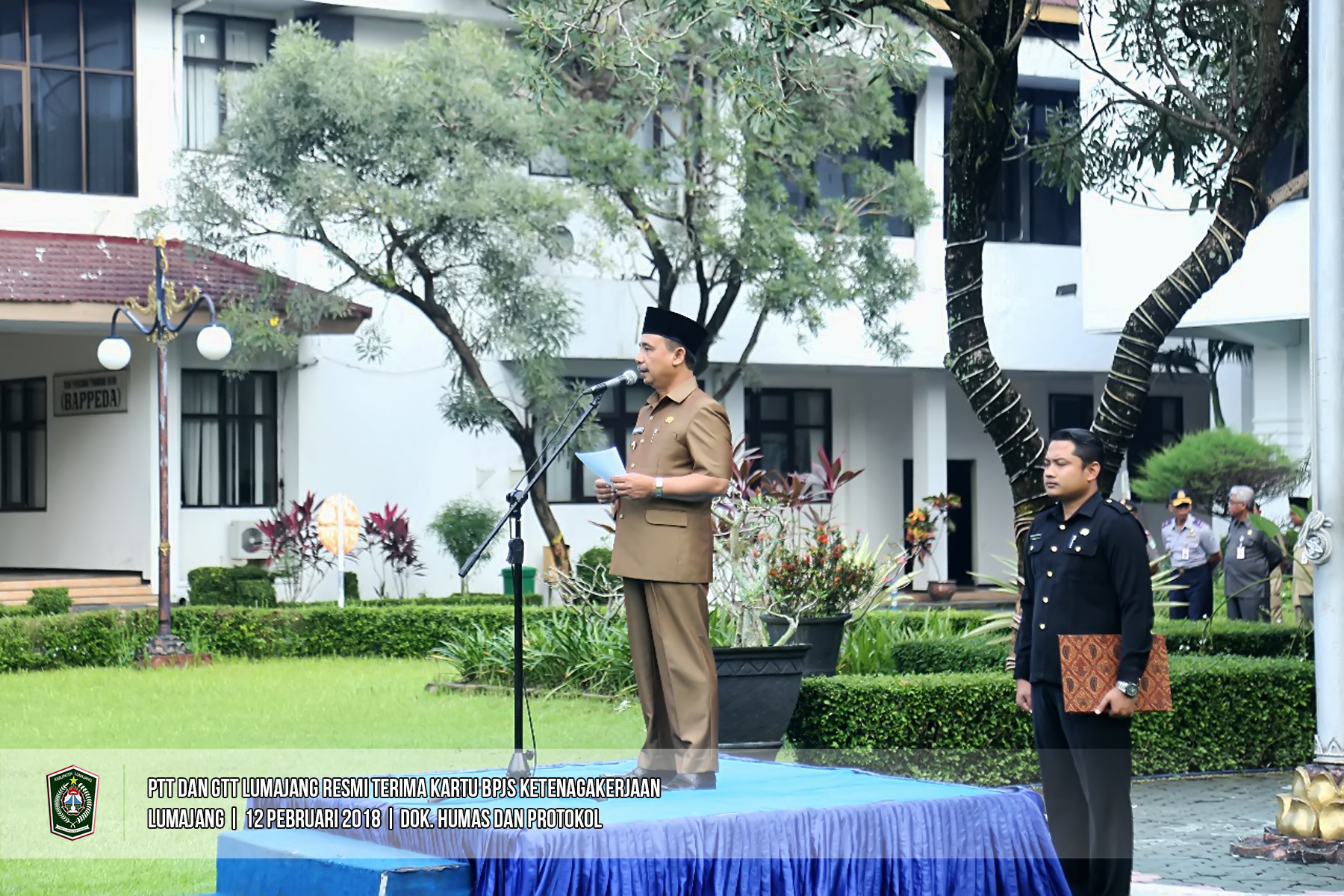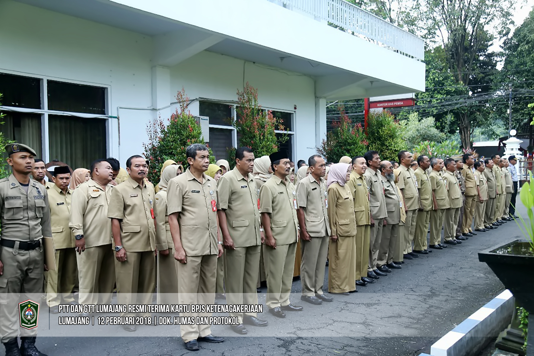 Pegawai Tidak Tetap (PTT) dan Guru Tidak Tetap (GTT) di lingkup Pemkab Lumajang resmi mendapat Kartu BPJS Ketenagakerjaan. Penyerahan Kartu tersebut dilakukan secara simbolis kepada 2 orang perwakilan PTT/GTT oleh Bupati Lumajang, Drs. As’at, M.Ag pada Upacara Bendera Aparatur Sipil Negara (ASN), di Halaman Pemkab. Lumajang, Senin pagi (12/2/2018). (Bag. Humas & Protokol-lmj)