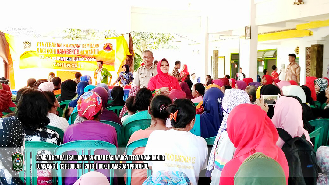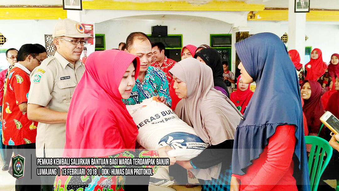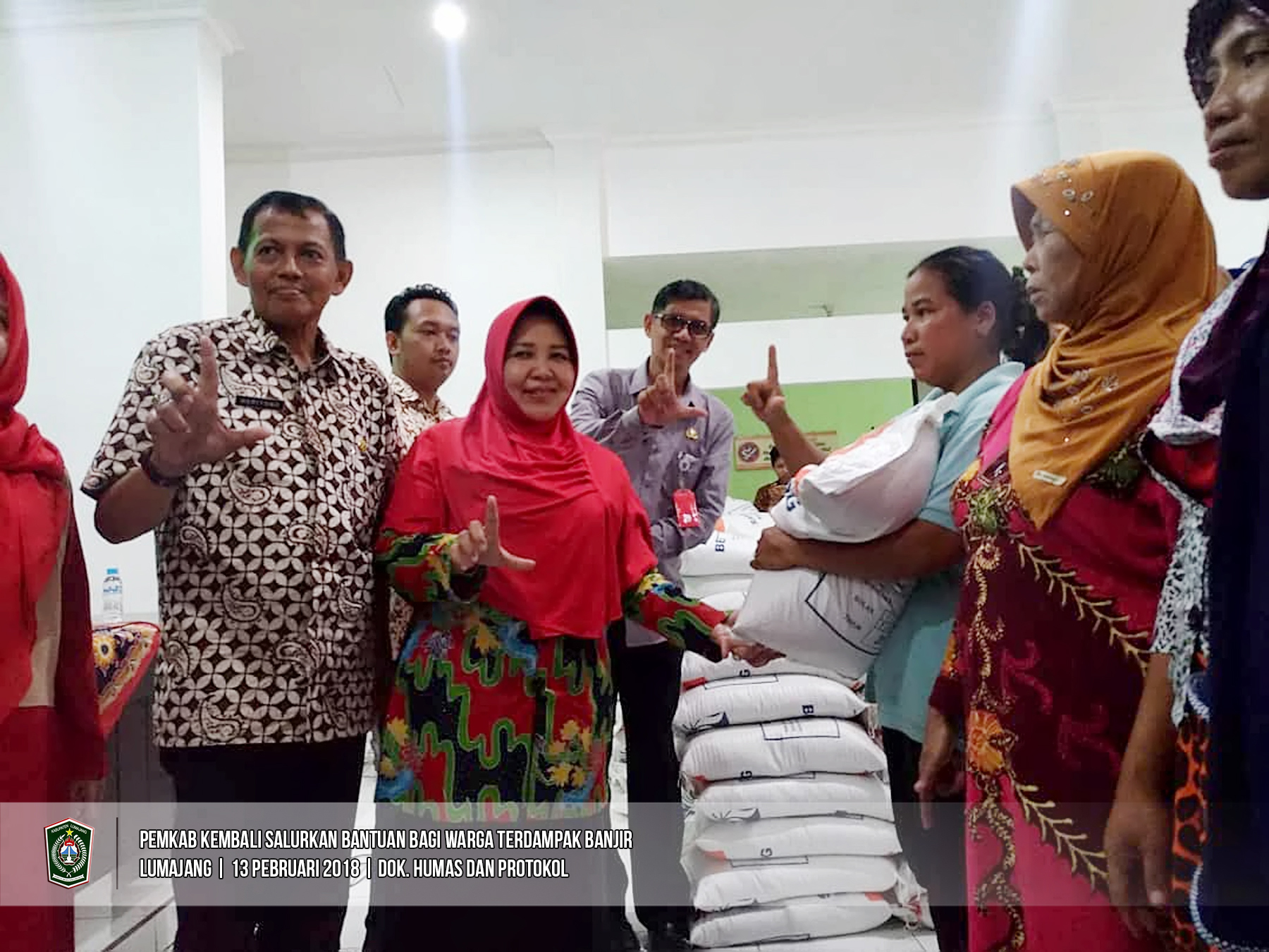 Ketua Tim Penggerak PKK Kabupaten Lumajang, Tutuk As'at menyerahkan bantuan sembako berupa beras (15 Kg per Kepala Keluarga) bagi korban bencana banjir di Desa Rowokangkung Kecamatan Rowokangkung dan Kecamatan Jatiroto yang terdampak banjir beberapa waktu yang lalu, Selasa (13/2/2018). (Bag. Humas & Protokol-lmj)