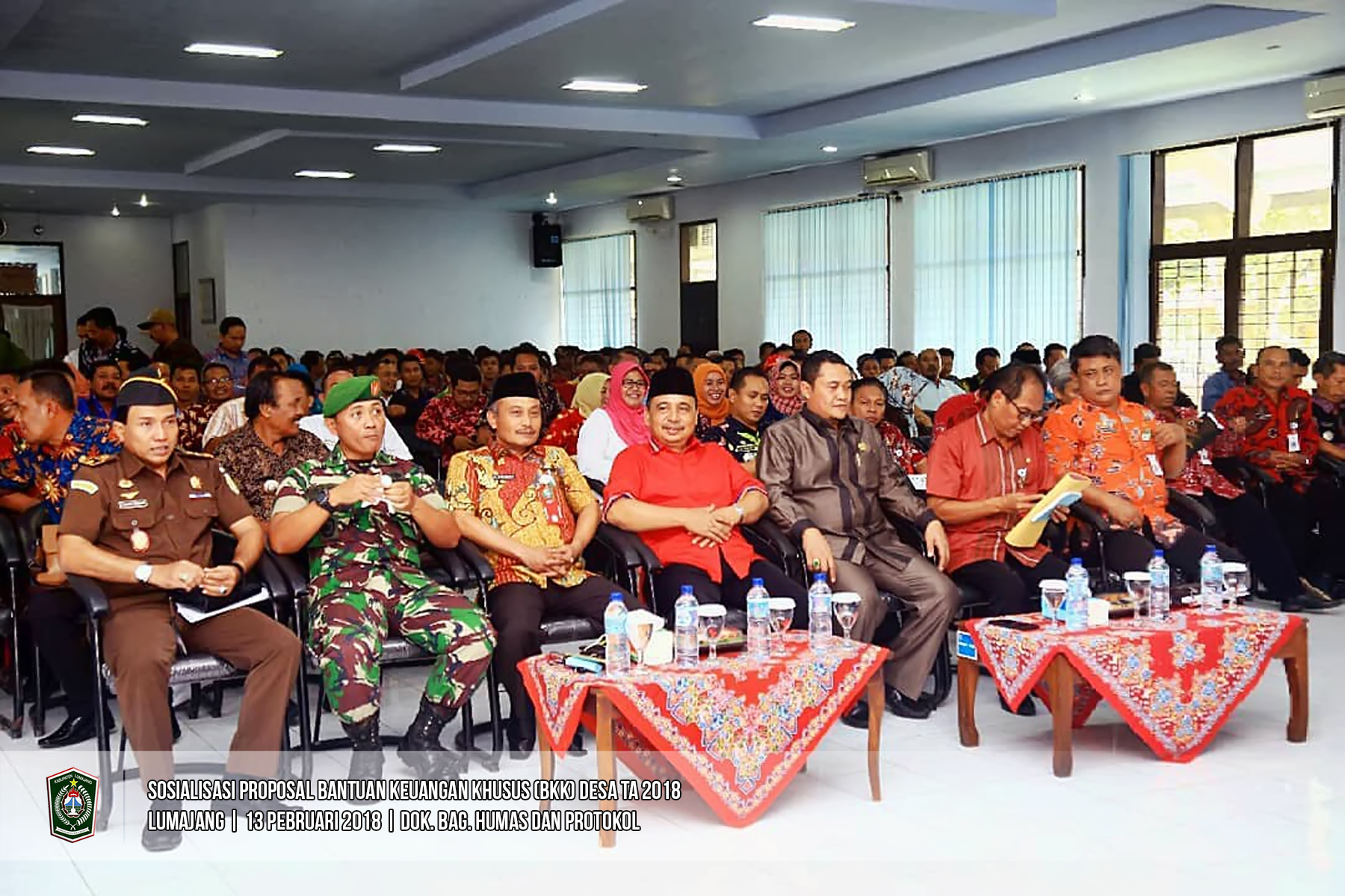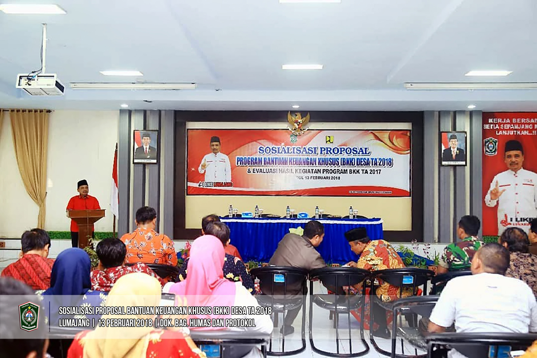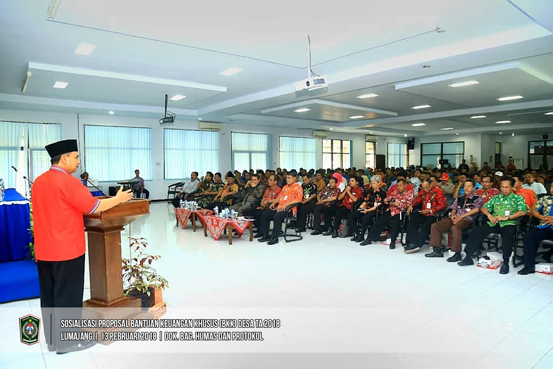 Dinas PUTR Kab. Lumajang melaksanakan kegiatan Sosialisasi Proposal Bantuan Keuangan Khusus (BKK) Desa TA 2018 dan Evaluasi hasil kegiatan program BKK TA 2017, yang dibuka oleh Bupati Lumajang, Drs. As’at, M. Ag bertempat di Aula BKD Lumajang, Selasa (13/02/2018). (Bag. Humas & Protokol-lmj)