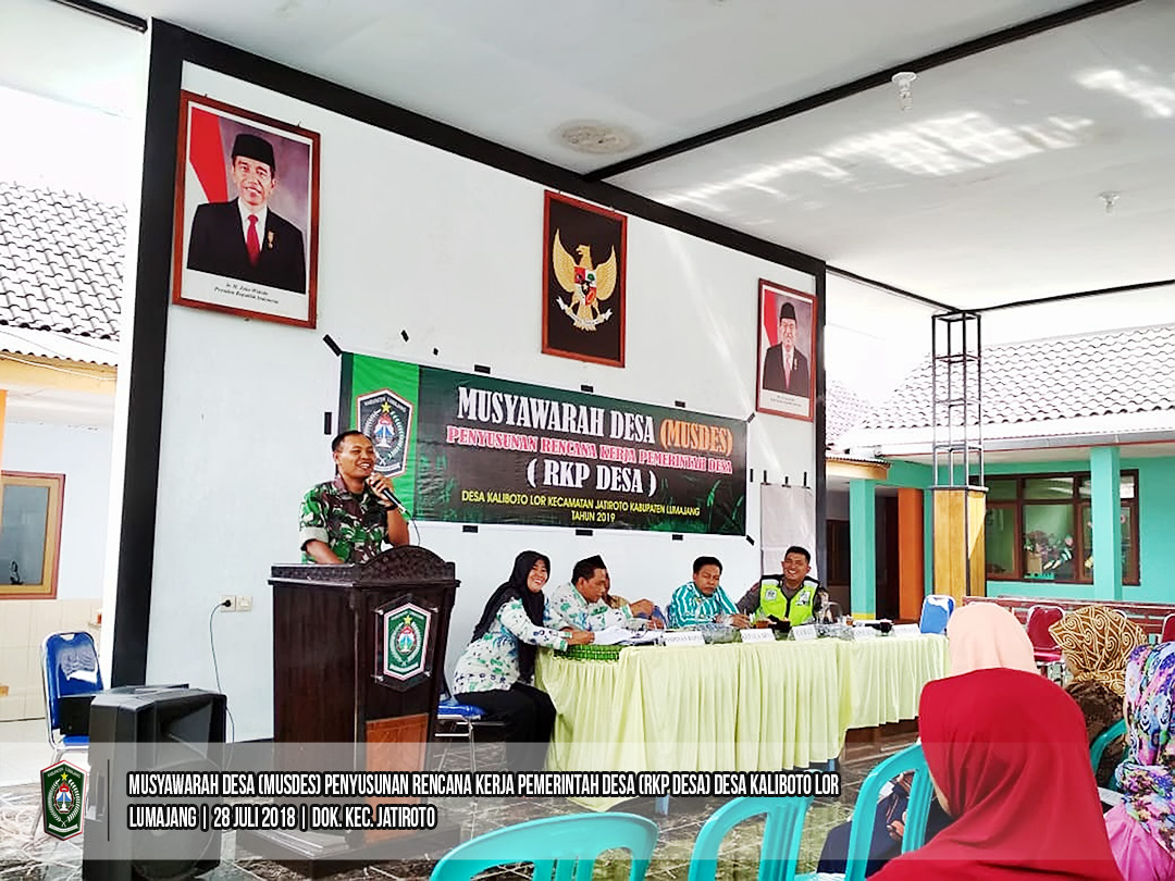 Camat Jatiroto, Drs. Matali Bilogo, S.Sos membuka Kegiatan Musyawarah Desa dalam rangka Penyusunan Rencana Kerja Pemerintah Desa Kaliboto Lor (RKP-Des) yang dihadiri oleh Pj.Kepala Desa Kaliboto Lor, Jajaran BPD, LKMD, Babinsa, Babinkamtibmas, Tokoh Agama, Tokoh Masyarakat, dan Ketua RT/RW bertempat di Balai Desa Kaliboto Lor, Kecamatan Jatiroto. Sabtu (28/7).