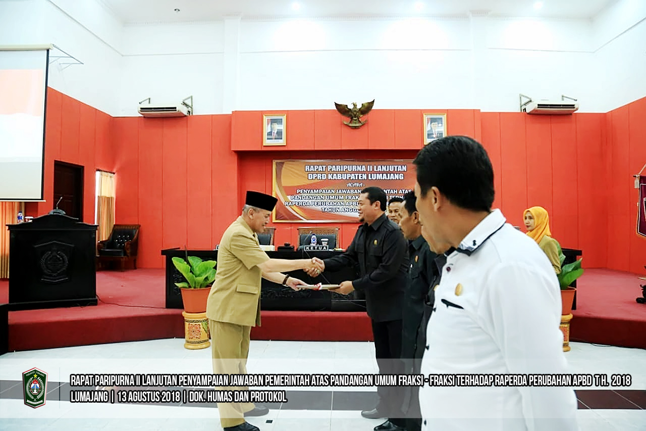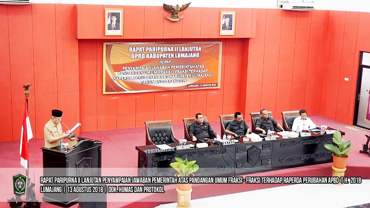 Rapat Paripurna II Lanjutan DPRD Kabupaten Lumajang dengan agenda Penyampaian Jawaban Pemerintah Atas Pandangan Umum Fraksi-fraksi terhadap Raperda Perubahan APBD Kabupaten Lumajang Tahun 2018 digelar di Kantor DPRD Kabupaten Lumajang, Senin Pagi (13/8/2018). Jawaban Pemerintah disampaikan oleh Wakil Bupati Lumajang dr. Buntaran Suprianto, M.Kes.