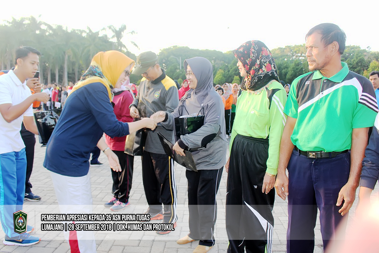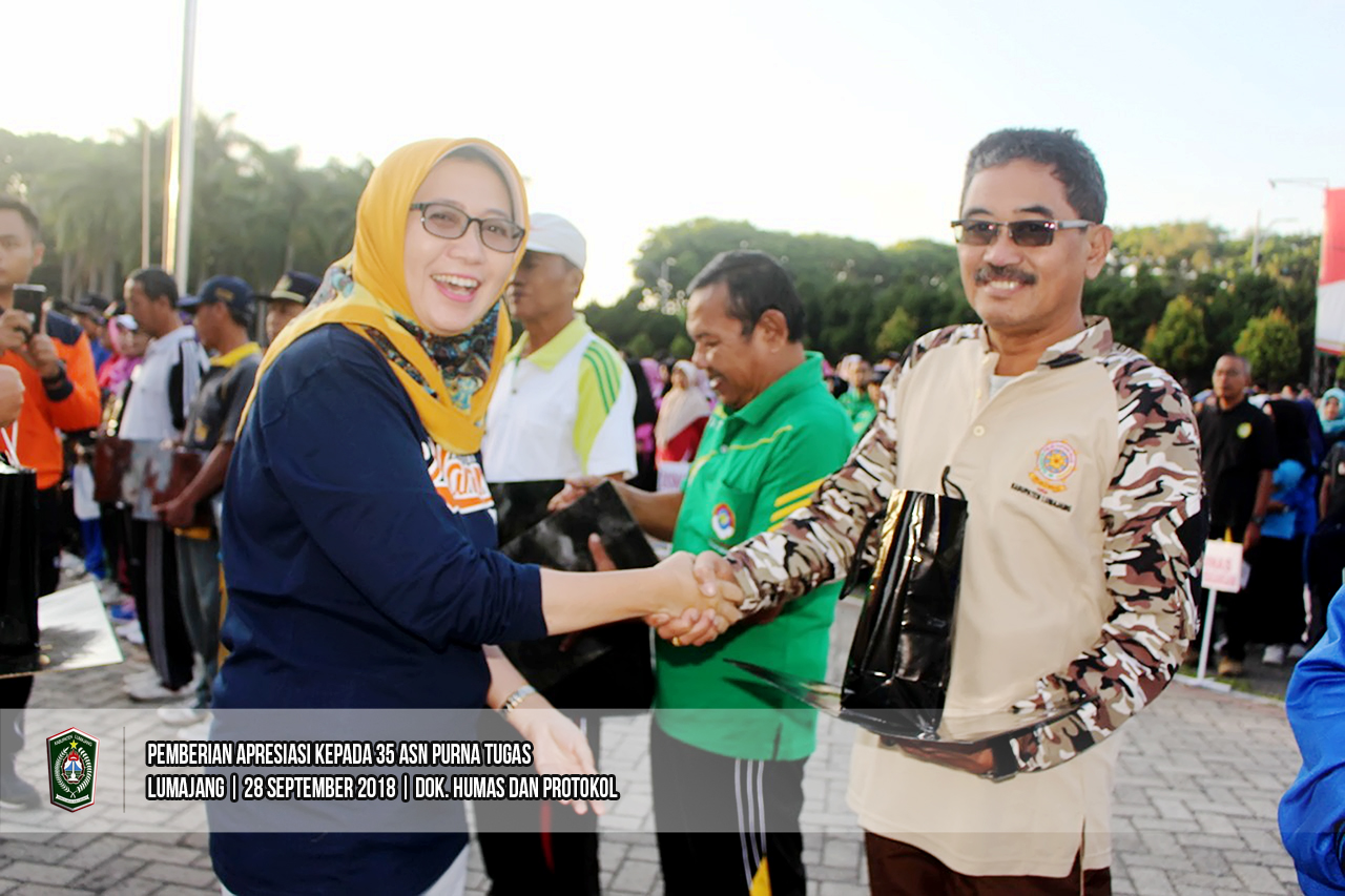 Pemerintah Kabupaten Lumajang memberikan apresiasi setinggi-tingginya kepada 35 Aparatur Sipil Negara (ASN) yang akan menjalani masa purna tugas per 1 Oktober 2018. Hal tersebut disampaikan oleh Bupati Lumajang Thoriqul Haq (Cak Thoriq) dan Wakil Bupati Lumajang Indah Amperawati (Bunda Indah) saat memimpin Apel Senam Kesegaran Jasmani (SKJ) bersama seluruh jajaran ASN di lingkungan Pemerintah Kabupaten Lumajang, bertempat di Alun-alun Lumajang, Jumat (28/9/2018).