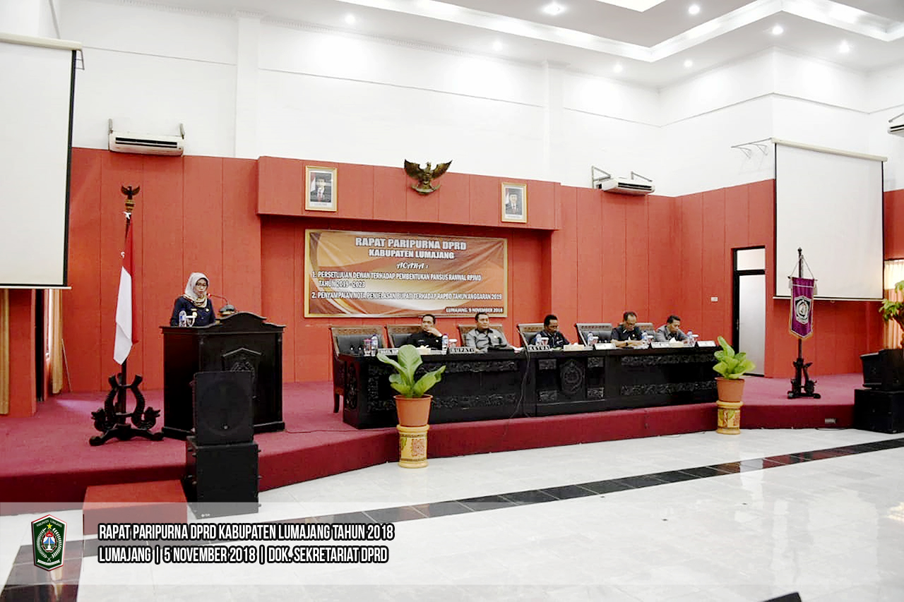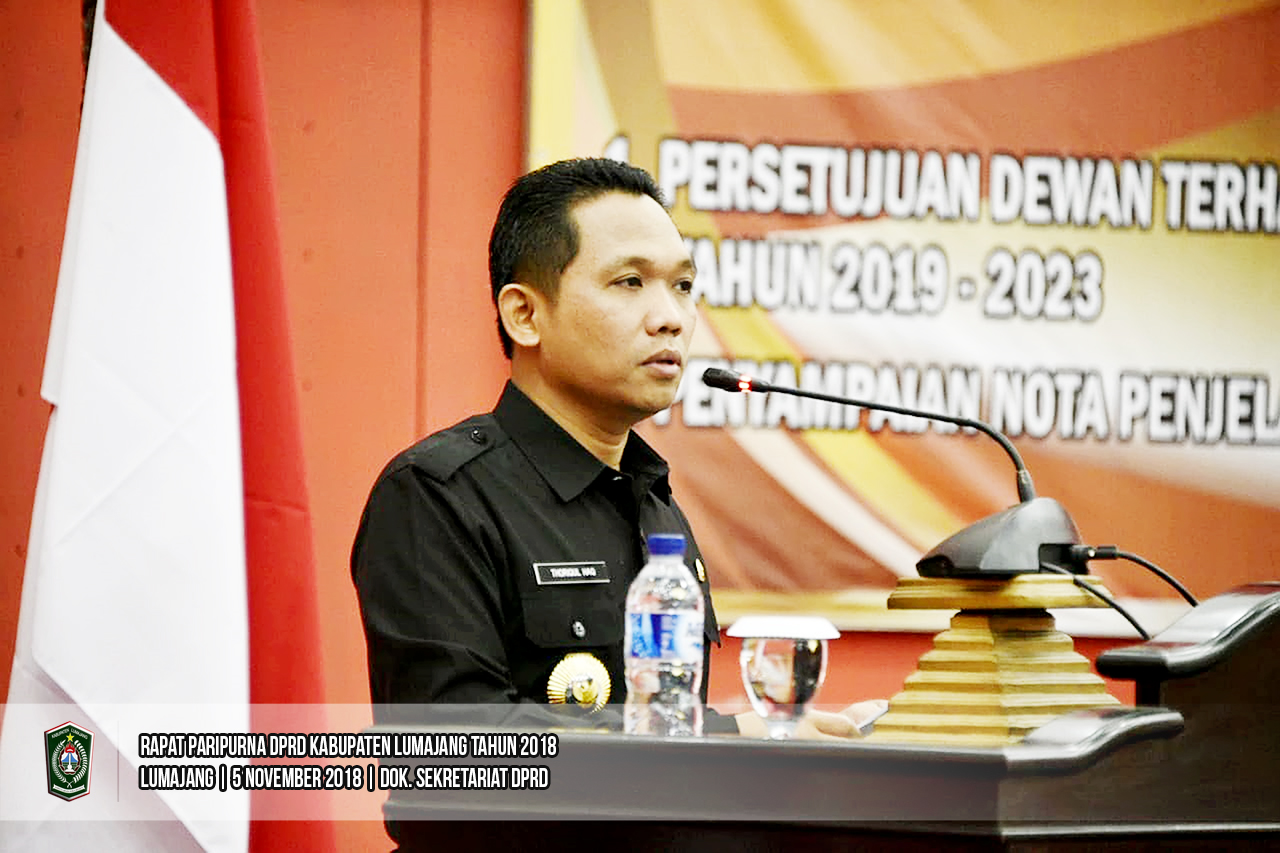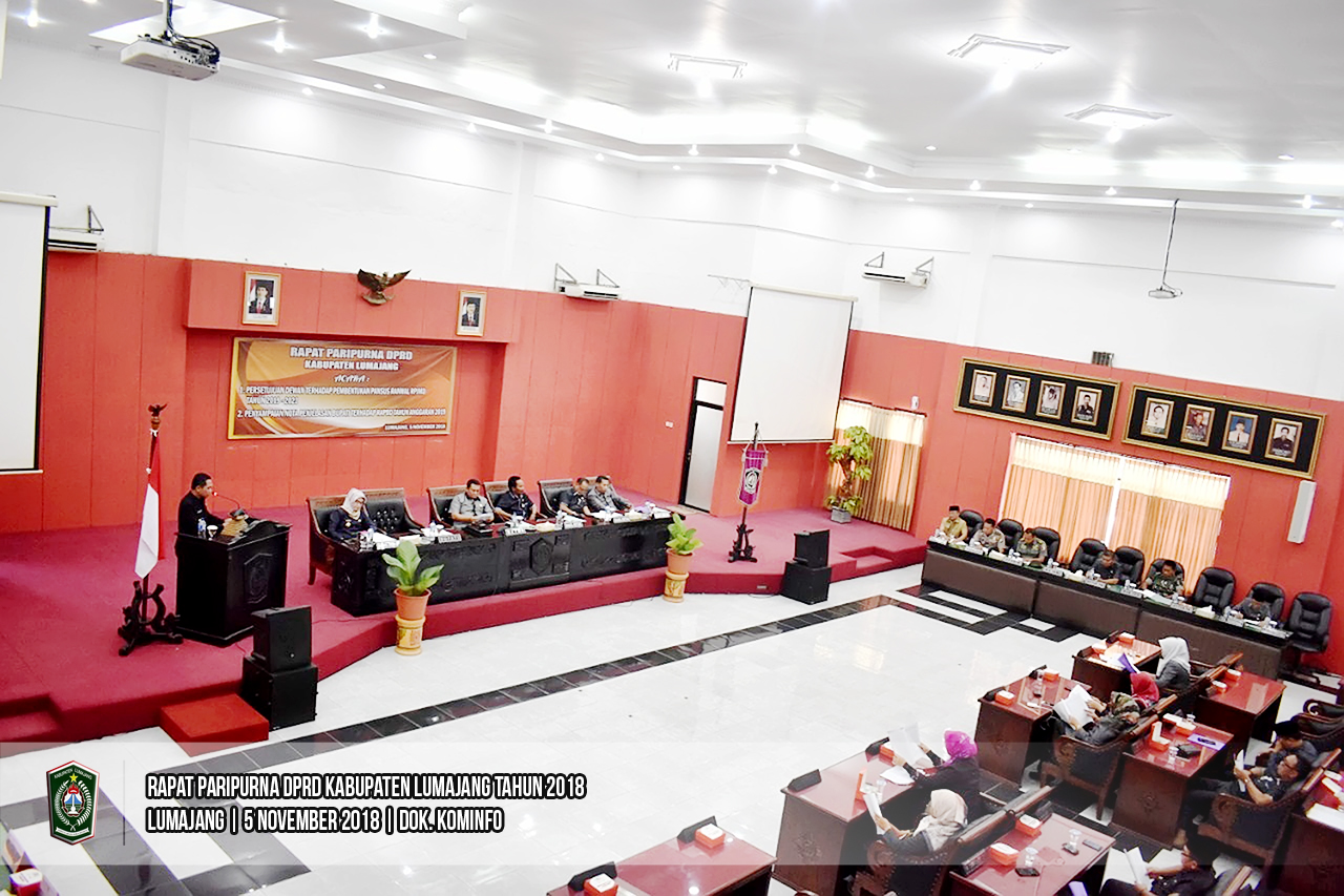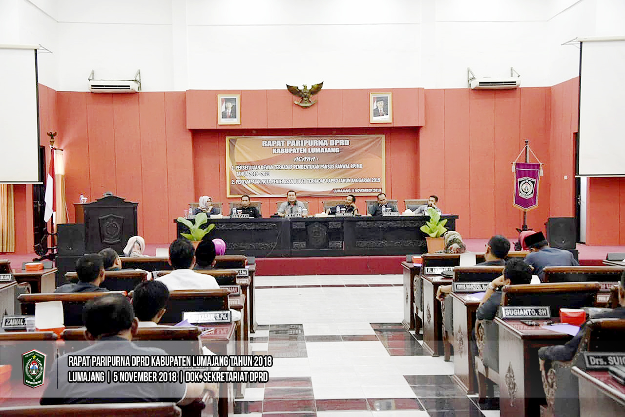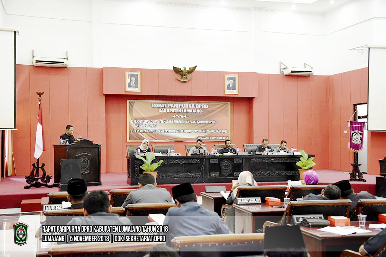 Ketua Dewan Perwakilan Rakyat Daerah (DPRD) Kabupaten Lumajang, Agus Wicaksono memimpin Rapat Paripurna di Ruang Rapat Paripurna DPRD Lumajang, Senin (05/11/2018). Rapat Paripurna kali ini membahas 2 agenda yakni Persetujuan Dewan Terhadap Pembentukan Pansus Ranwal RPJMD 2019-2023 dan Penyampaian Nota Penjelasan Bupati terhadap RAPBD Tahun Anggaran 2019.
