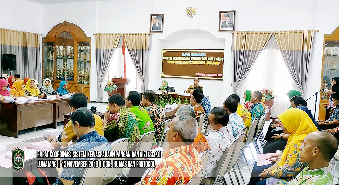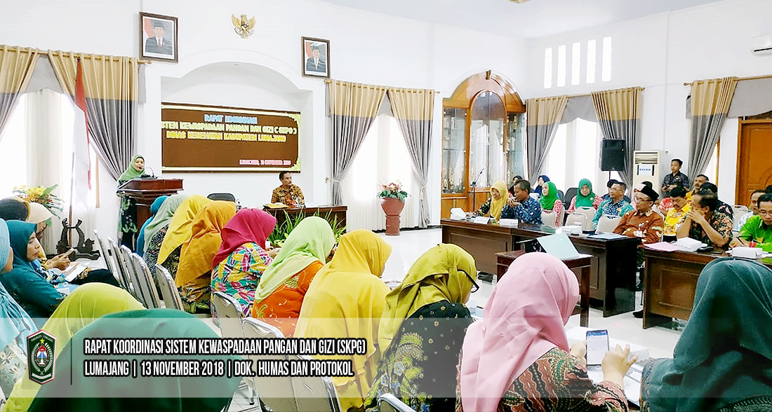 Dalam rangka meningkatkan dan memperbaiki kualitas gizi masyarakat Lumajang, Pemerintah Kabupaten Lumajang melalui Dinas Kesehatan mengadakan Rapat Koordinasi Sistem Kewaspadaan Pangan dan Gizi (SKPG) di Aula Panti PKK, Selasa (13/11/2018). Kegiatan ini diikuti oleh Kelompok Kerja Kewaspadaan Pangan dan Gizi yang berasal dari beberapa OPD, Camat, dan Ketua TP. PKK Kecamatan se-Kabupaten Lumajang.
