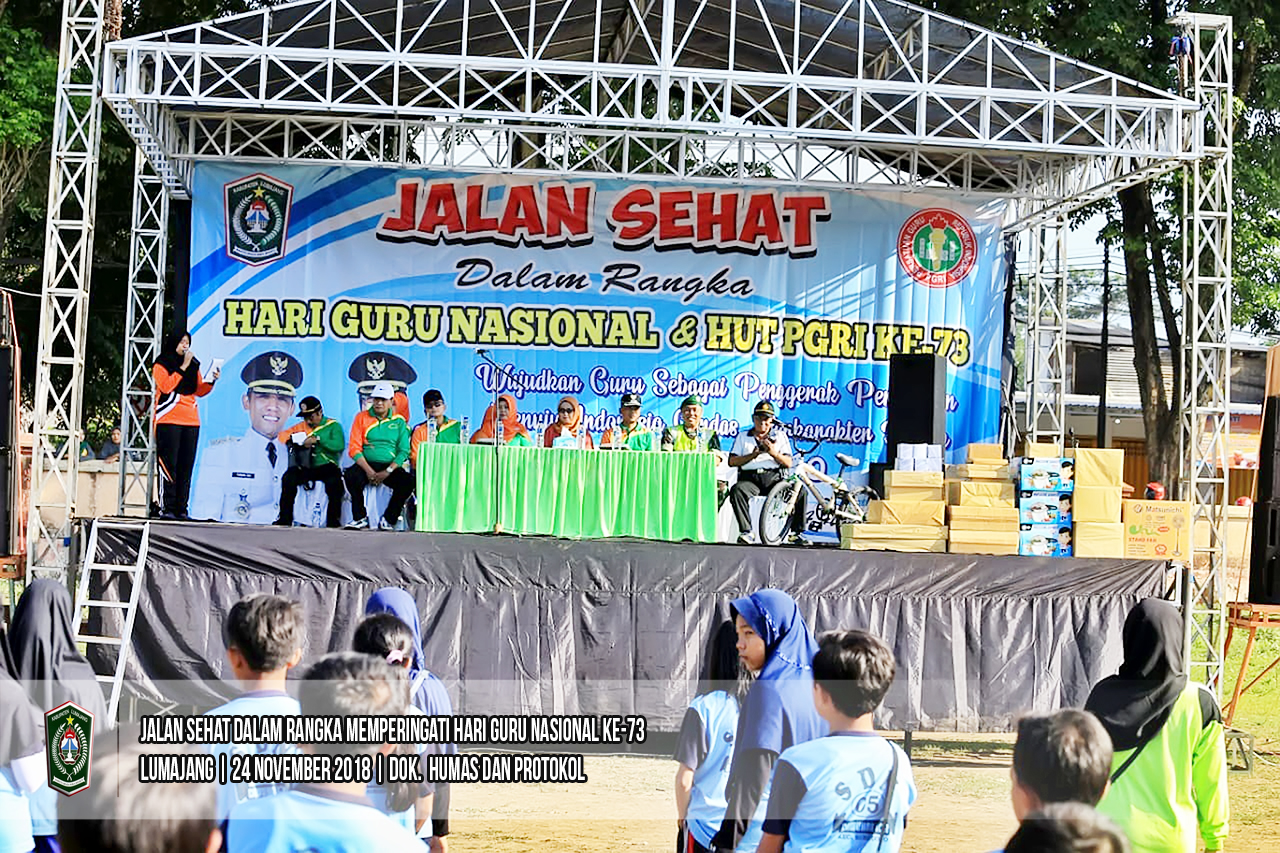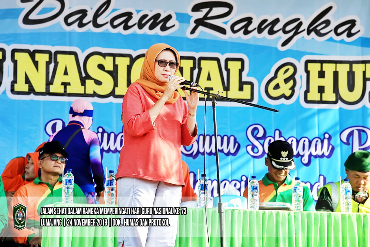 Hal tersebut disampaikan oleh Wakil Bupati Lumajang Indah Amperawati (Bunda Indah) saat memberangkatkan ribuan peserta jalan sehat dalam rangka memperingati Hari Guru Nasional ke-73, dengan tema “Wujudkan Guru sebagai Penggerak Perubahan Menuju Indonesia Cerdas Berkarakter dalam Revolusi Industri”, bertempat di Lapangan Minak Koncar Desa Kutorenon Kecamatan Sukodono, Sabtu (24/11/2018) pagi.