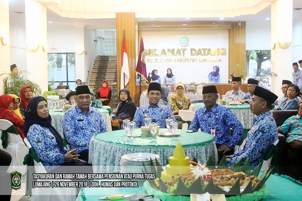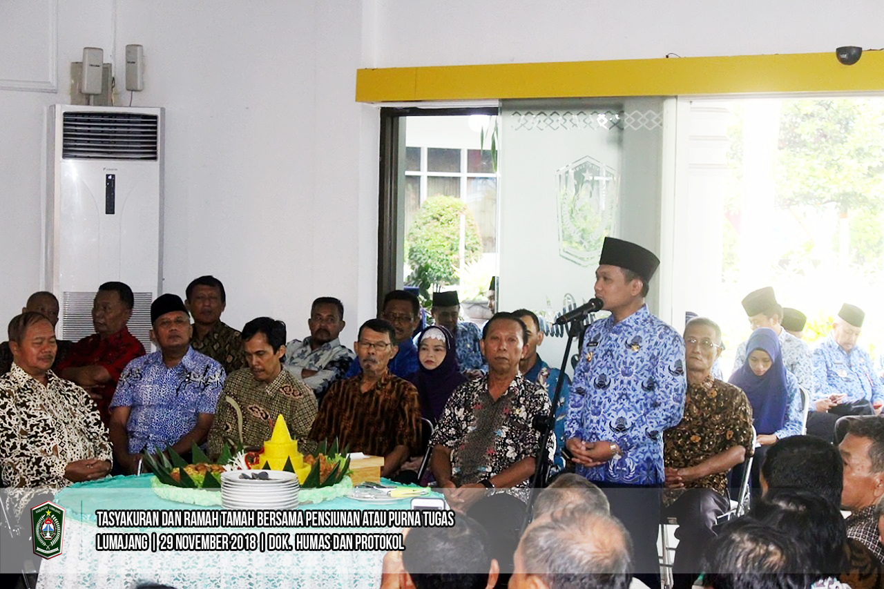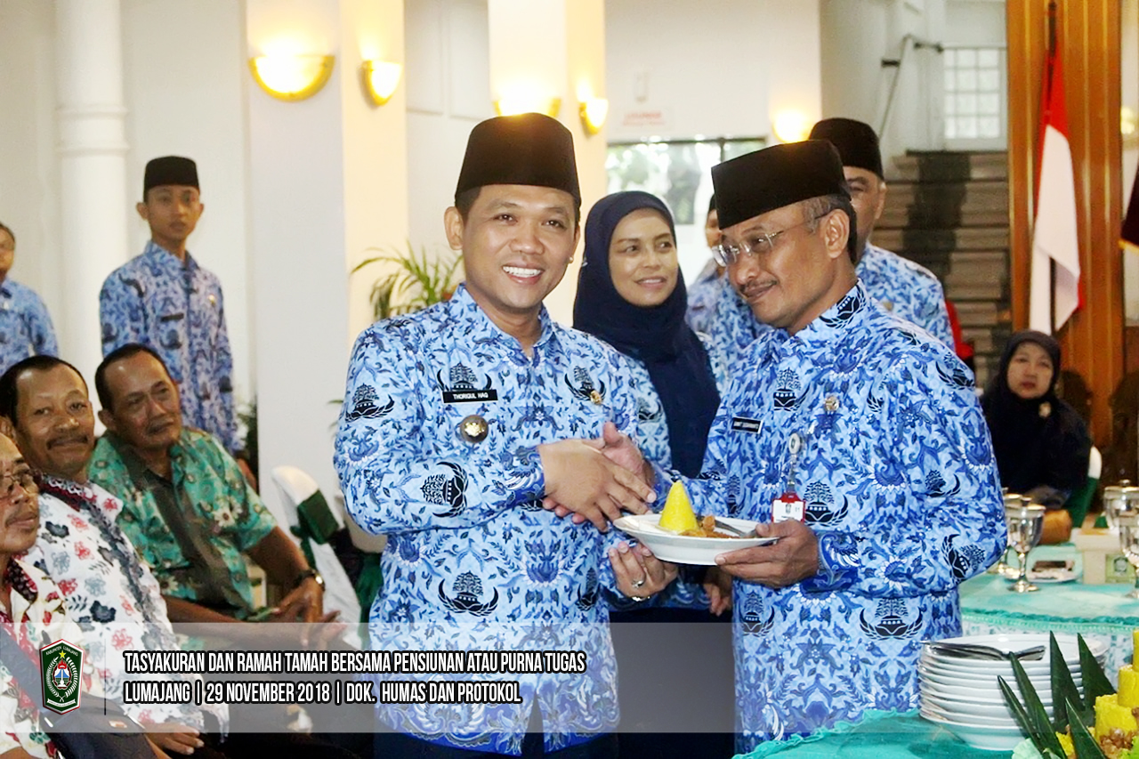 Pemerintah Kabupaten Lumajang menggelar tasyakuran dan ramah tamah bersama Pensiunan atau Purna Tugas di Lobby Kantor Bupati Lumajang, Kamis pagi (29/11/2018). Acara tersebut dilaksanakan dalam rangka peringatan HUT KORPRI ke-47. Pada kesempatan itu, Bupati juga menyerahkan tali asih kepada 106 ASN yang memasuki masa pensiun atau purna tugas. Tali asih itu, diberikan secara simbolis kepada 3 orang perwakilan.