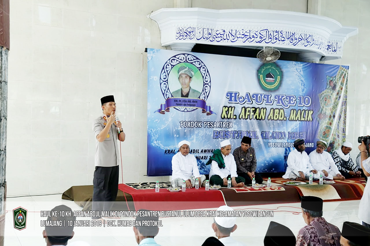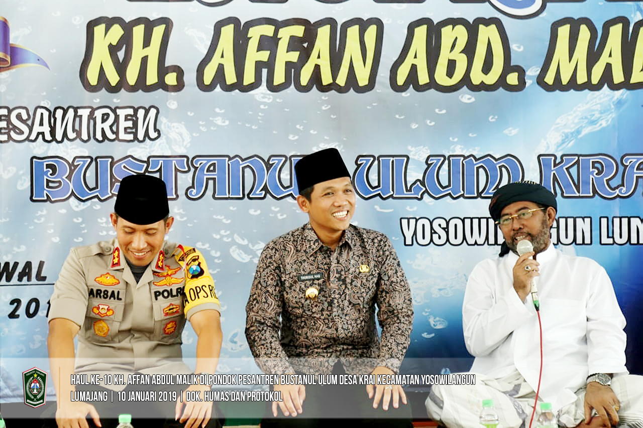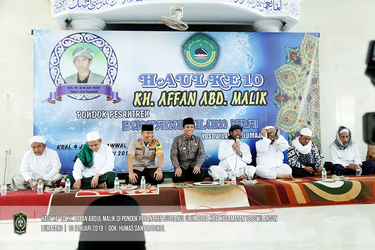 Hal tersebut disampaikannya kepada masyarakat saat menghadiri acara Haul ke-10 KH. Affan Abdul Malik, bertempat di Pondok Pesantren Bustanul Ulum Desa Krai Kecamatan Yosowilangun Kabupaten Lumajang, Kamis (10/1/2019) siang.