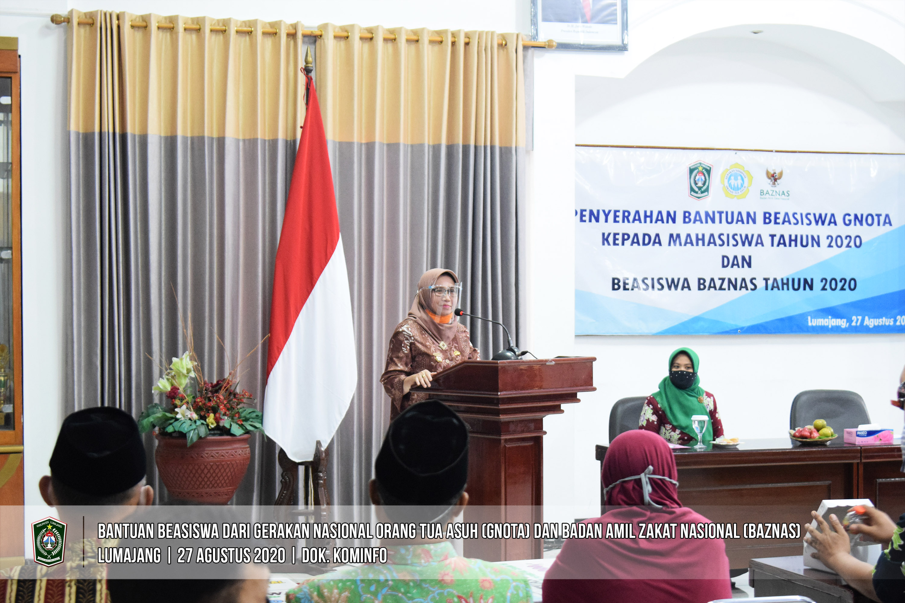 Wakil Bupati Lumajang, Indah Amperawati menyerahkan sejumlah bantuan beasiswa dari Gerakan Nasional Orang Tua Asuh (GNOTA) dan Badan Amil Zakat Nasional (BAZNAS) di Panti PKK Kabupaten Lumajang, Kamis (27/8/2020).