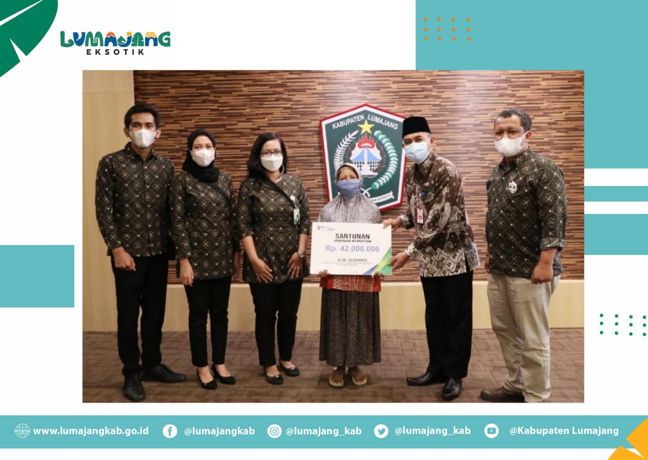 Sekretaris Daerah (Sekda) Kabupaten Lumajang, Agus Triyono menyerahkan santunan kematian dari BPJAMSOSTEK kepada ahli waris Pegawai Tidak Tetap (PTT) Kelurahan Kepuharjo atas nama Subandi, yang meninggal dunia. Santunan kematian tersebut diserahkan di Lobby Kantor Bupati Lumajang, Kamis (4/2/2021) siang.