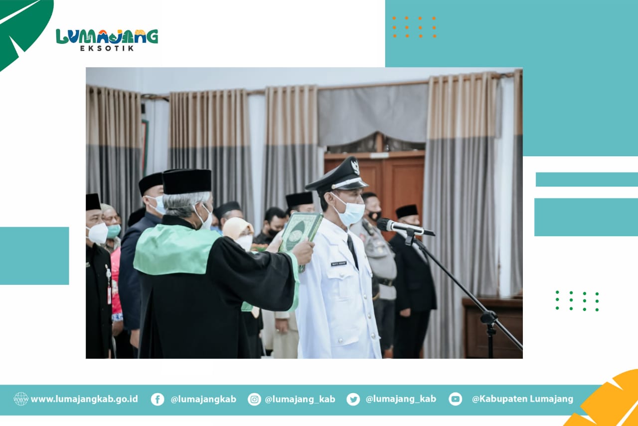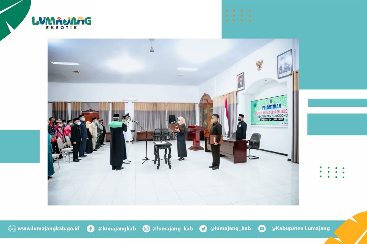 Wakil Bupati Lumajang, Indah Amperawati melantik dan mengambil sumpah jabatan, Wahyu Hidayat, sebagai Penjabat (Pj) Kepala Desa Selokbesuki, Kecamatan Sukodono Kabupaten Lumajang, bertempat di Aula Panti PKK Kabupaten Lumajang, Selasa (16/2/2021)