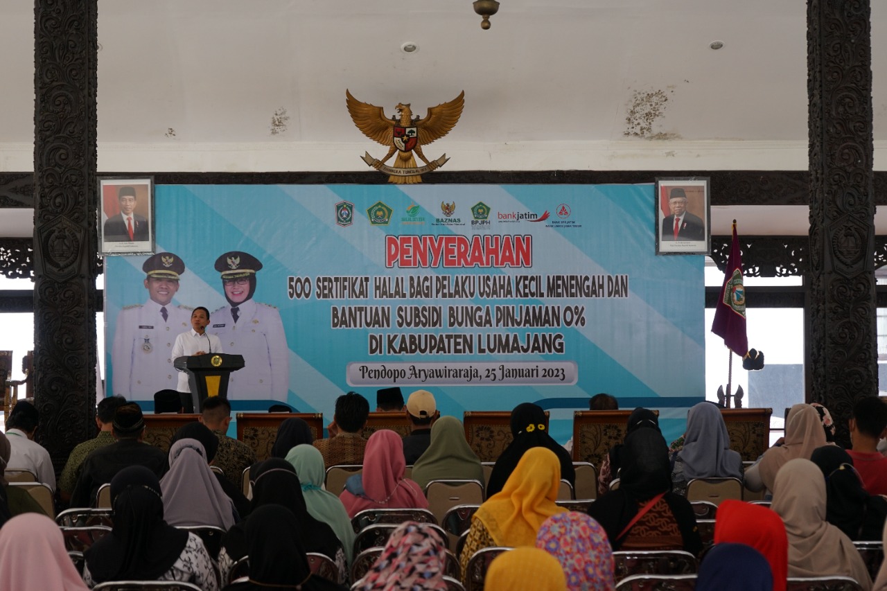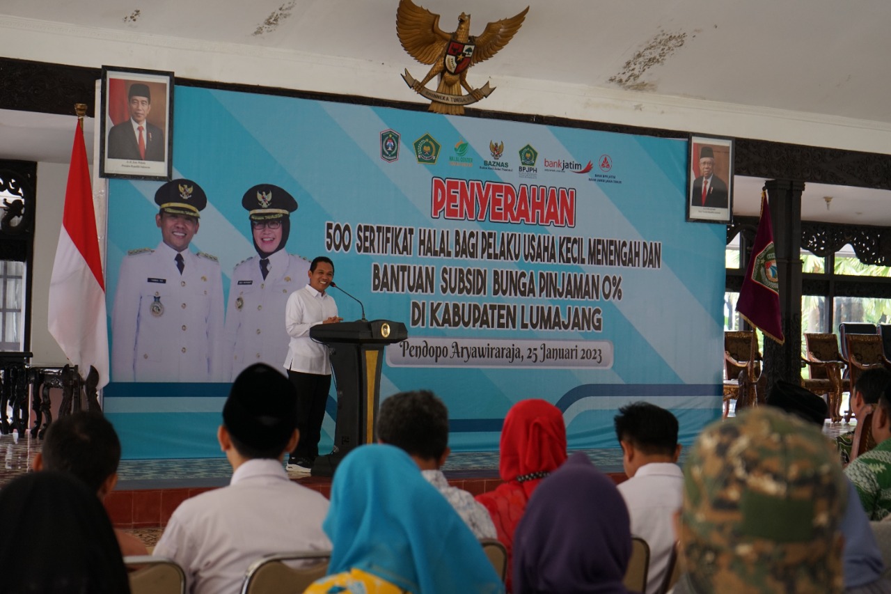 Hal tersebut disampaikan oleh Bupati Lumajang Thoriqul Haq (Cak Thoriq) saat menyerahkan sertifikat halal secara simbolis bagi Pelaku UMKM dan Pencairan Pinjaman Modal Usaha Tanpa Bunga, bertempat di Pendopo Arya Wiraraja Lumajang, Rabu (25/1/2023).