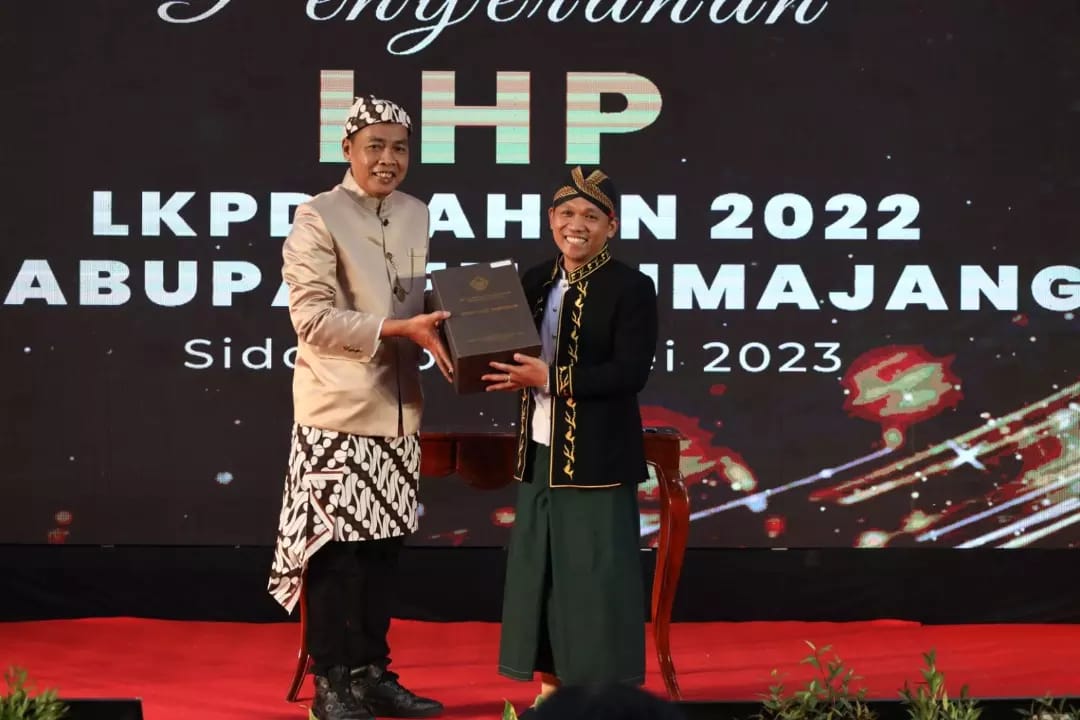 Bupati Lumajang, Thoriqul Haq bersama Ketua DPRD Kabupaten Lumajang, Eko Adis Prayoga menerima penghargaan Opini Wajar Tanpa Pengecualian (WTP) dari Badan Pemeriksa Keuangan Perwakilan Jawa Timur di Kantor BPKP Jatim Sidoarjo, Kamis (25/5/2023).