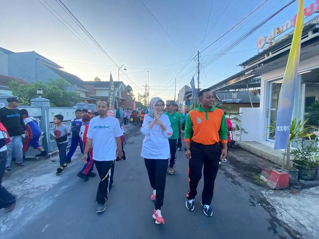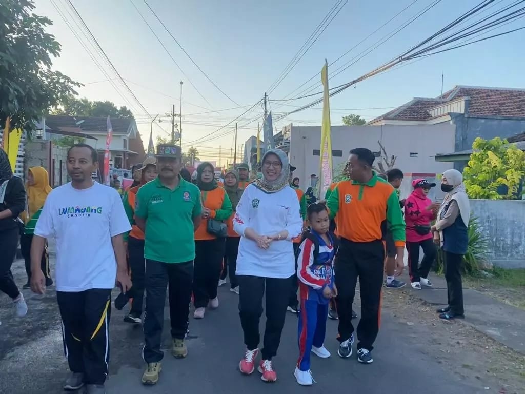 Wakil Bupati Lumajang Indah Amperawati (Bunda Indah) memberangkatkan peserta jalan santai dalam rangka Menggempur Rokok Ilegal, di Desa Karangsari Kecamatan Sukodono Kabupaten Lumajang, Jawa Timur, Minggu (28/5/2023).