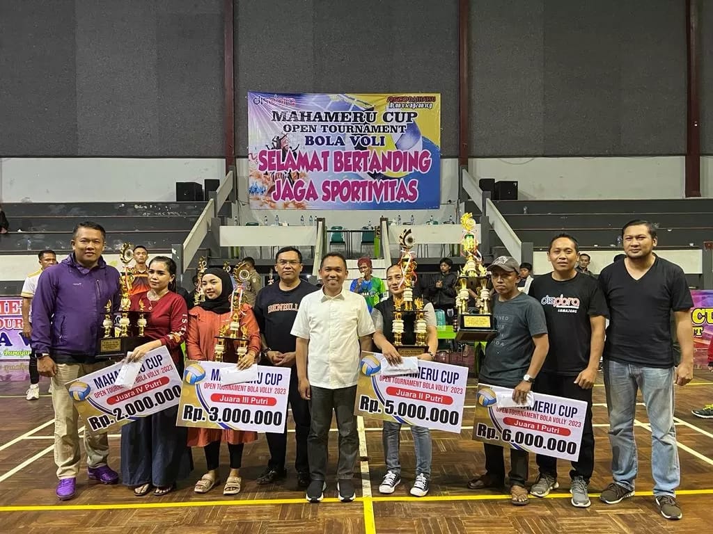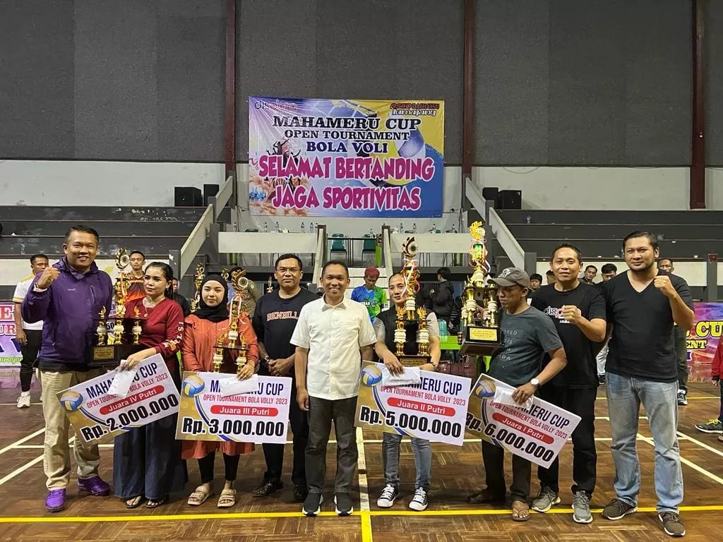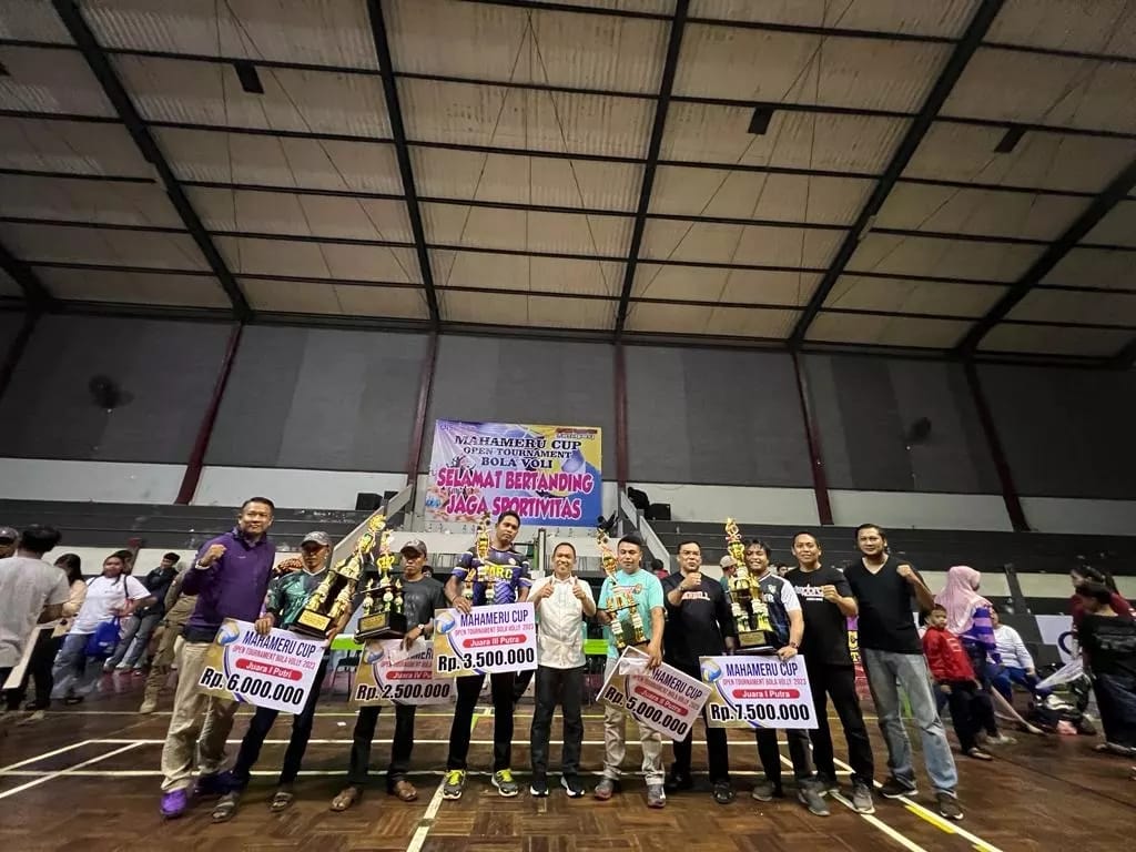 Bupati Lumajang, Thoriqul Haq (Cak Thoriq) menyerahkan penghargaan kepada para klub pemenang Open Turnamen Bola Voli Mahameru Cup 2023, di GOR Wira Bhakti, Sabtu (10/6/2023) malam.