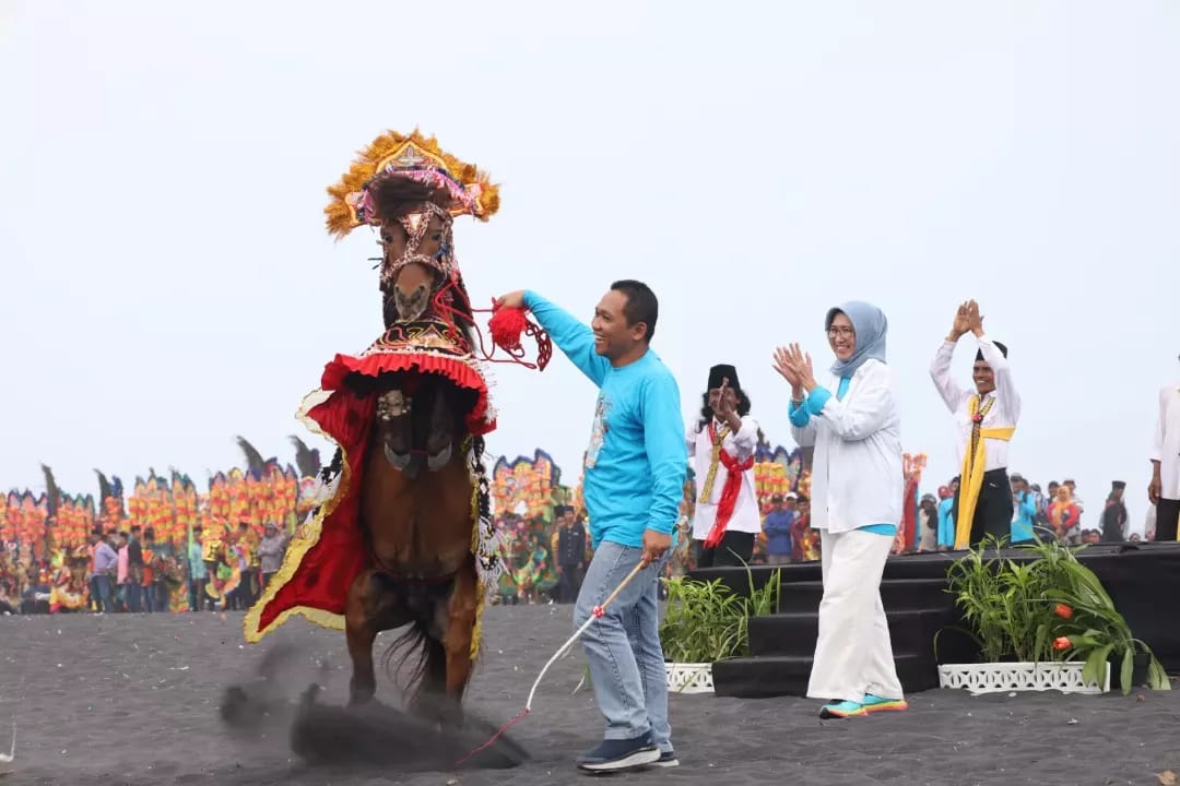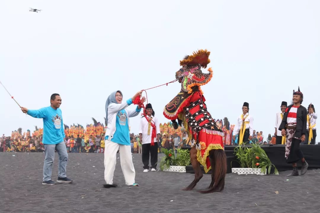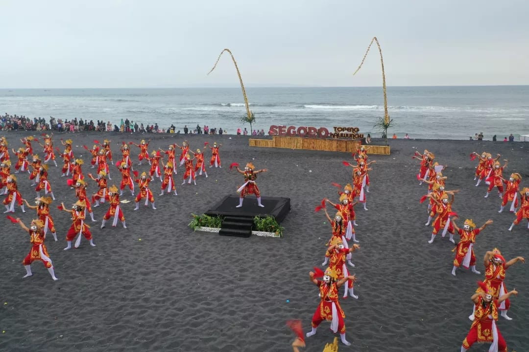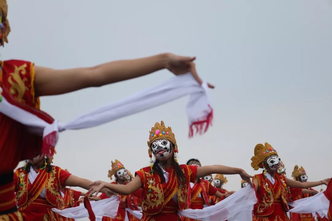 Sebanyak 500 penari Topeng Kaliwungu dan 50 Jaran Kencak memberikan suguhan pertunjukan spektakuler pada gelaran South Beach Festival Segoro Topeng Kaliwungu, yang diselenggarakan di Pantai Watu Pecak Kabupaten Lumajang, Minggu (25/6/2023).