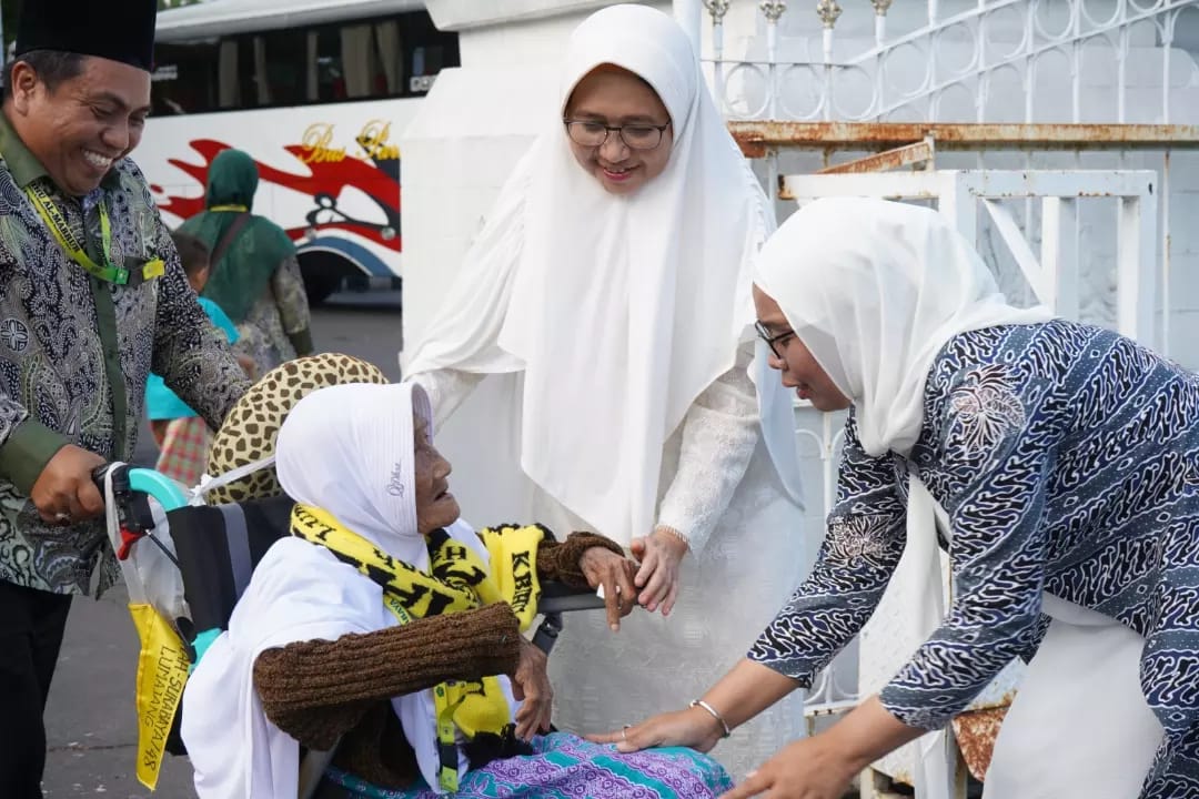 Saat penyambutan tersebut, Bunda Indah ikut menyapa secara langsung jamaah haji yang datang dengan mengucapkan selamat datang kepada jamaah haji yang telah menyelesaikan ibadah haji dari Baitullah.