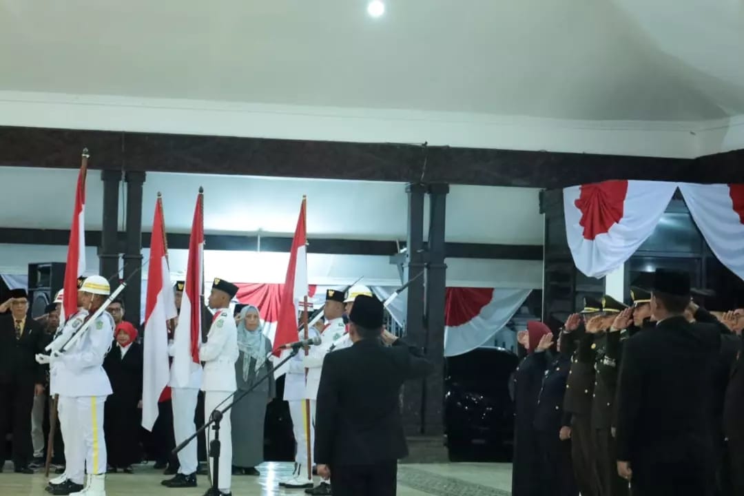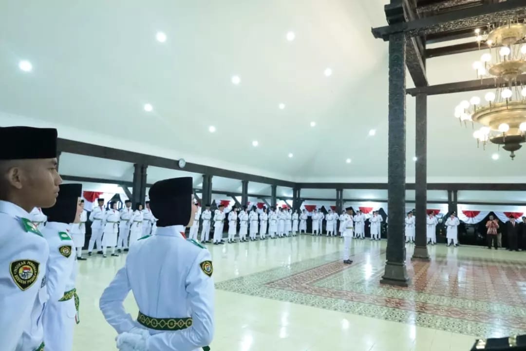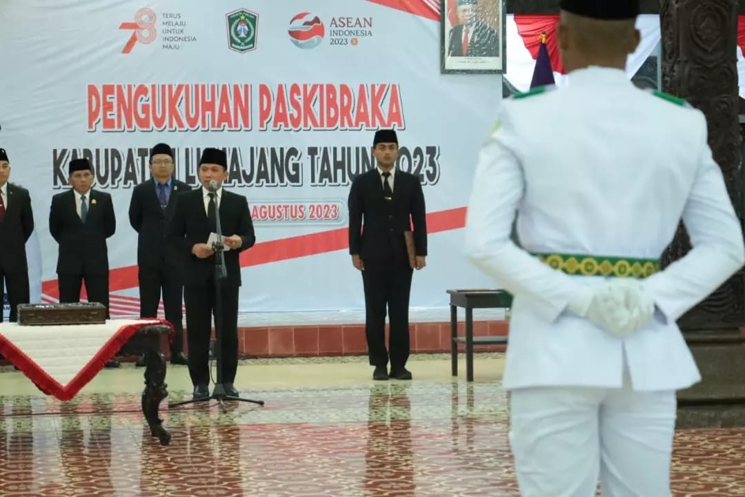 Putra-Putri terbaik Kabupaten Lumajang yang terpilih menjadi calon Pasukan Pengibar Bendera Merah Putih (PASKIBRAKA) dikukuhkan menjadi Paskibraka Kabupaten Lumajang Tahun 2023 oleh Bupati Lumajang, Thoriqul Haq, di Pendopo Arya Wiraraja Lumajang, Selasa (15/8/2023) malam.