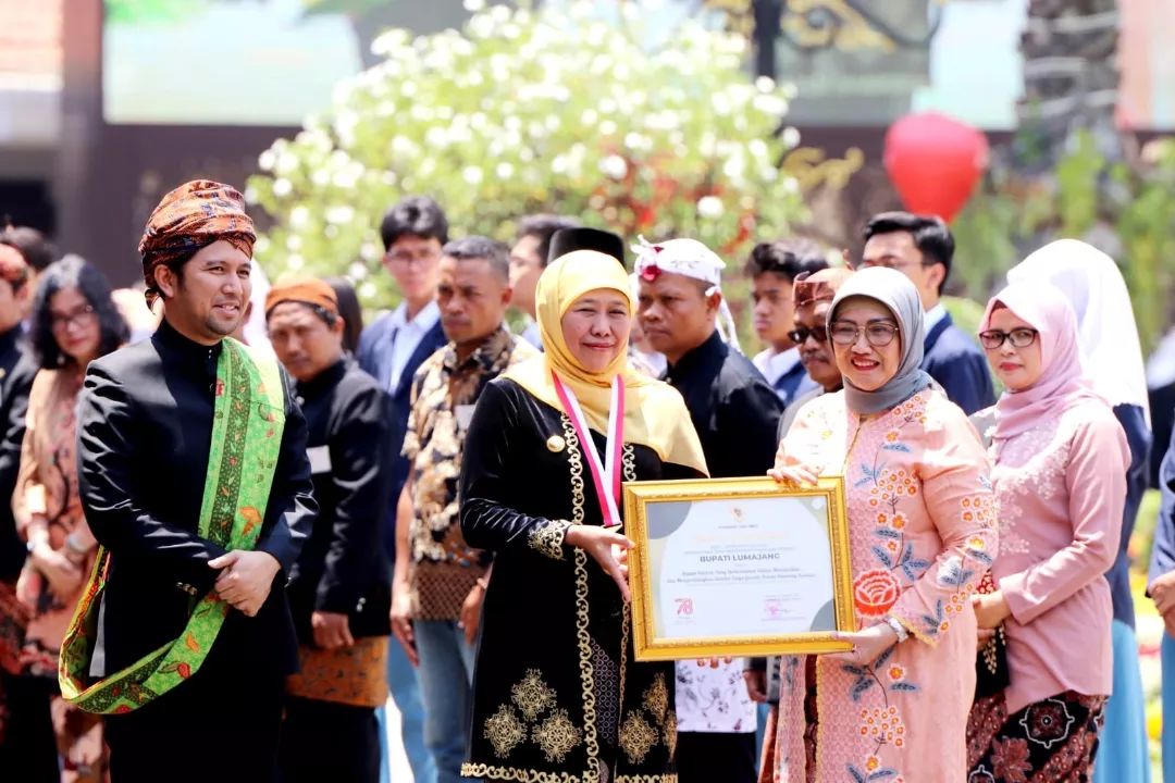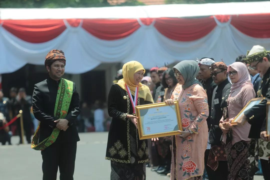 Penghargaan tersebut diterimakan kepada Penjabat (Pj). Bupati Lumajang, Indah Wahyuni (Yuyun) dalam puncak acara Peringatan Hari Jadi ke-78 Provinsi Jawa Timur, yang bertempat di Halaman Gedung Negara Grahadi Surabaya, Kamis (12/10/2023).