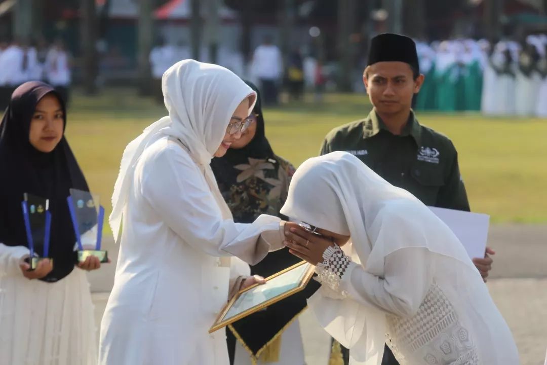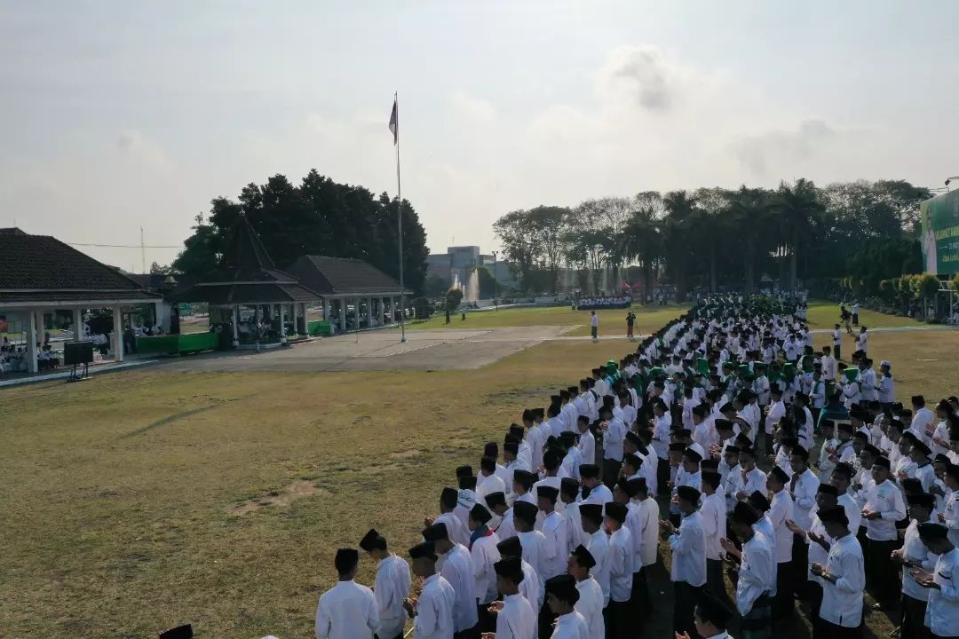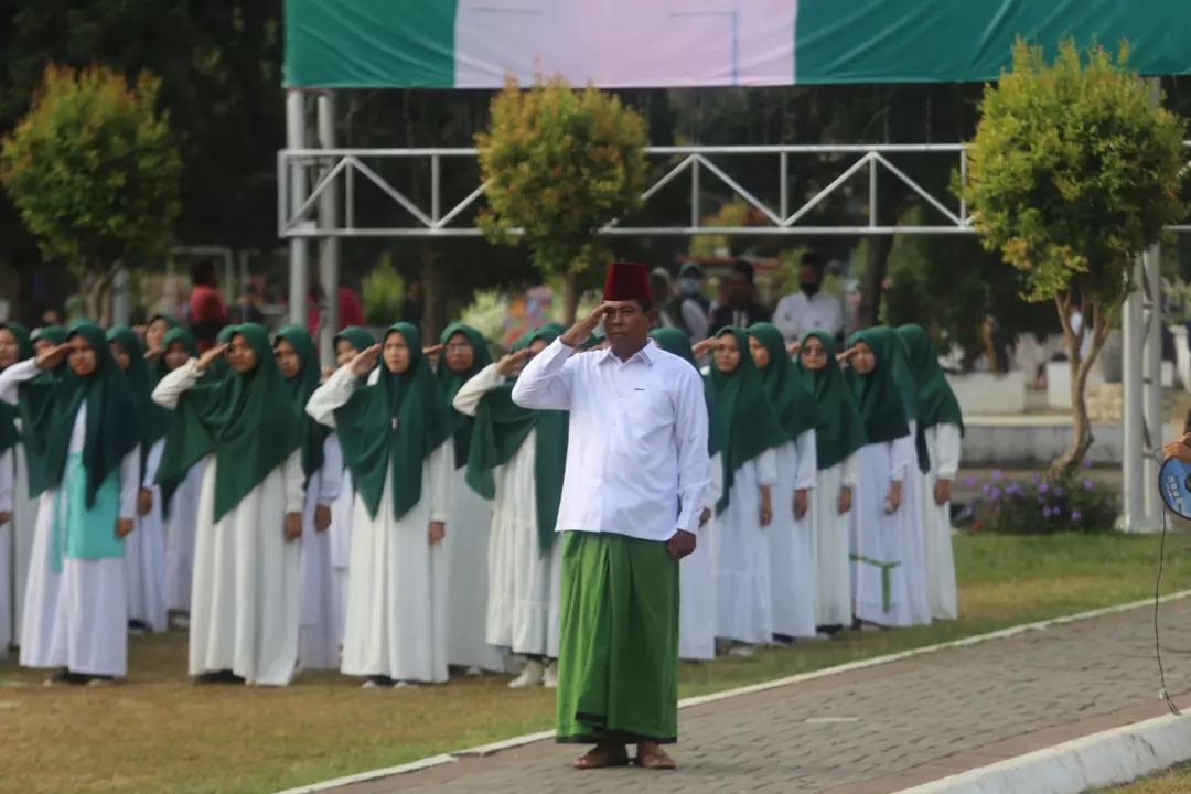 Pj. Bupati Lumajang, Indah Wahyuni bersama jajaran Forkopimda Kabupaten Lumajang mengikuti Apel Hari Santri ke - VIII Tahun 2023 secara virtual, di Alun-Alun Kabupaten Lumajang, Minggu (22/10/2023) pagi.