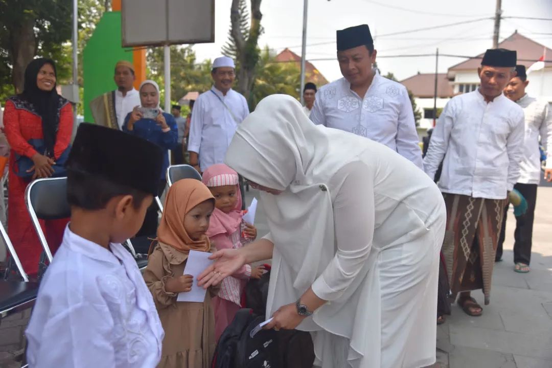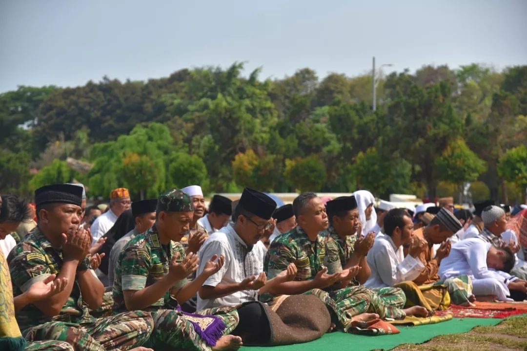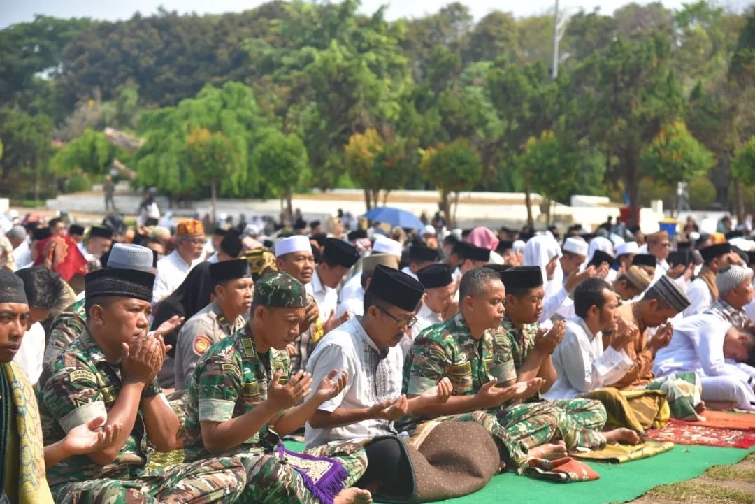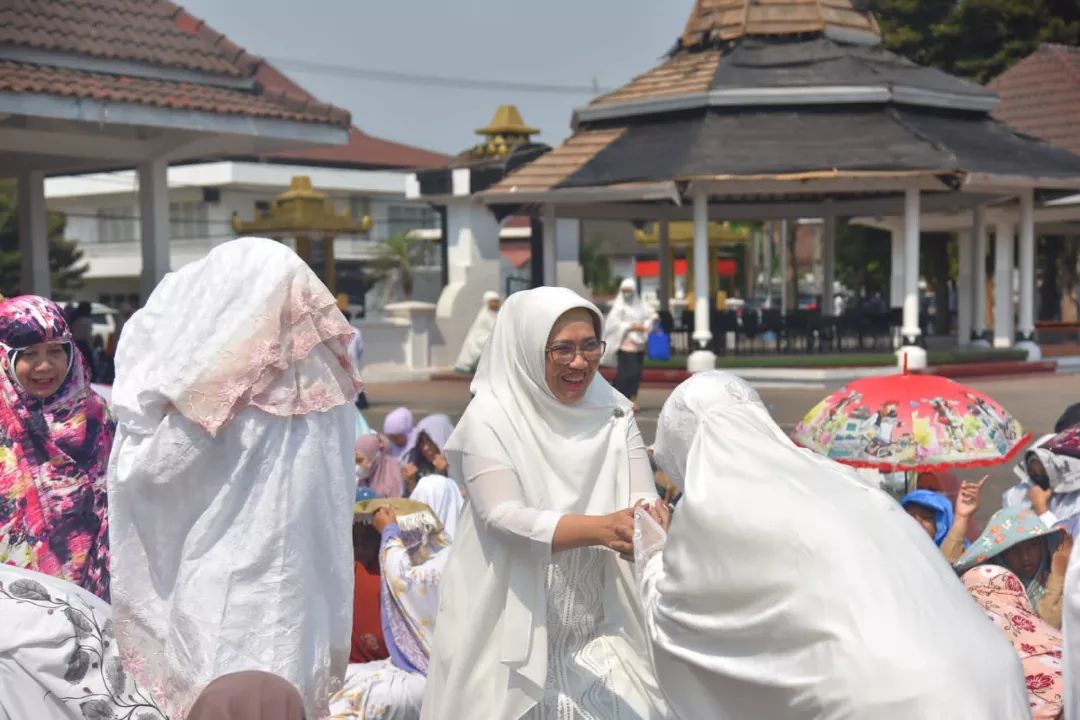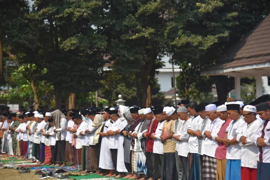 Masyarakat Lumajang disertai jajaran pemerintah daerah, mengerjakan Salat Istisqa secara berjamaah, di Alun-alun Lumajang, Jumat (27/10/2023).