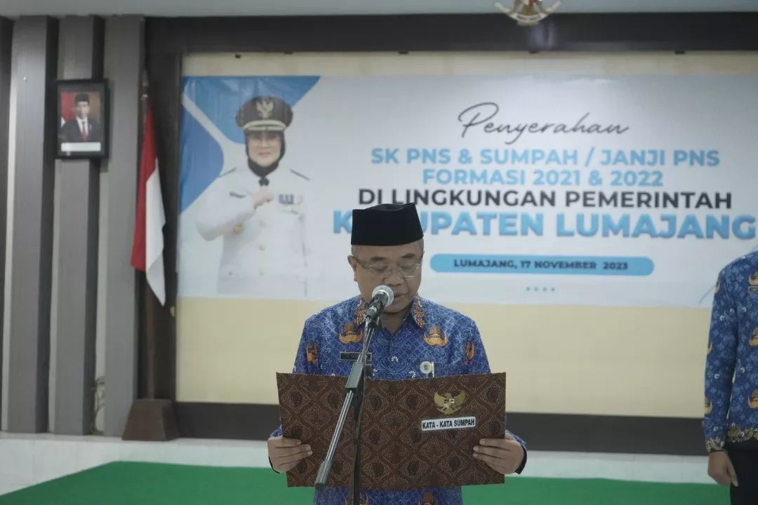 Pemerintah Kabupaten (Pemkab) Lumajang melaksanakan pengambilan sumpah/janji PNS dan menyerahkan SK PNS terhadap 112 PNS formasi 2021 dan 2022 di Lingkungan Pemerintah Kabupaten Lumajang, bertempat di Graha Nagara Bhakti Kantor BKD Kabupaten Lumajang, Jumat (17/11/2023) pagi.