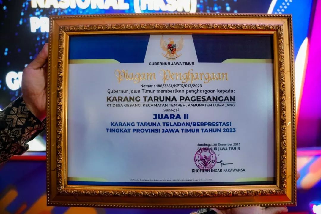 Satu lagi penghargaan diterima Kabupaten Lumajang di penghujung tahun 2023. Kamis (21/12/2023), Karang Taruna Pagesangan Kabupaten Lumajang berhasil menjadi terbaik kedua Karang Taruna Berprestasi Tingkat Provinsi Jawa Timur.