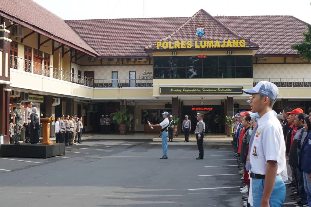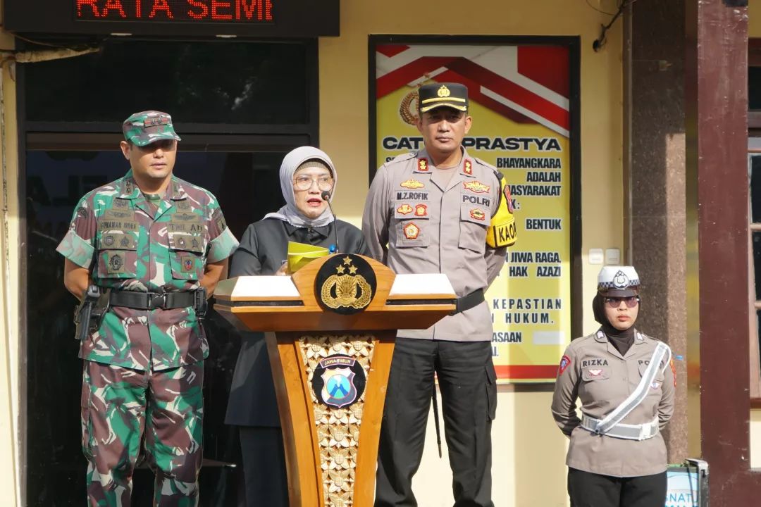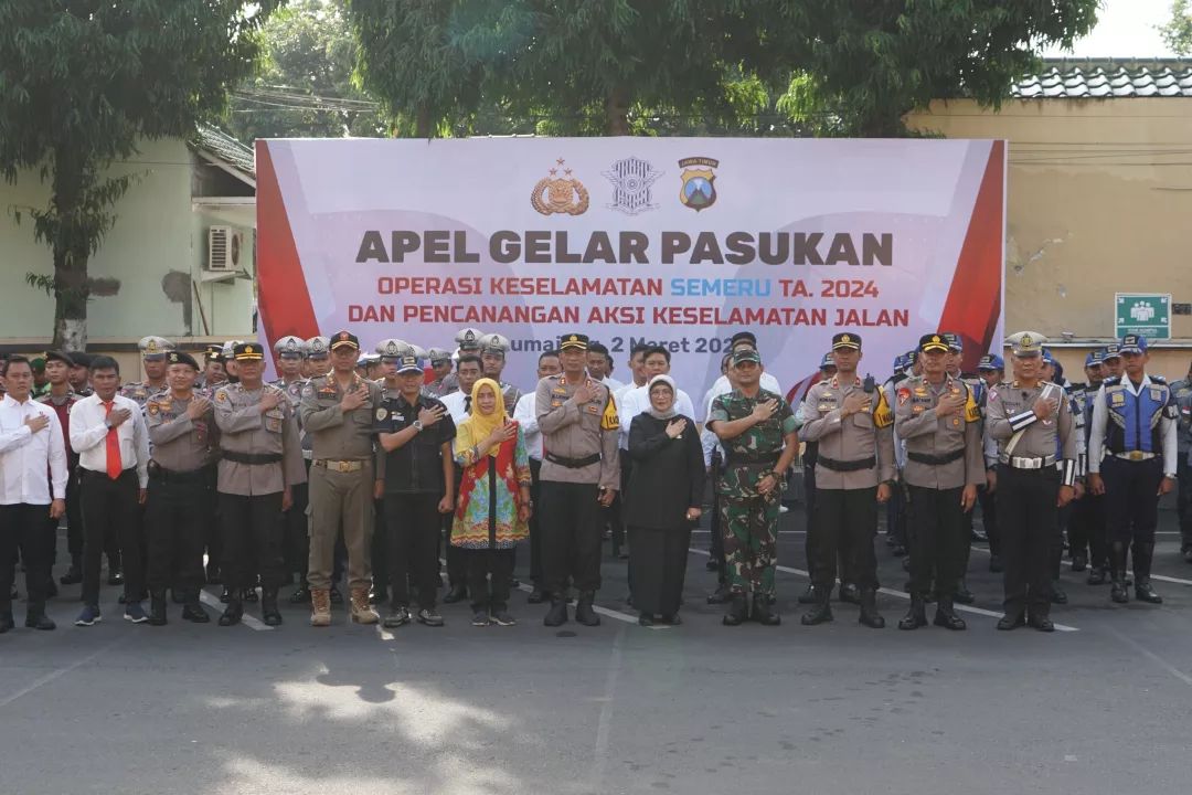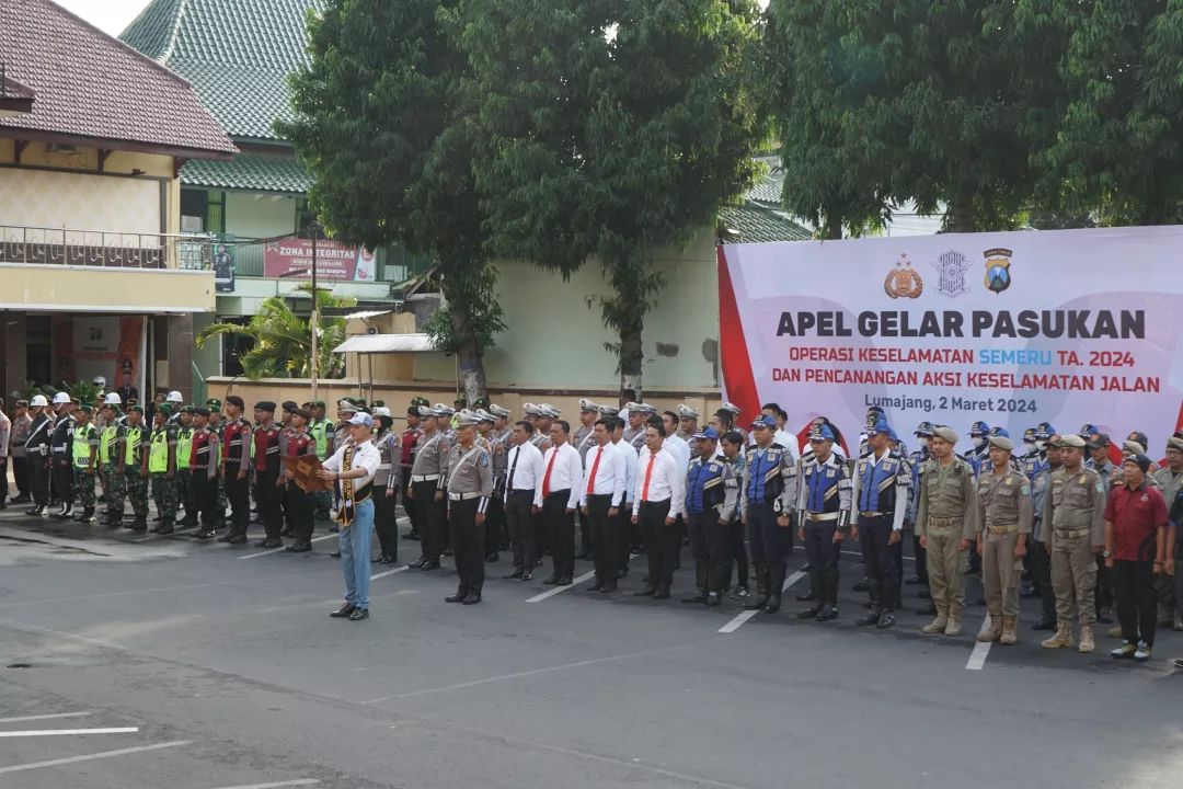 Pj. Bupati Lumajang, Indah Wahyuni (Yuyun) memimpin apel Operasi Keselamatan Semeru 2024 di Halaman Mapolres Lumajang, Sabtu (2/3/2024). Dalam kesempatan tersebut, ia menegaskan pentingnya menjaga ketertiban lalu lintas sebagai upaya mengurangi angka kecelakaan.