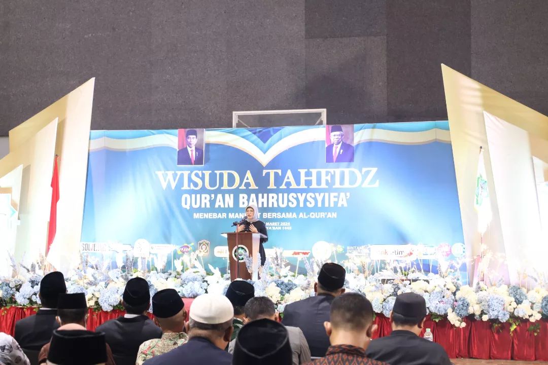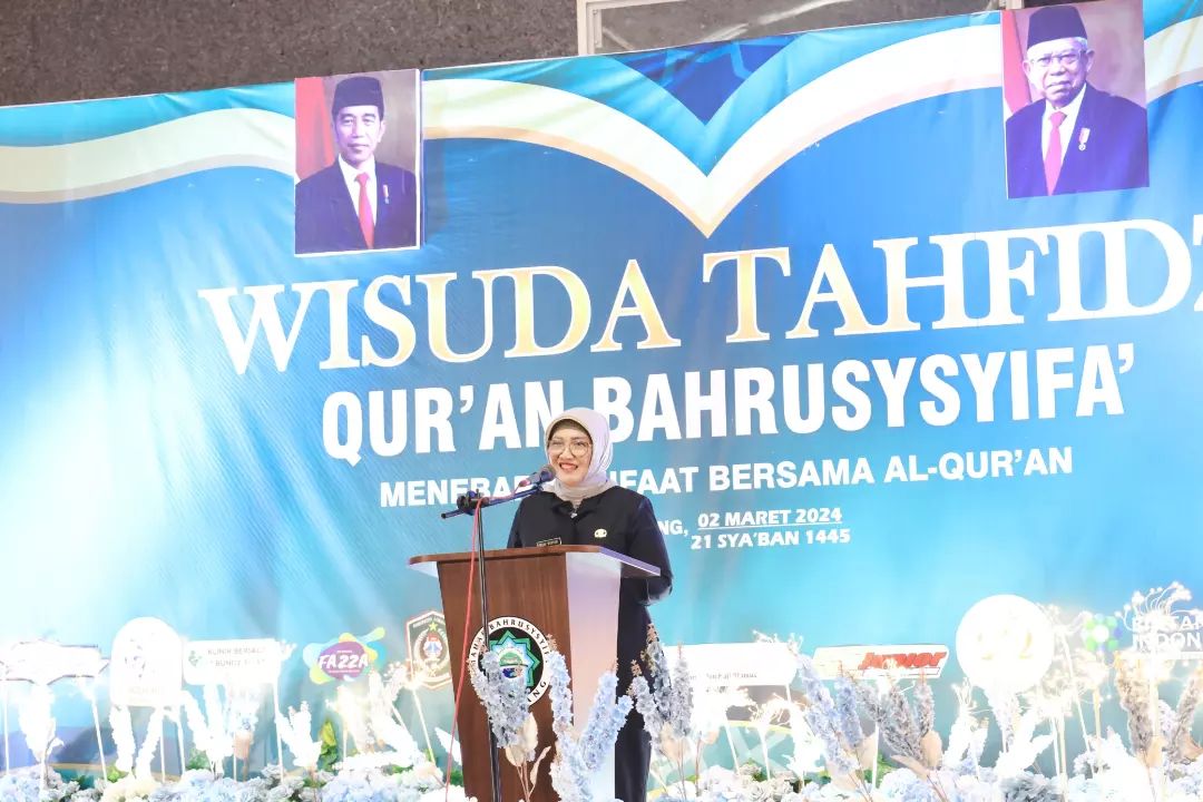 Dalam Acara Wisuda Tahfidz Qur'an Bahrusysyifa' di GOR Wira Bhakti Lumajang, Sabtu (2/3/2024), Pj. Bupati Lumajang, Indah Wahyuni (Yuyun), menyampaikan pesan penting kepada generasi muda tentang pentingnya meningkatkan keimanan dan ketakwaan sebagai benteng melawan ancaman narkoba.