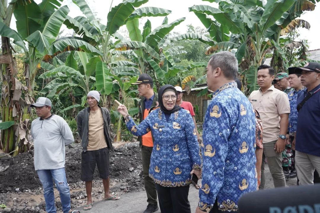 Pj. Bupati Lumajang Indah Wahyuni (Yuyun) turun langsung untuk memantau proses penanganan dampak banjir yang melanda Dusun Rojobalen Desa Kloposawit Kecamatan Candipuro Kabupaten Lumajang, Jawa Timur, Kamis (25/4/2024).