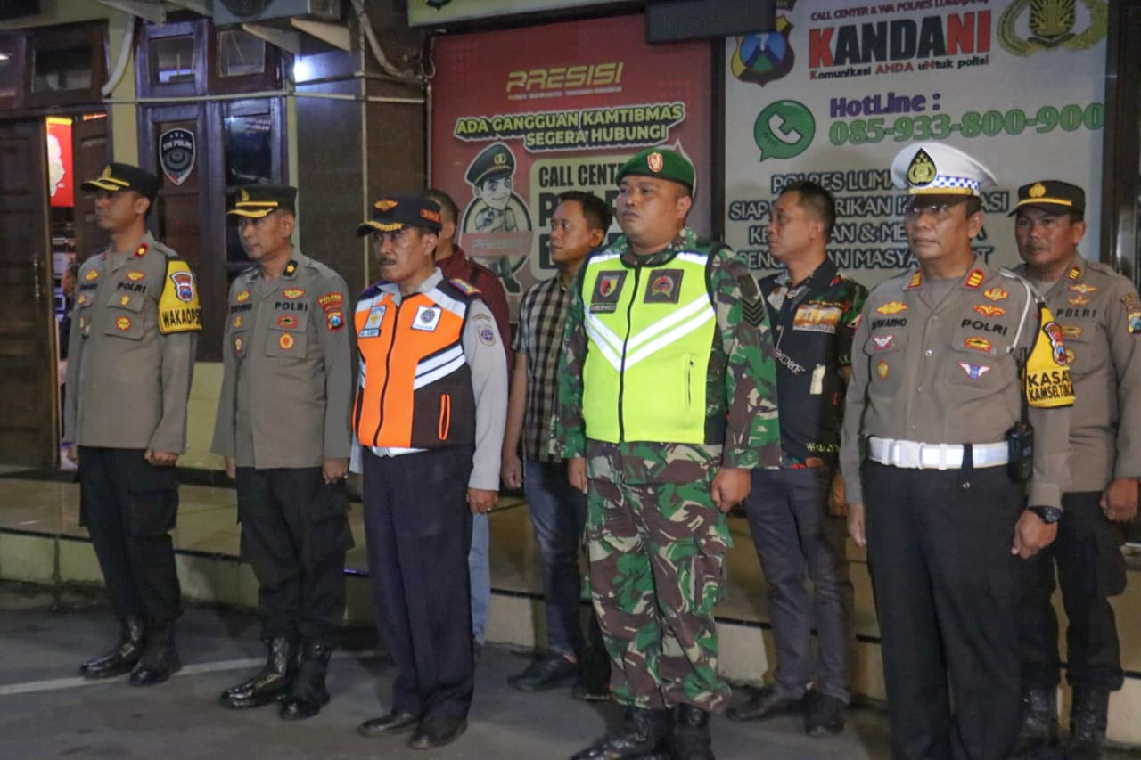 Personel gabungan tiga pilar Kabupaten Lumajang menggelar apel pengamanan malam takbir Hari Raya Iduladha 1445 H / 2024 M di wilayah Kabupaten Lumajang, pada Minggu (16/6/2024) malam.