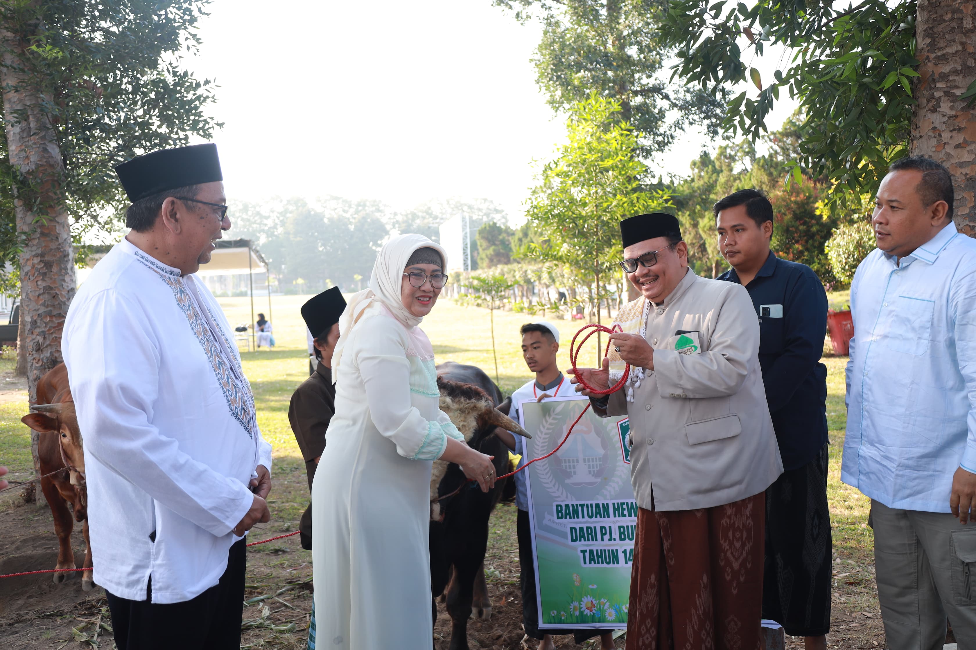 Penjabat (Pj.) Bupati Lumajang, Indah Wahyuni (Yuyun) menyerahkan bantuan secara simbolis tiga hewan kurban berupa sapi jenis limousin, di Alun-alun Lumajang, Senin (17/6/2024).