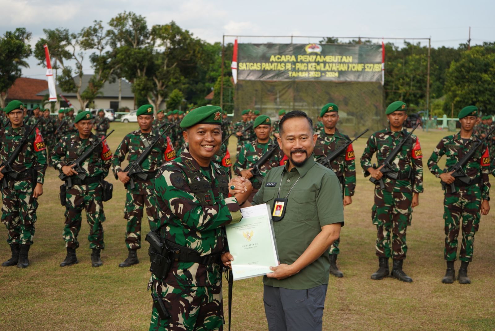 Pj. Bupati Lumajang bertindak sebagai inspektur upacara dalam acara menyambut Satuan Tugas Pamtas RI- Papua New Guine Yonif 527/Baladibya Yudha yang bertempat di Lapangan Pratu Natra Yonif 527/ Lumajang pada hari kamis tanggal 25/07/2024.