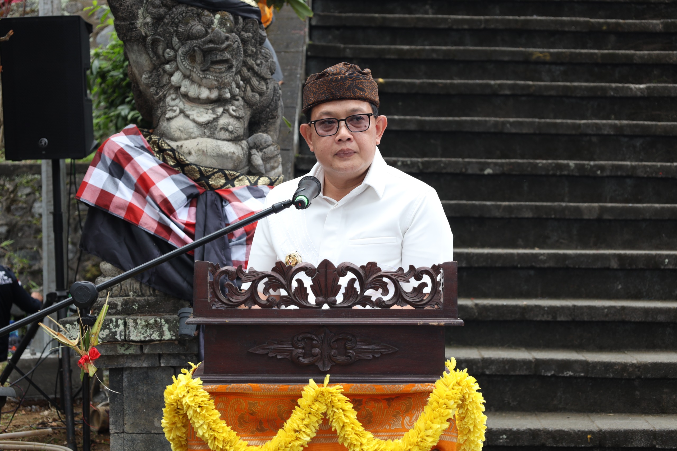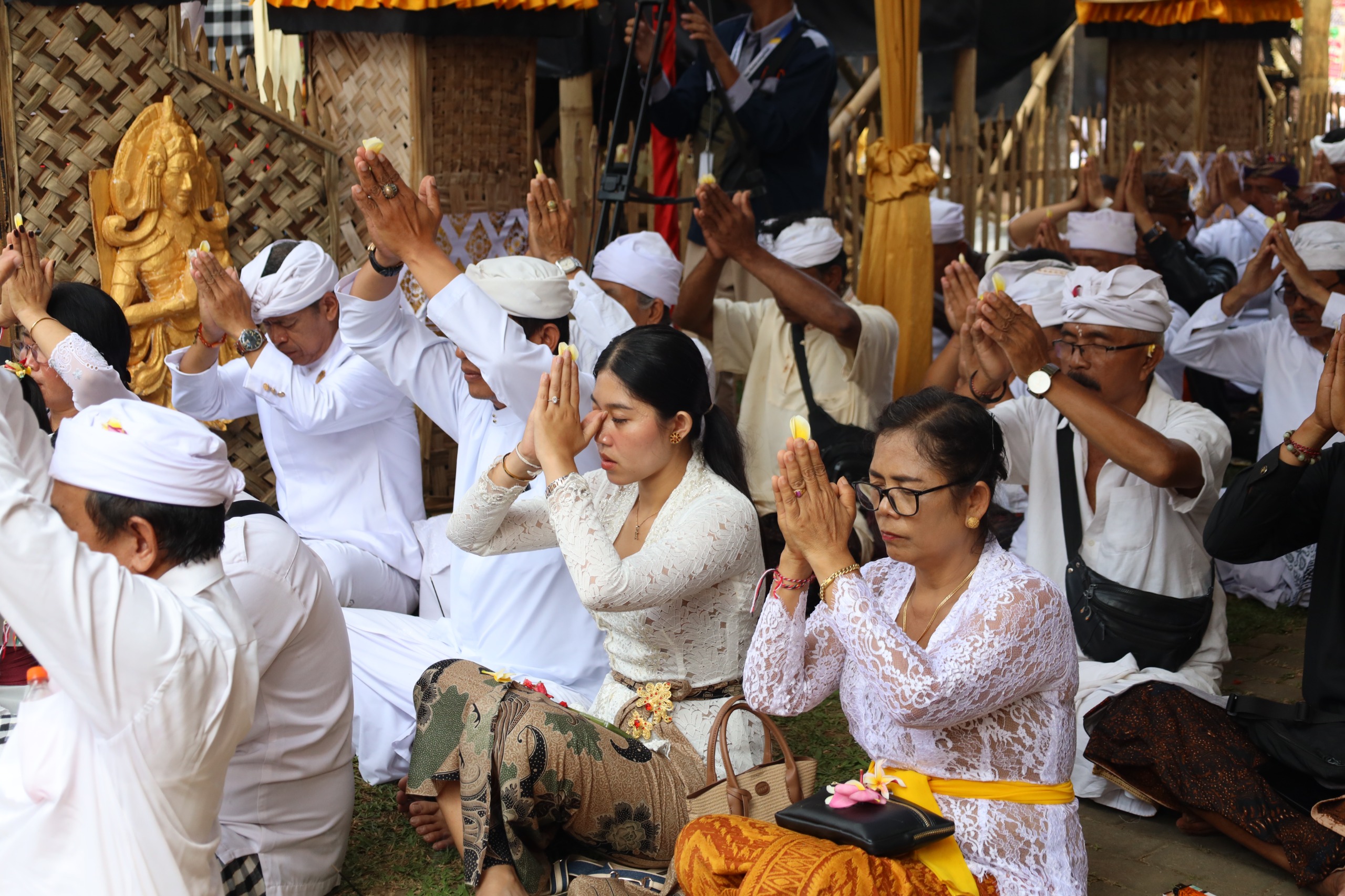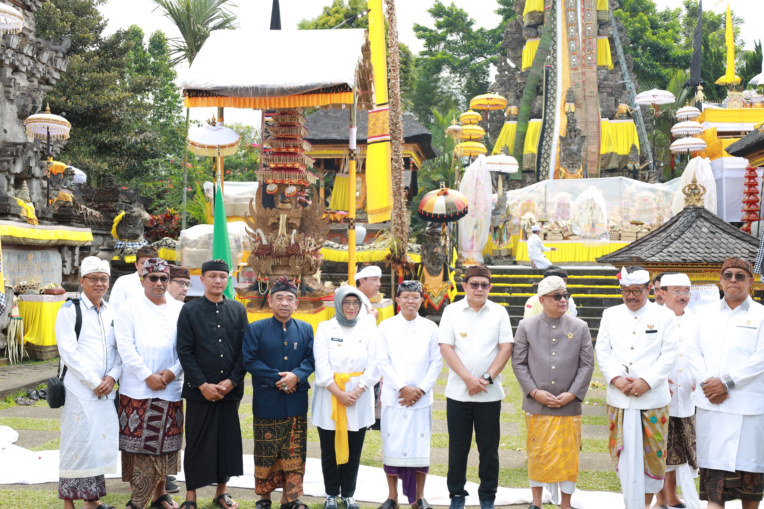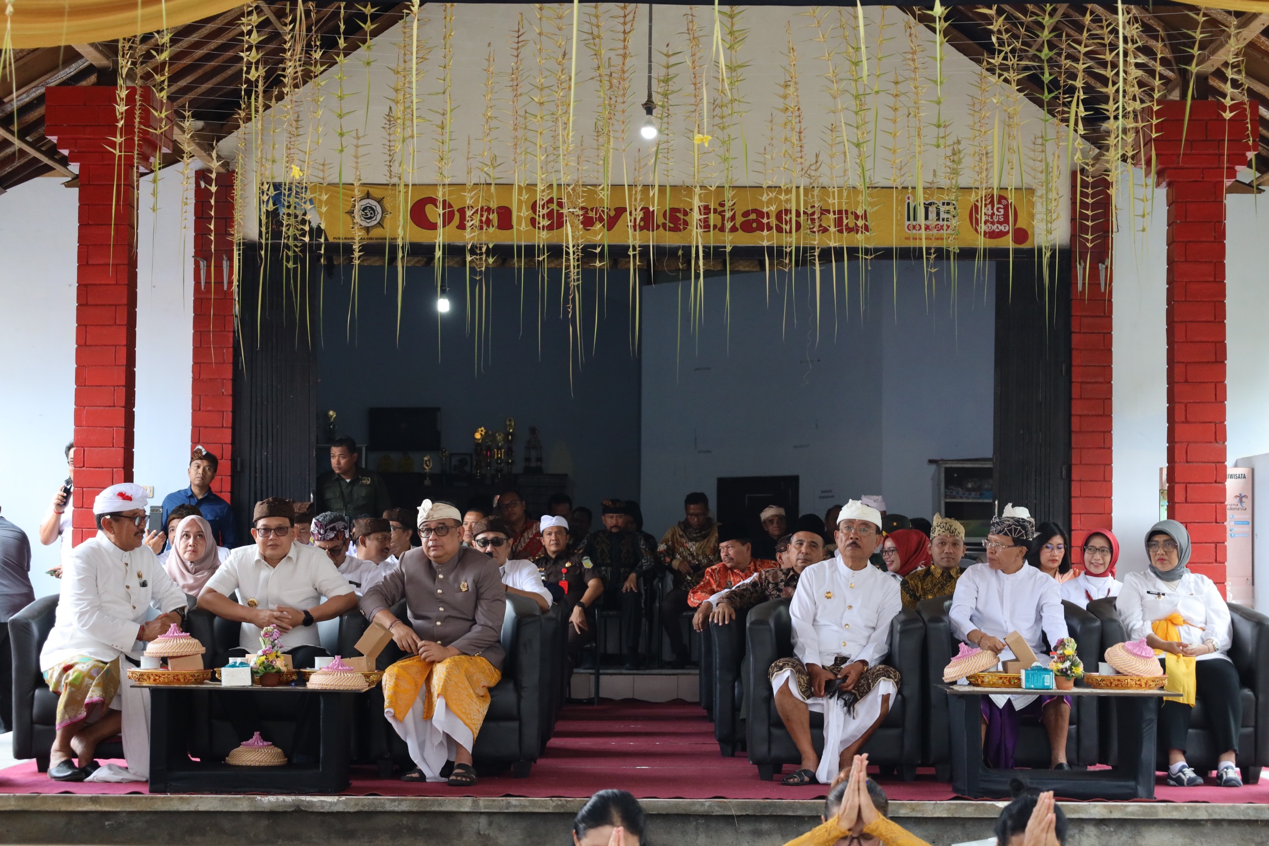 Pj. Bupati Lumajang, Indah Wahyuni menghadiri upacara Piodalan di Pura Mandara Giri Semeru Agung, yang berada di wilayah Kecamatan Senduro Kabupaten Lumajang, Kamis (18/7/2024).