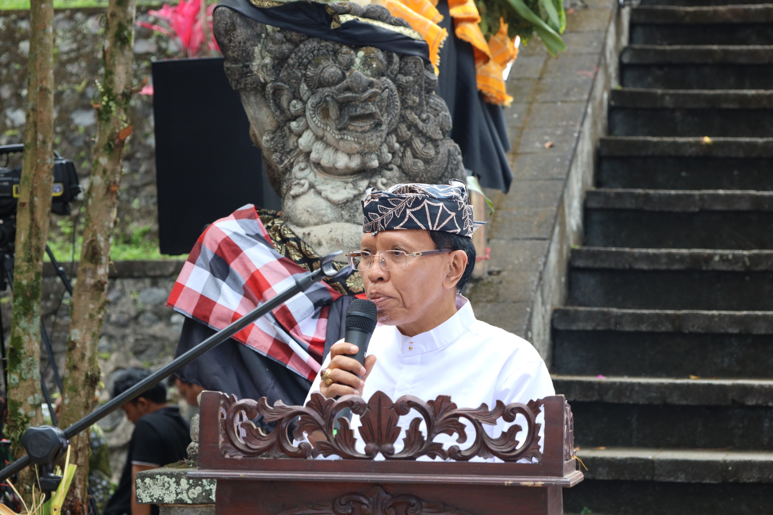 Pj. Bupati Lumajang, Indah Wahyuni menghadiri upacara Piodalan di Pura Mandara Giri Semeru Agung, yang berada di wilayah Kecamatan Senduro Kabupaten Lumajang, Kamis (18/7/2024).