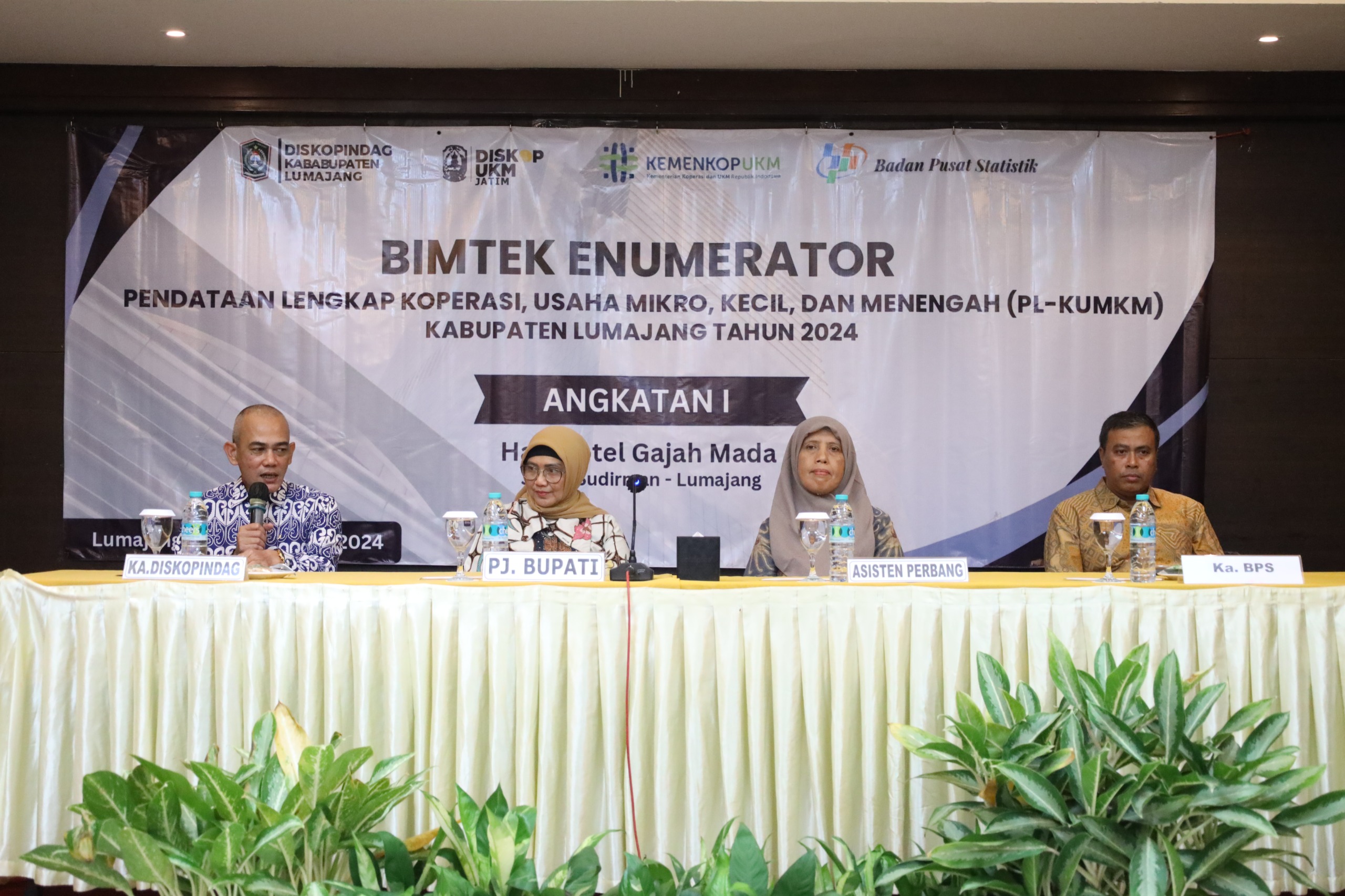 Pendataan Lengkap Enumerator wujudkan satu data koperasi, usaha mikro, kecil dan menengah. Hal itu disampaikan Pj. Bupati Lumajang, Indah Wahyuni saat membuka Bimtek Enumerator Pendataan Lengkap Koperasi, Usaha Mikro, Kecil dan Menengah (PL-KUMKM) Angkatan I di Hall Arjuna Hotel Gajah Mada Lumajang, Sabtu (10-08-2024).
