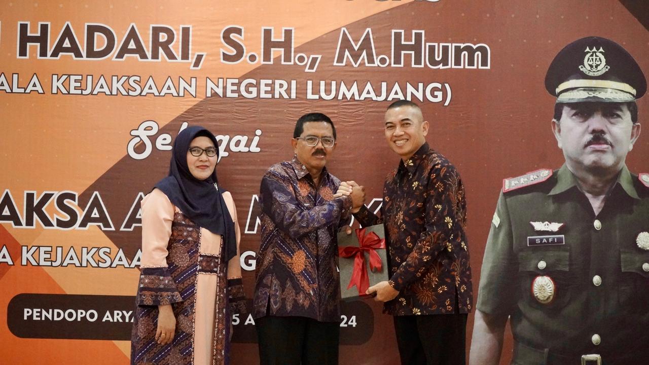 Pj Bupati Lumajang, Indah Wahyuni menghadiri acara Pengantar Alih Tugas Kepala Kejaksaan Negeri Lumajang, Safi Hadari sebagai Jaksa Ahli Madya Pada Kejaksaan Tinggi Jawa Timur, bertempat di Pendopo Arya Wiraraja Kabupaten Lumajang, Senin (5/8/2024) malam.