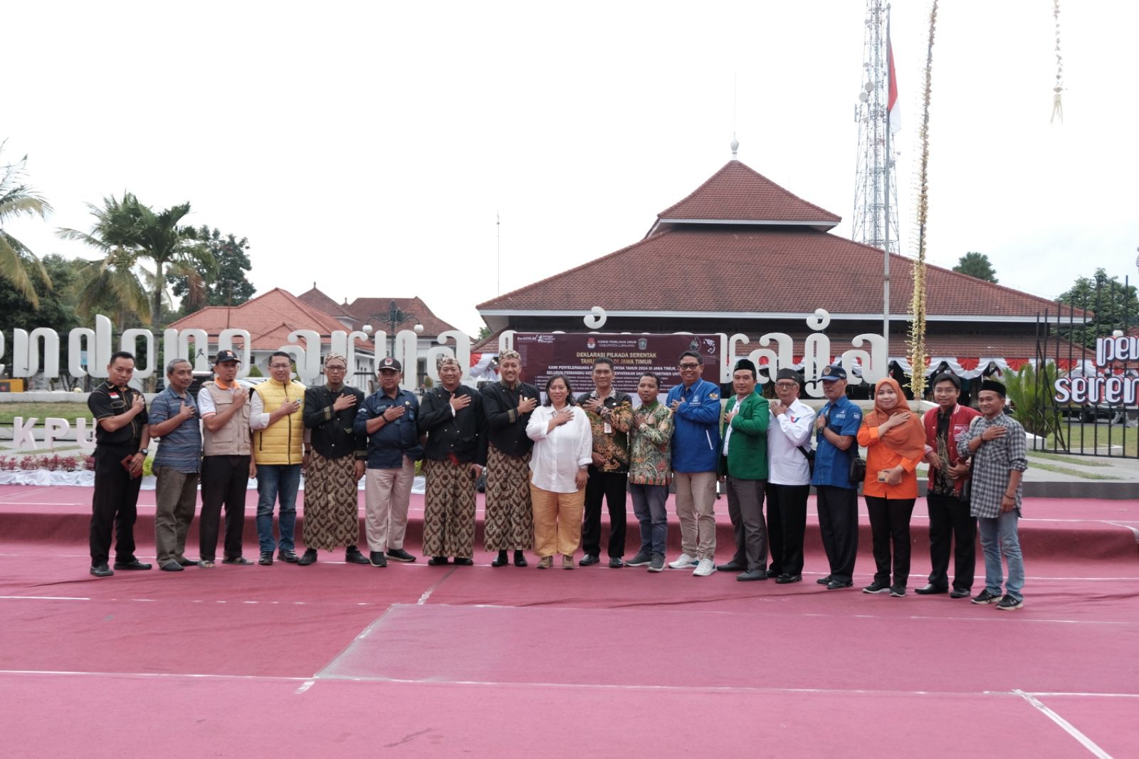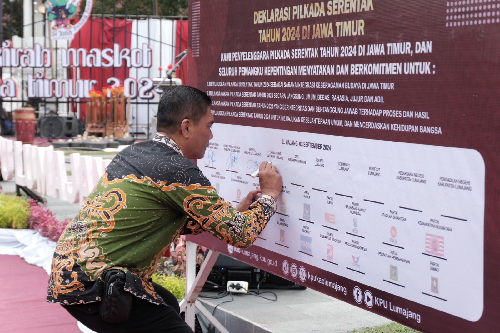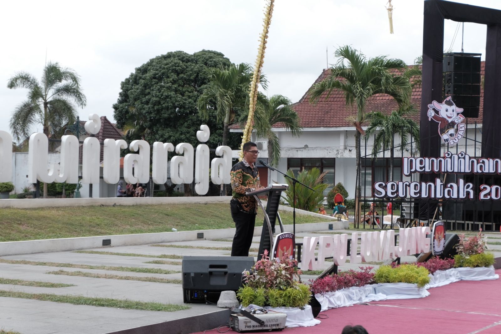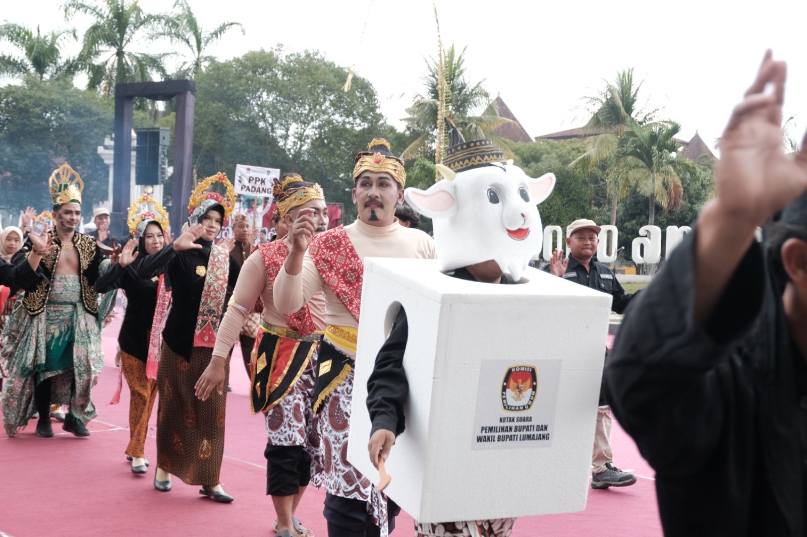 Kirab Maskot Pemilihan Kepala Daerah (Pilkada) Serentak Tahun 2024 Jawa Timur saat tiba di Alun-Alun Kabupaten Lumajang berhasil digelar dengan semarak, Selasa (3/9/2024). Kedatangan maskot tersebut disambut oleh jajaran KPU Kabupaten Lumajang beserta Forkopimda Kabupaten Lumajang.