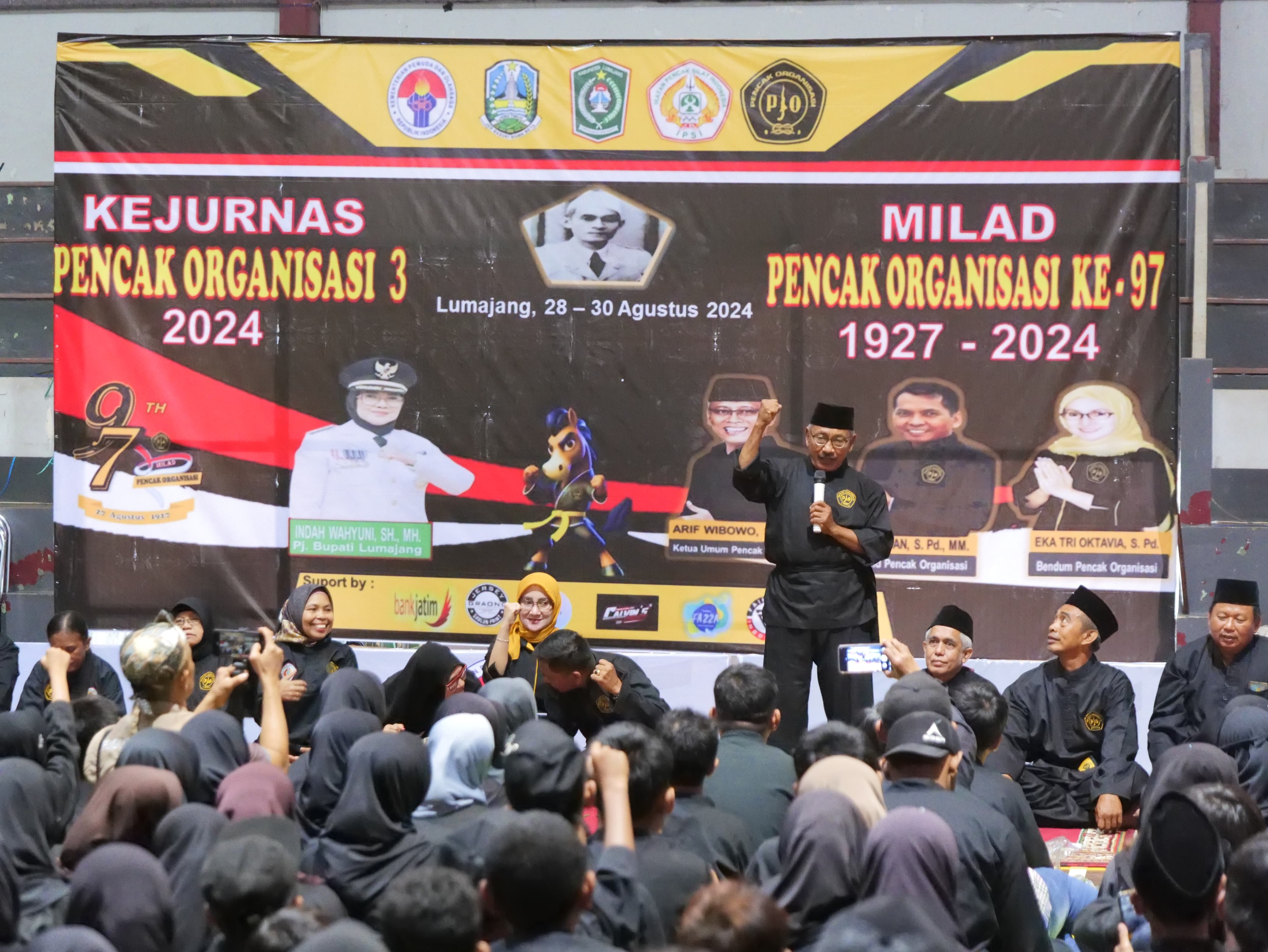 "Seluruh atlet yang berkumpul pagi hari ini dari seluruh Indonesia, hari ini kita berdoa bersama wujud syukur sudah 97 tahun Pencak Organisasi berdiri, tidak terasa 97 tahun PO didirikan oleh Majend Imam Suja'i," ujar H. Bukasan, Sekjen Pencak Organisasi (PO) Indonesia saat Tasyakuran Milad 97 PO di GOR Wirabhakti Lumajang, Selasa (27/08/2024).