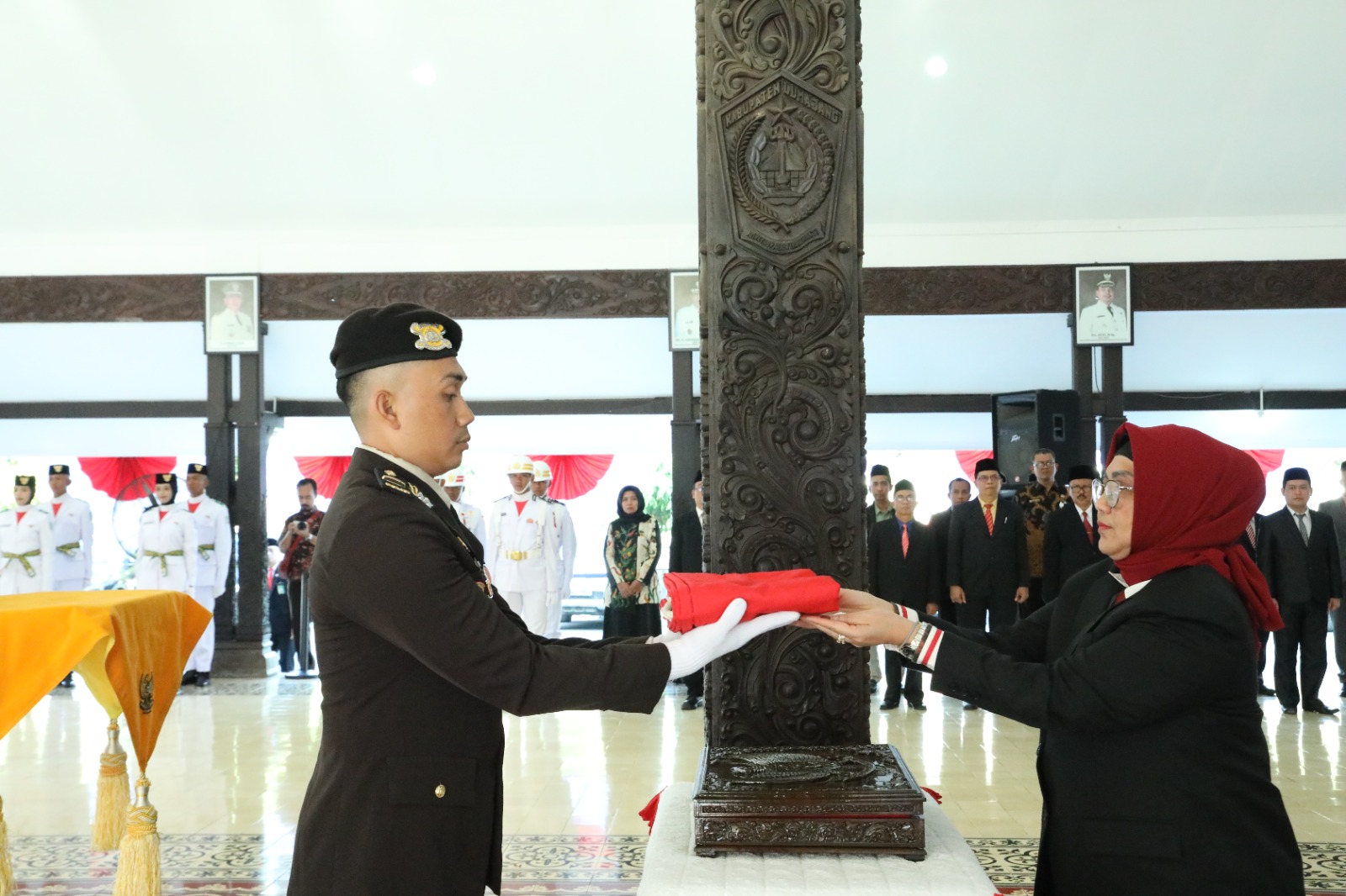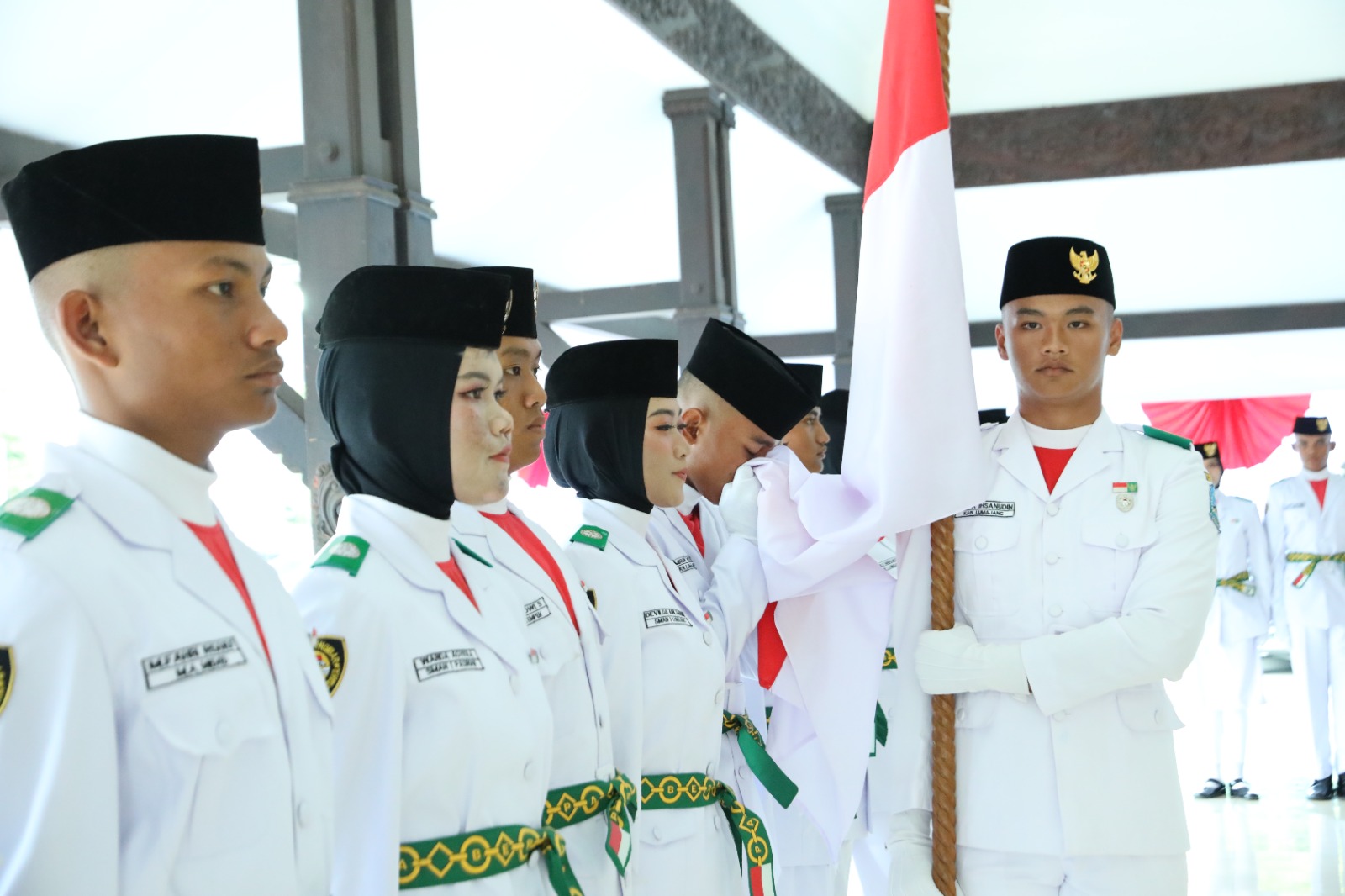 Indah Wahyuni Pj. Bupati Lumajang Kukuhkan 75 Calon Pasukan Pengibar Bendera Merah Putih (PASKIBRAKA) Kabupaten Lumajang Tahun 2024 dengan tema Nusantara Baru Indonesia Maju yang bertempat di Pendopo Arya Wiraraja Lumajang, Kamis (15/8/2024).
