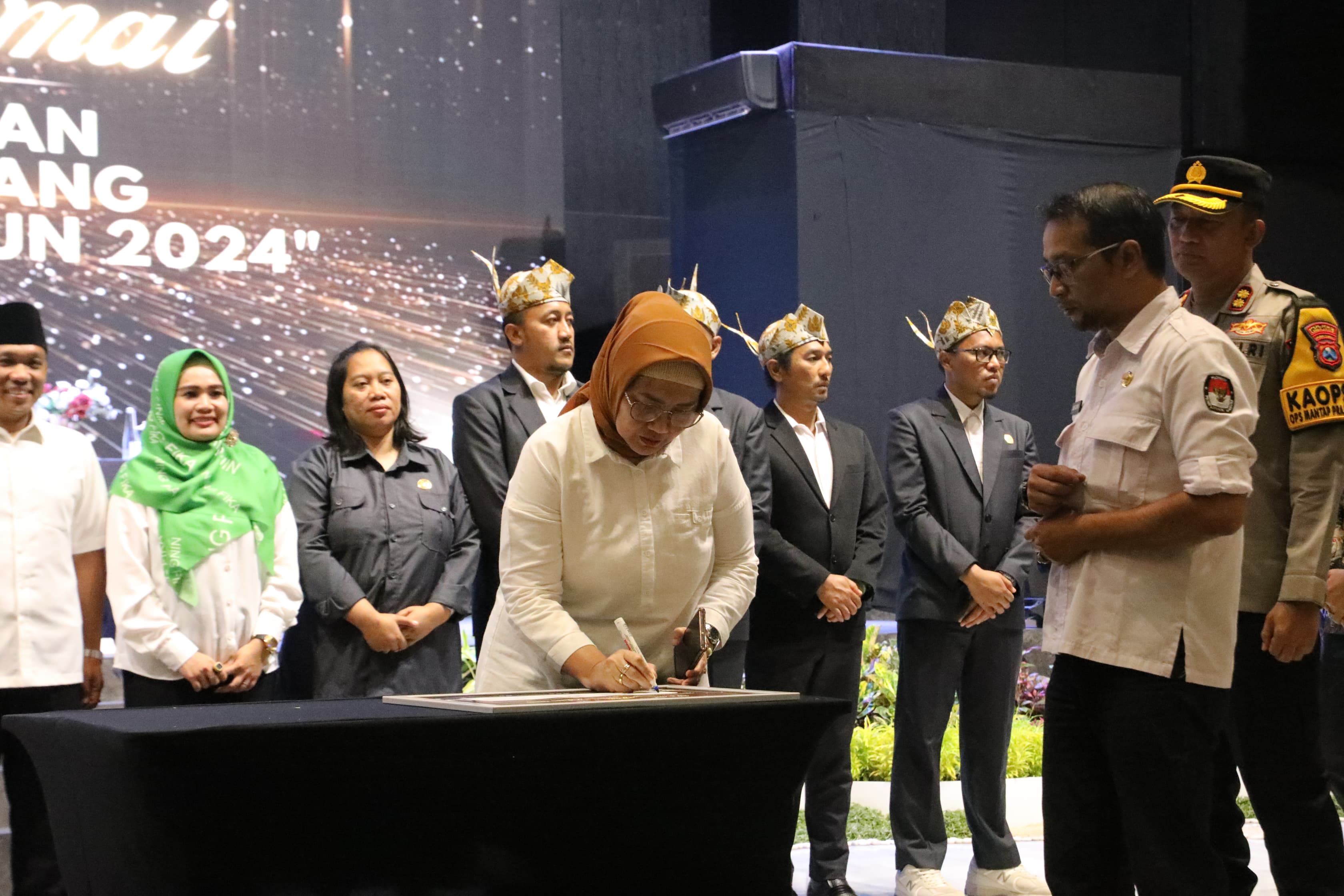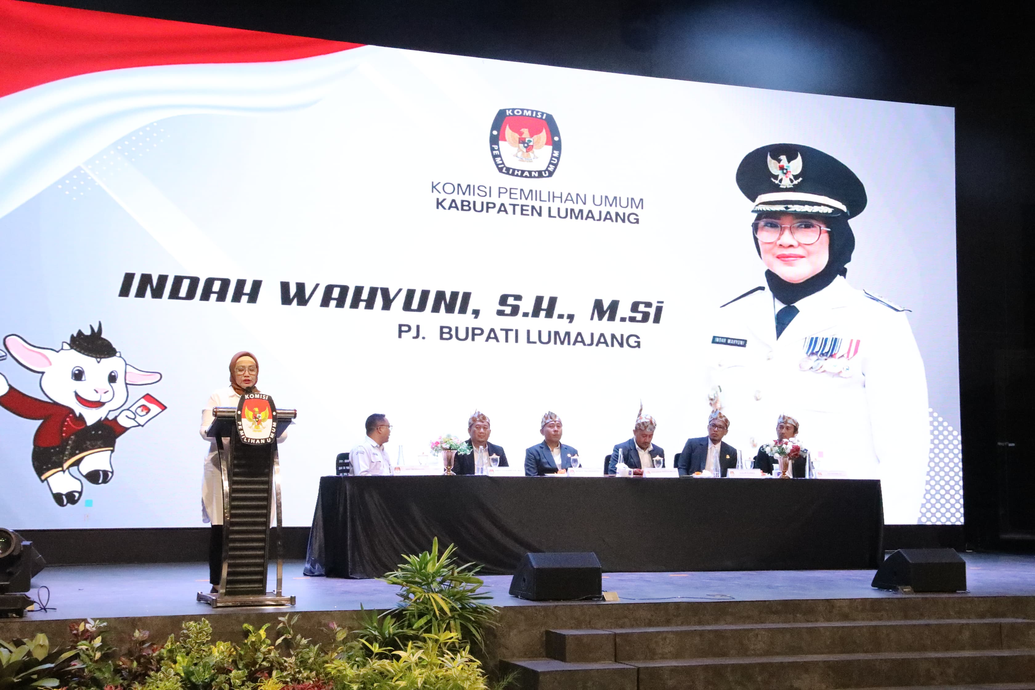Penjabat (Pj) Bupati Lumajang, Indah Wahyuni bersama Forkopimda Kabupaten Lumajang menghadiri Rapat Pleno Terbuka Pengundian dan Penetapan Nomor Urut Pasangan Calon Bupati dan Wakil Bupati Lumajang pada Pilkada Serentak Tahun 2024, di gedung Rock Convention Center (RCC) Jalan Lintas Timur (JLT) Lumajang, Senin (23/9/2024).