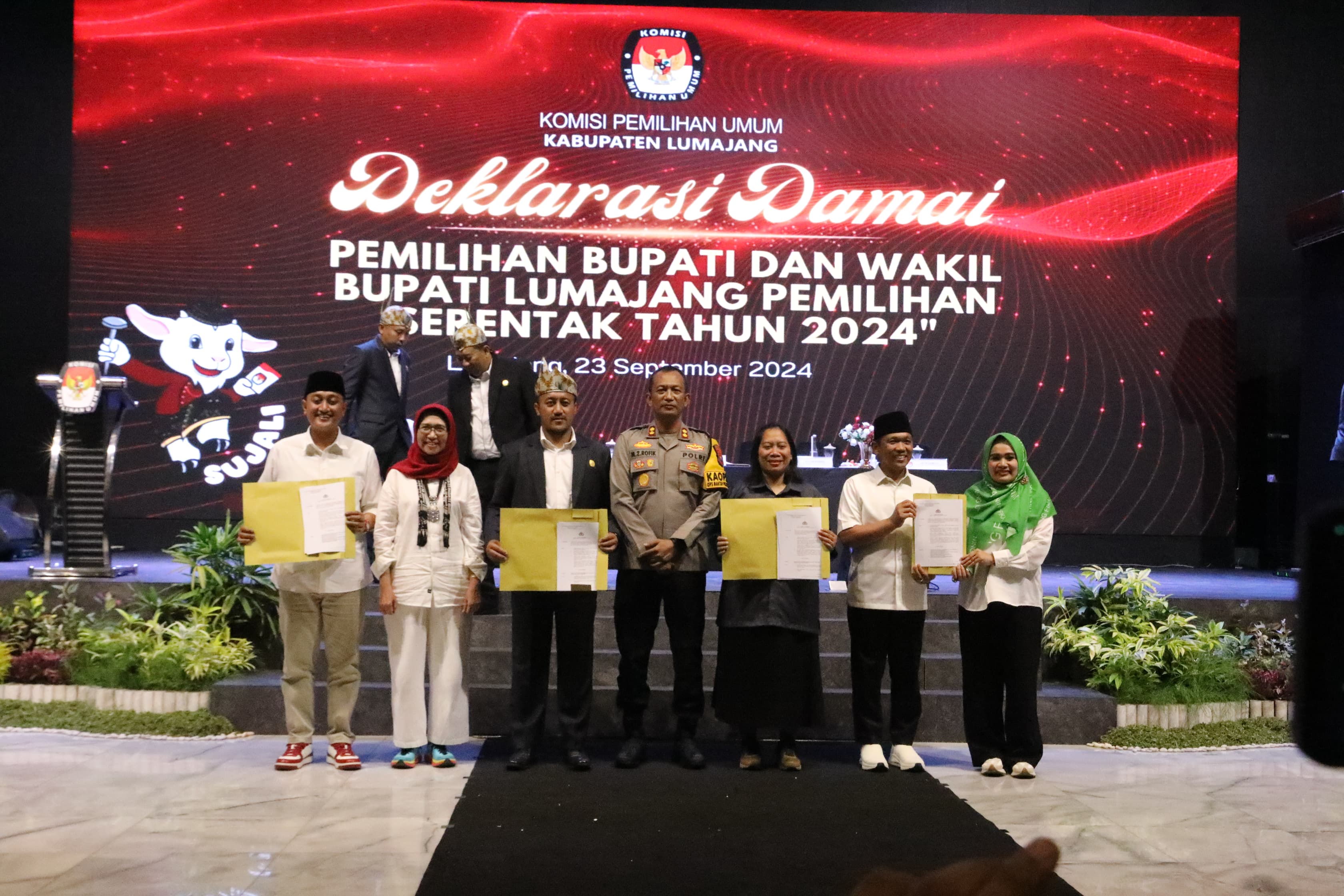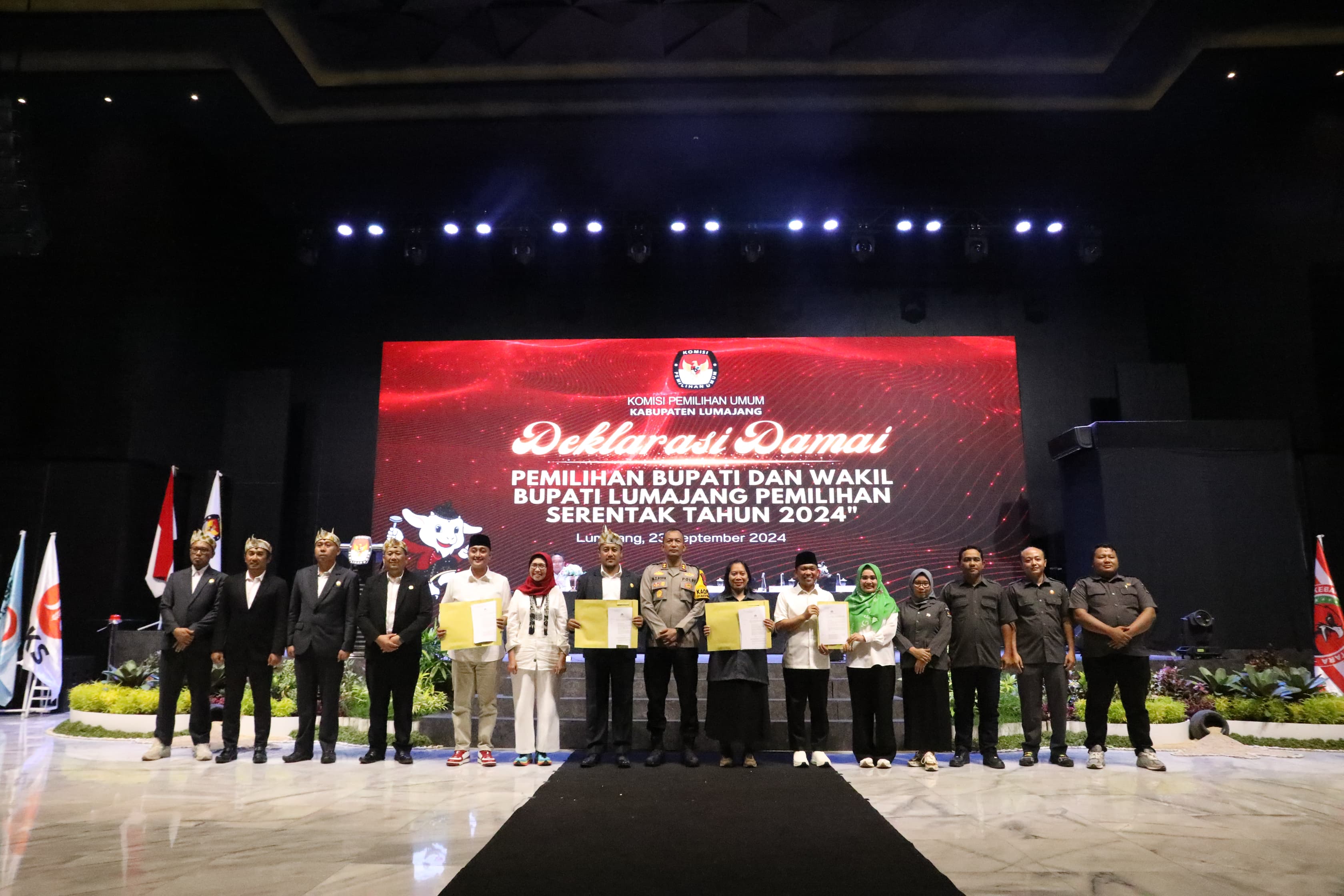 Penjabat (Pj) Bupati Lumajang, Indah Wahyuni bersama Forkopimda Kabupaten Lumajang menghadiri Rapat Pleno Terbuka Pengundian dan Penetapan Nomor Urut Pasangan Calon Bupati dan Wakil Bupati Lumajang pada Pilkada Serentak Tahun 2024, di gedung Rock Convention Center (RCC) Jalan Lintas Timur (JLT) Lumajang, Senin (23/9/2024).