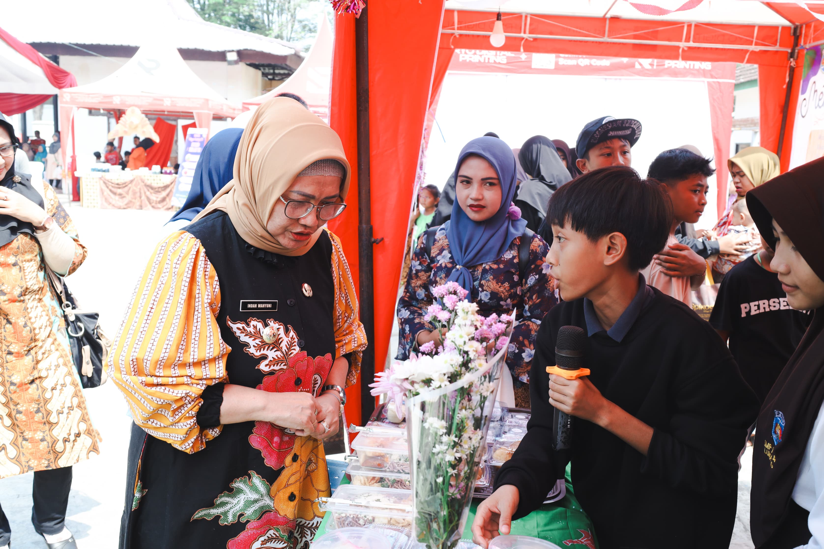 Pj. Bupati Lumajang, Indah Wahyuni (Yuyun) menyampaikan rasa bangganya kepada para pelajar SMP Negeri 4 Lumajang yang telah menunjukkan karya dan talentanya dalam kegiatan "Bazarku Bunga Telangku".