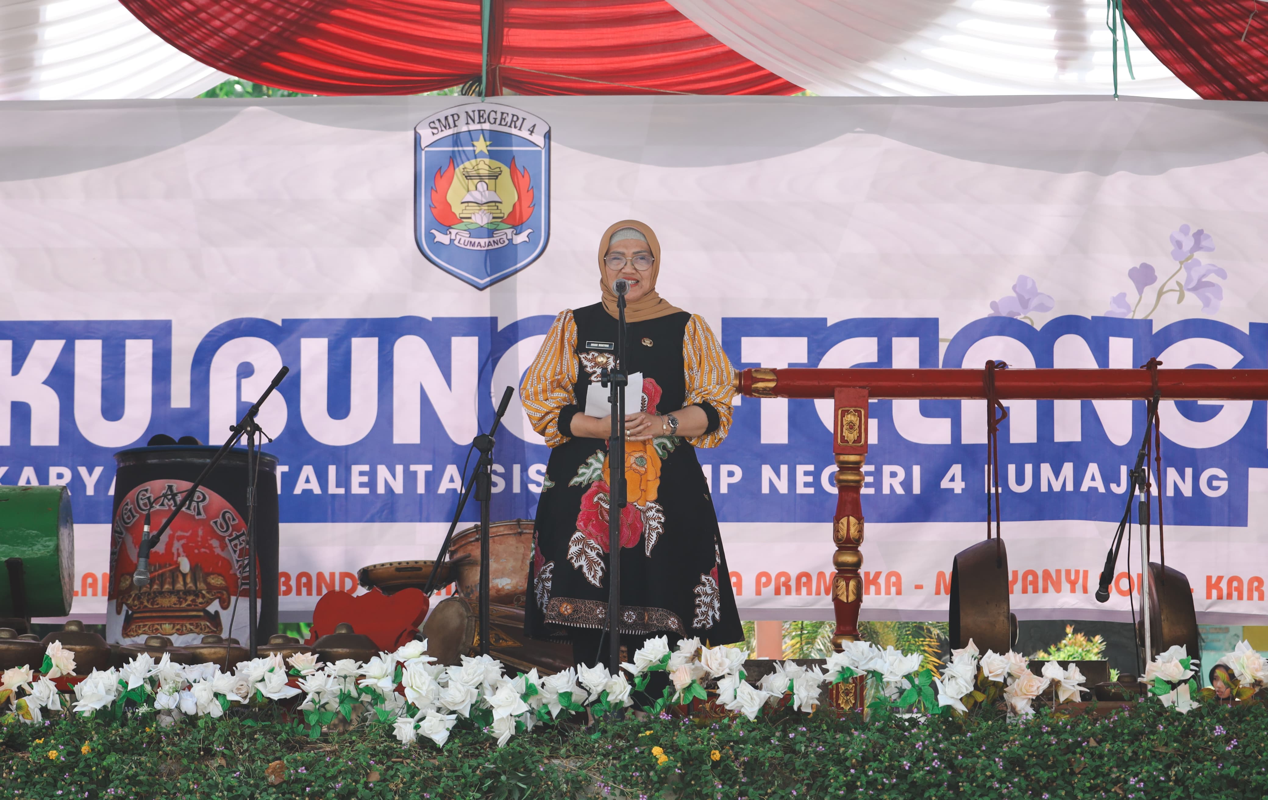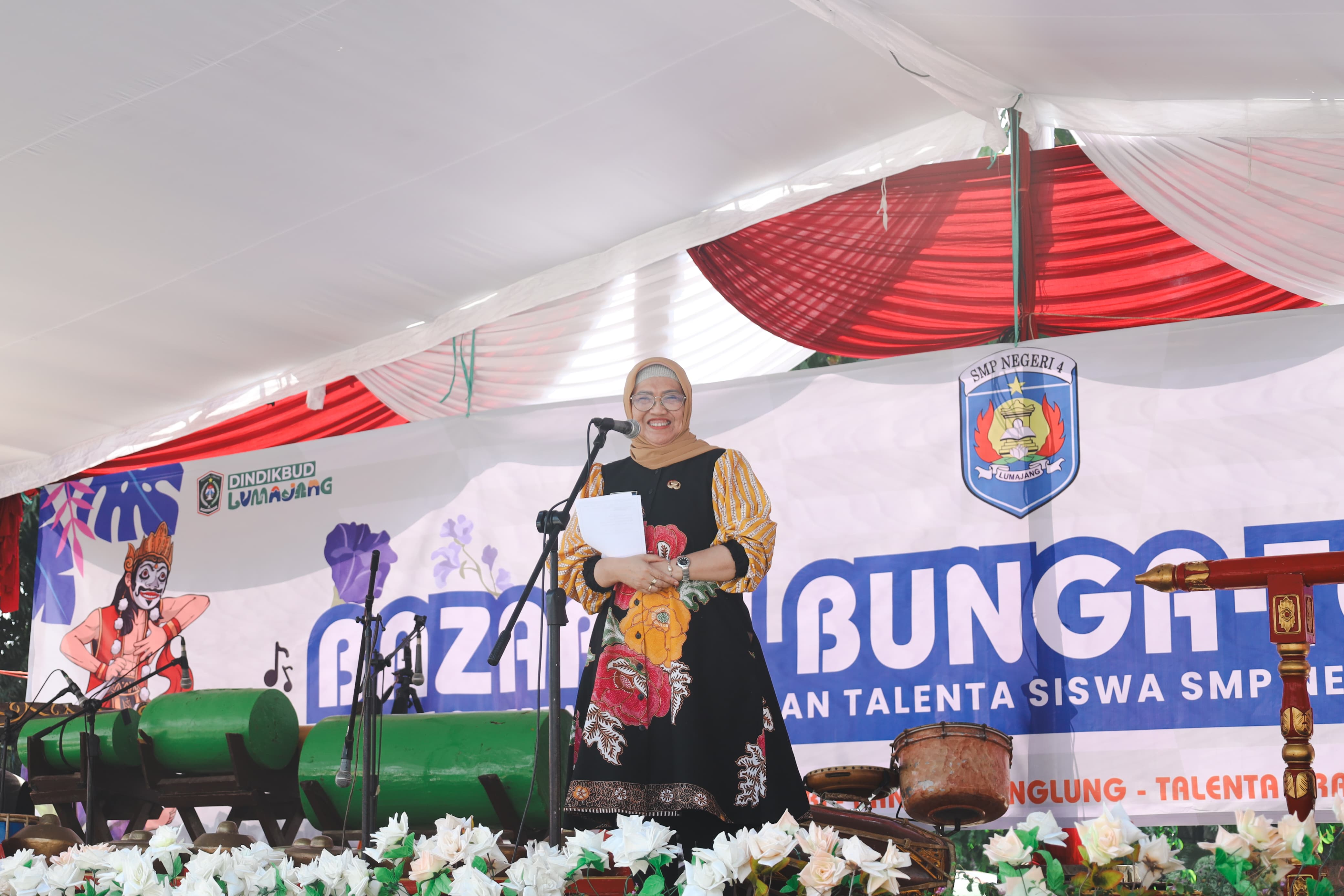 Pj. Bupati Lumajang, Indah Wahyuni (Yuyun) menyampaikan rasa bangganya kepada para pelajar SMP Negeri 4 Lumajang yang telah menunjukkan karya dan talentanya dalam kegiatan "Bazarku Bunga Telangku".