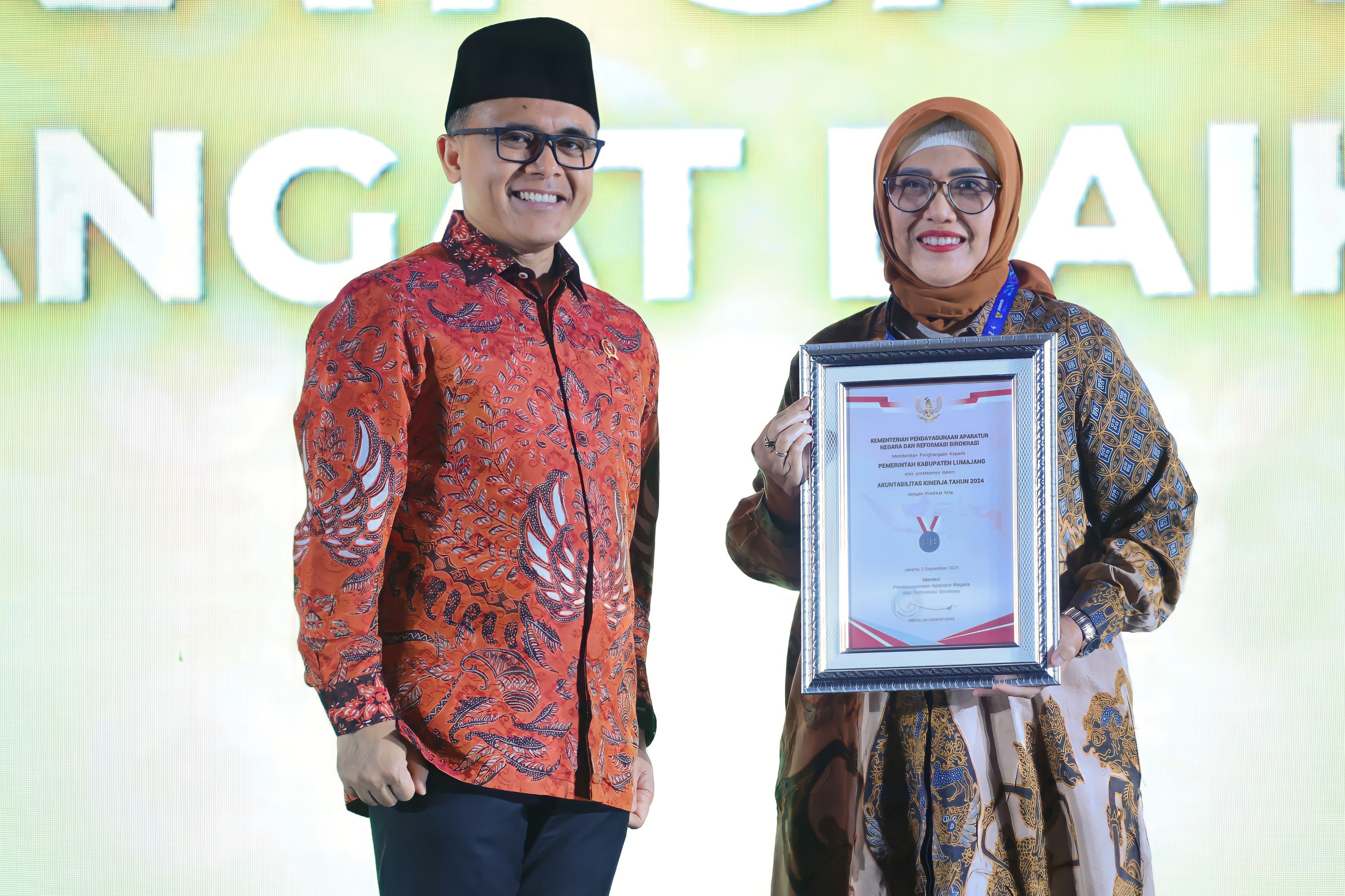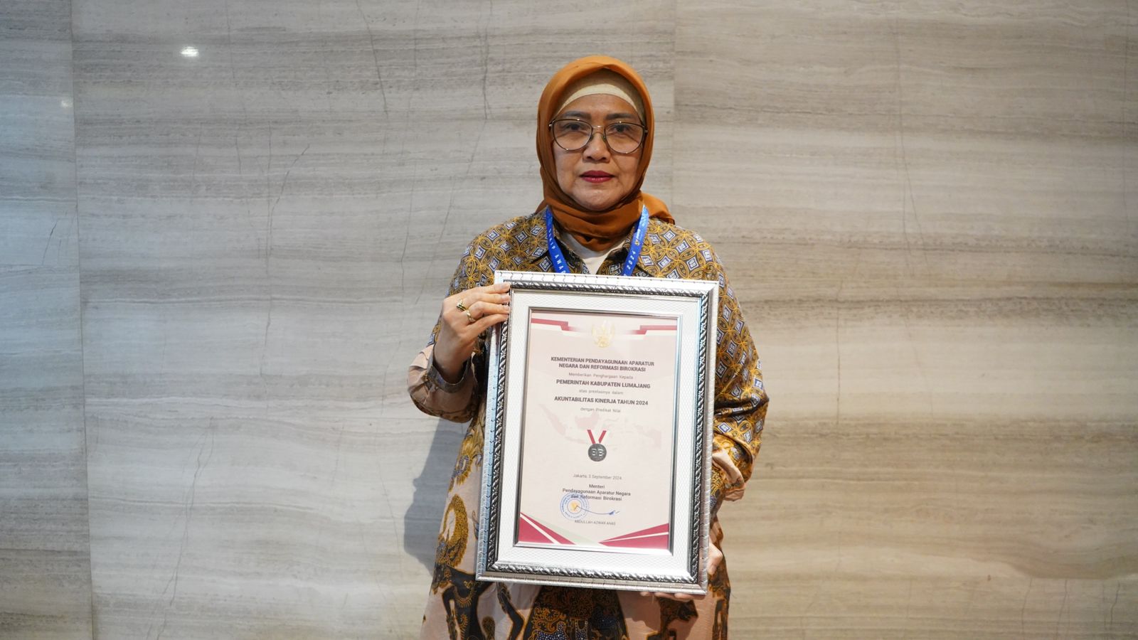 Penghargaan itu, diserahkan oleh Menteri Pendayagunaan Negara dan Reformasi Birokrasi, Abdullah Azwar Anas kepada Penjabat (Pj) Bupati Lumajang, Indah Wahyuni (Yuyun) dalam SAKIP Award 2024, di Grand Ballroom Birawa, Hotel Bidakara Jakarta, Rabu (2/10/2024).