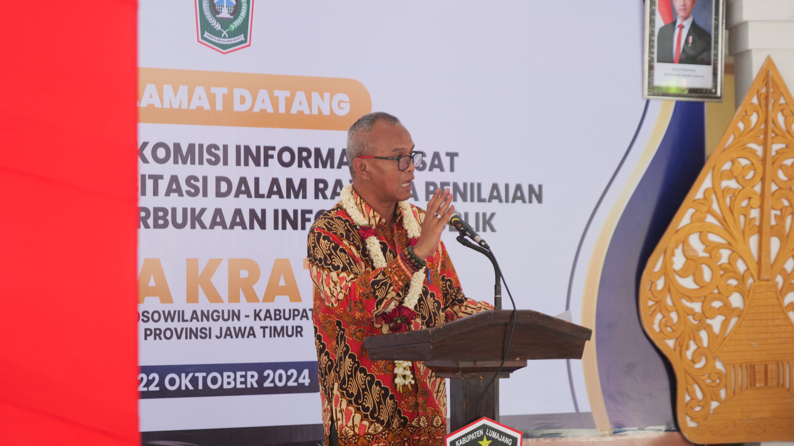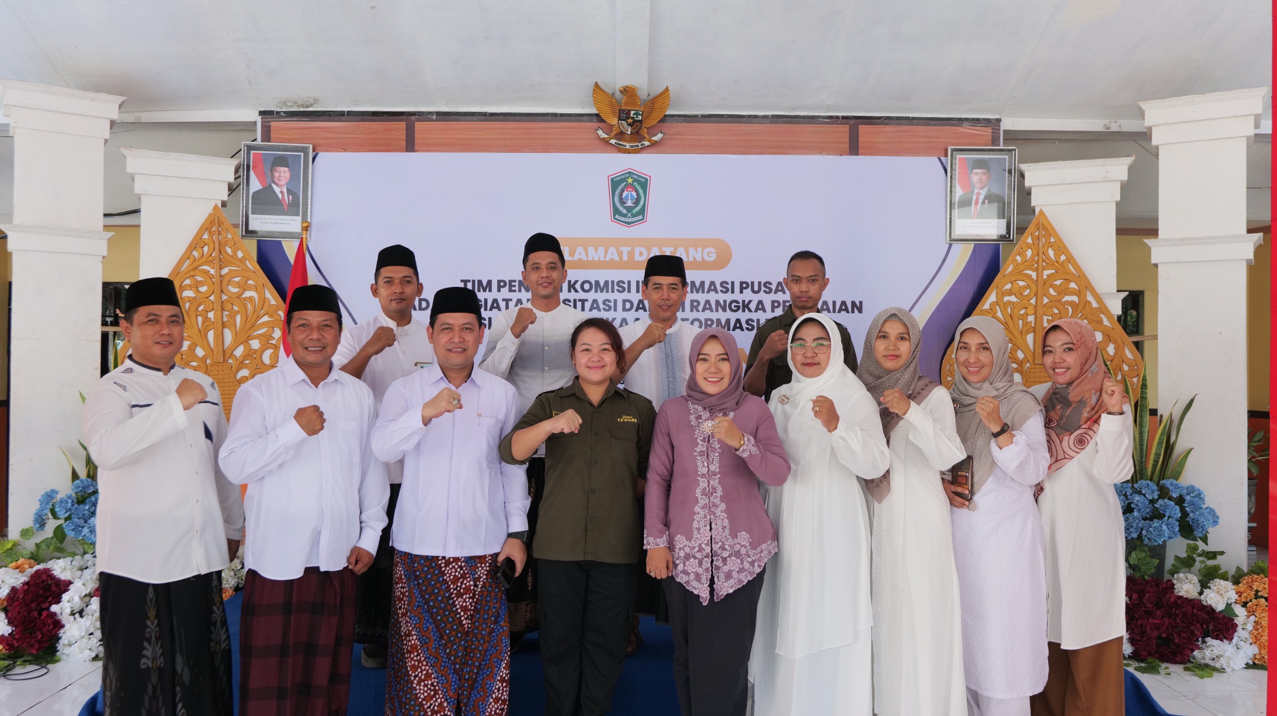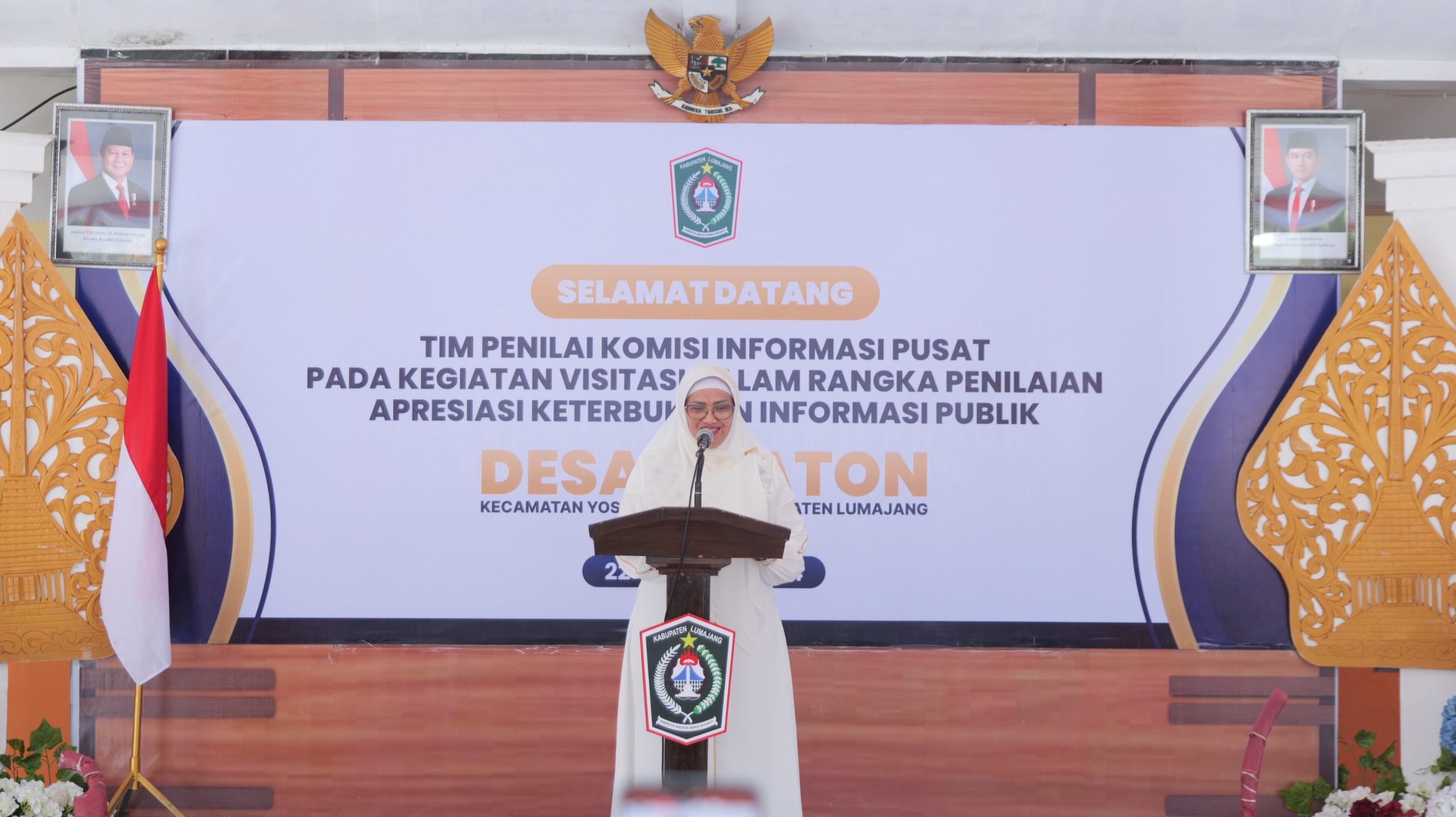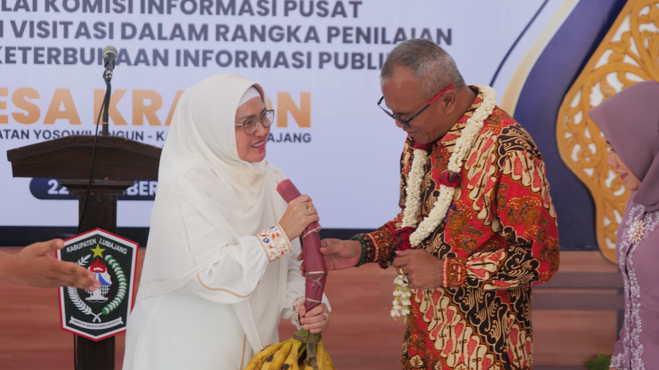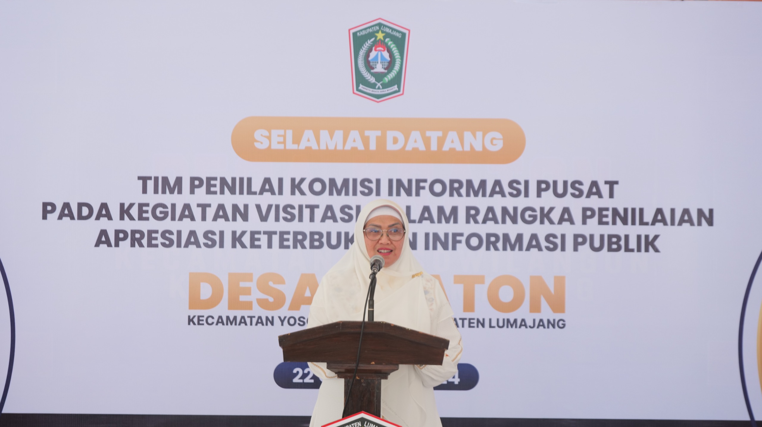 Pj. Bupati Lumajang, Indah Wahyuni sambut kedatangan Tim Penilai Komisi Informasi Pusat pada kegiatan visitasi dalam rangka penilaian apresiasi keterbukaan informasi publik Desa Kraton Kecamatan Yosowilangun, Kabupaten Lumajang, Selasa (22/10/2024).