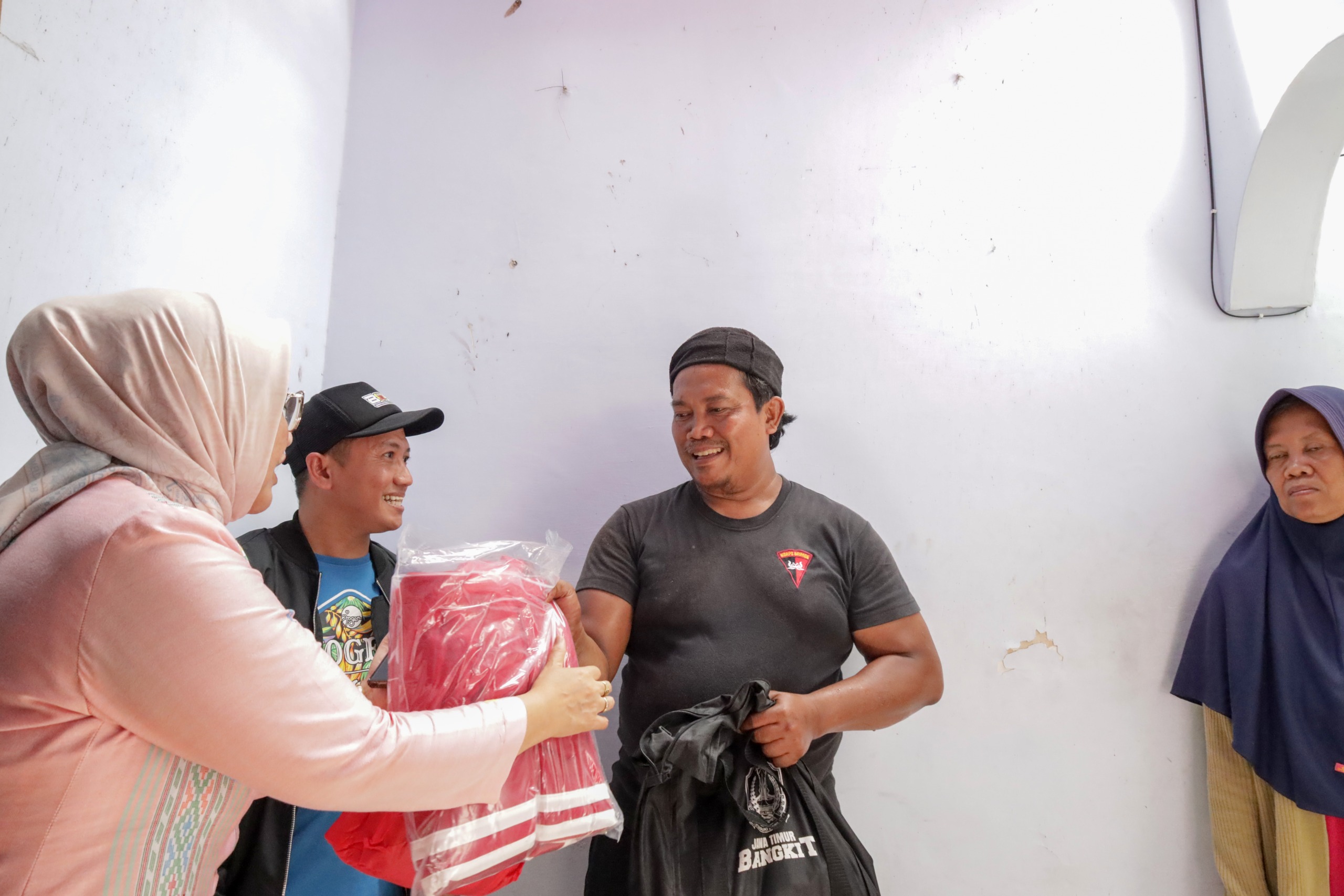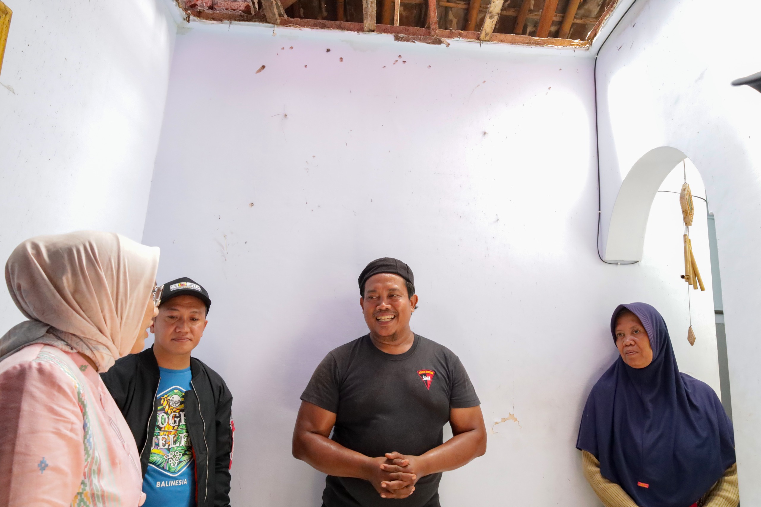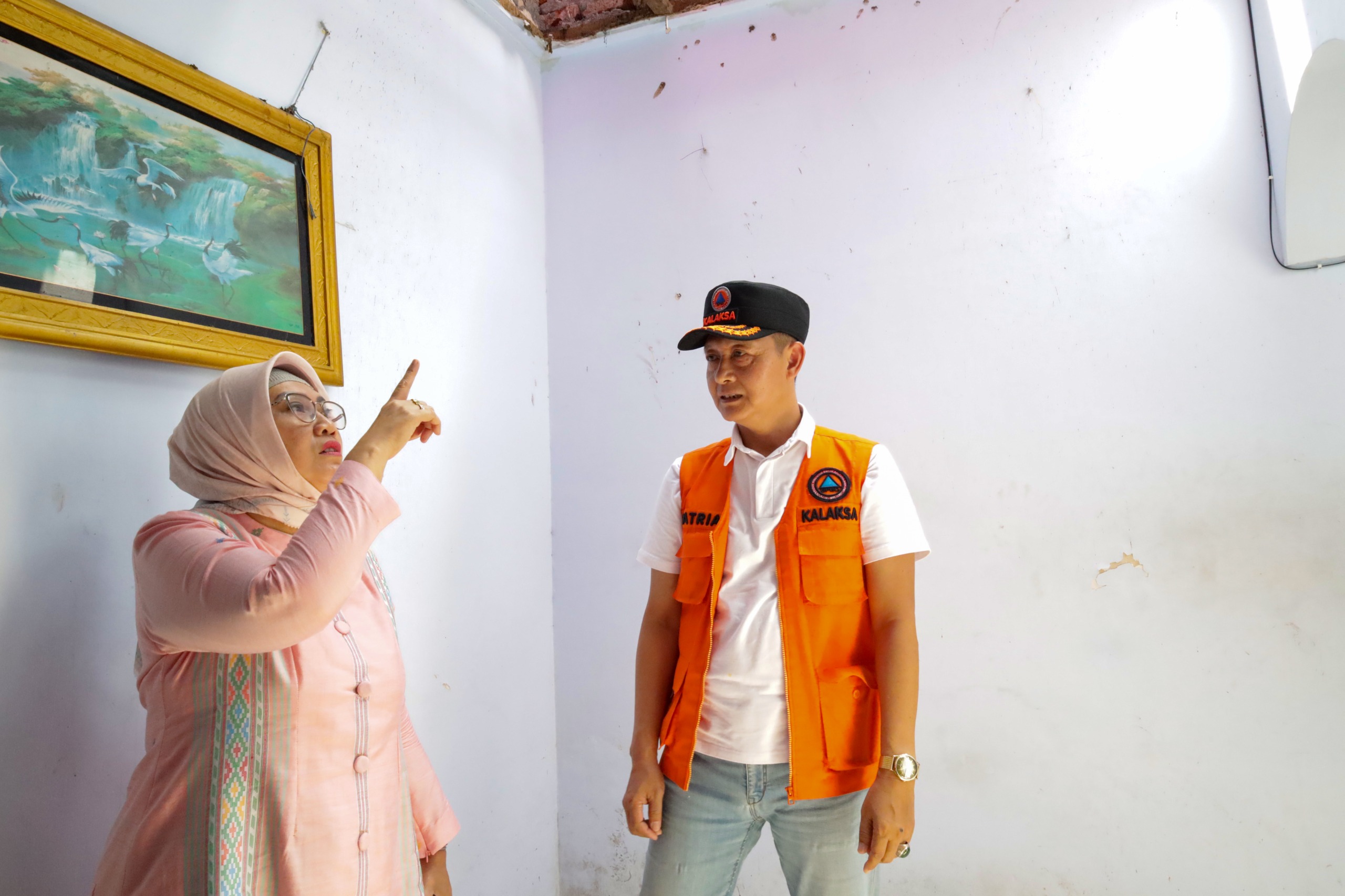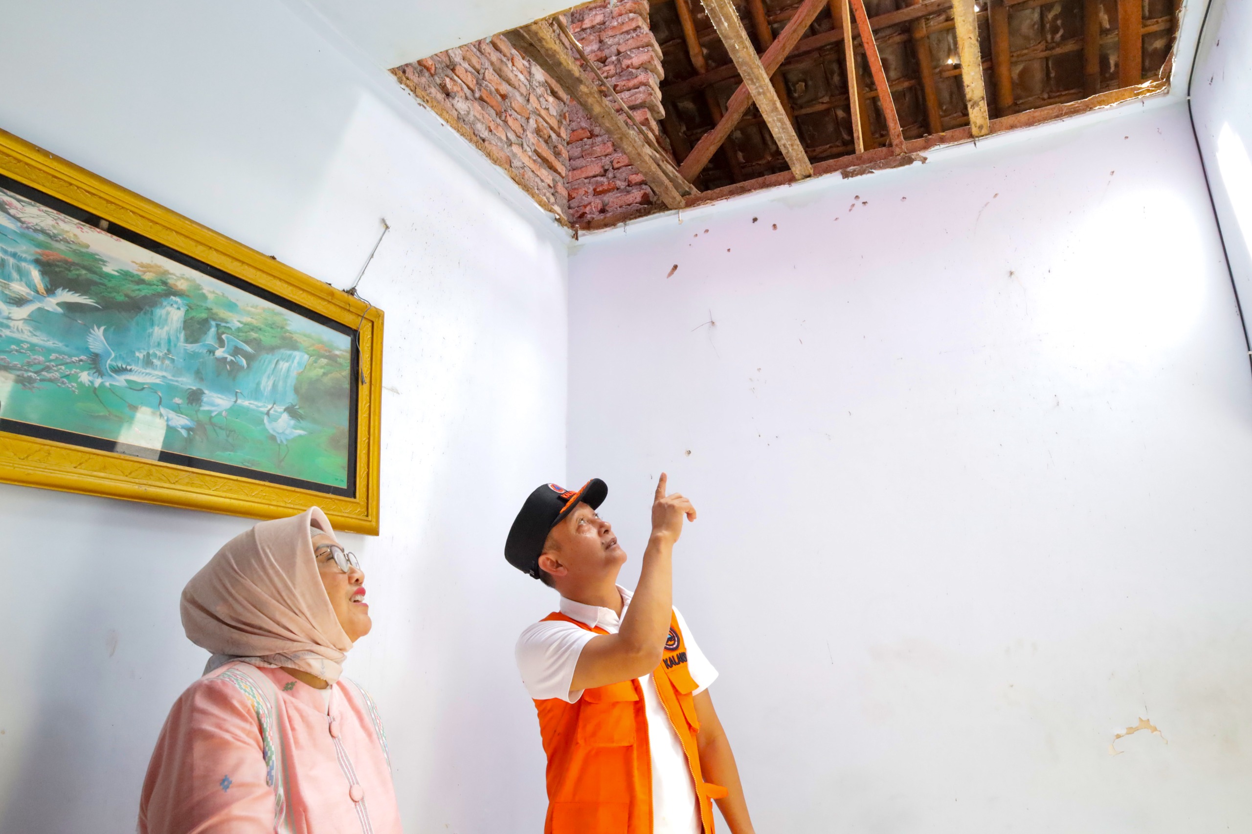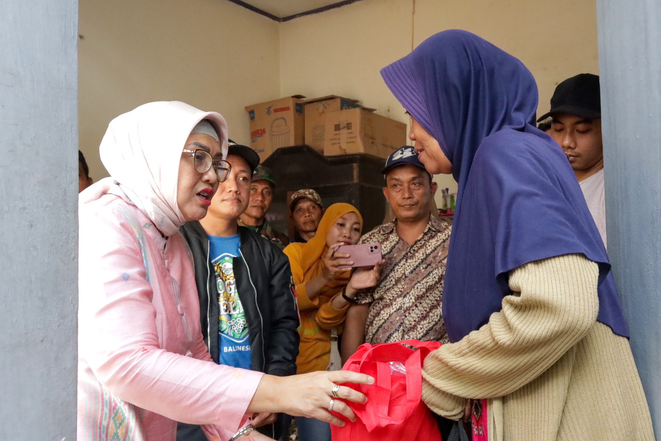 Pj. Bupati Lumajang, Indah Wahyuni meninjau rumah warga yang tertimpa musibah akibat diterjang angin puting beliung sekaligus memberikan bantuan kepada para korban bencana, di Kelurahan Tompokersan Kecamatan Lumajang, Minggu (3/11/2024).