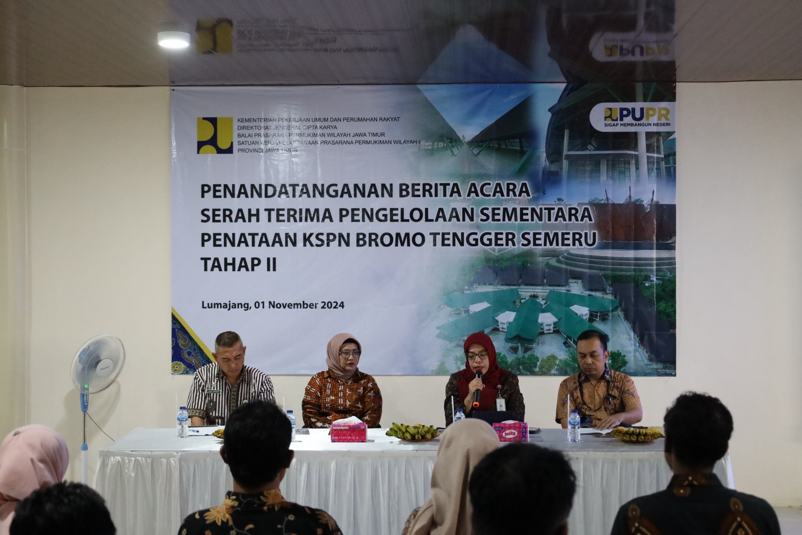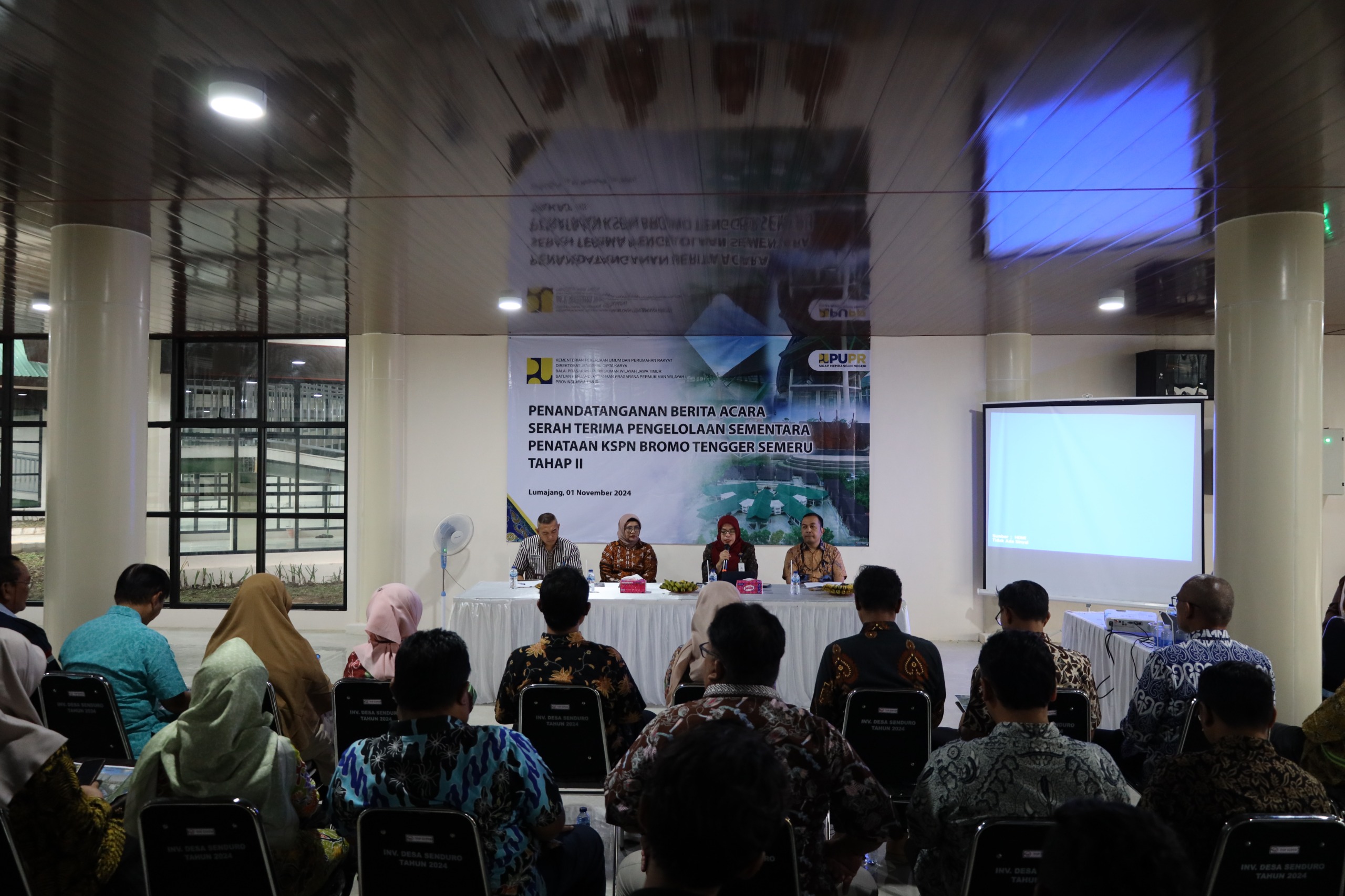 Pj. Bupati Lumajang, Indah Wahyuni dan Kepala Satuan Kerja Prasarana Permukiman Wilayah I Jatim, Denny Kumara melakukan Penandatanganan Bersama Dokumen Berita Serah Terima Operasional ( BASTO) Sementara Gerbang Bromo Tengger Semeru, Senduro, Lumajang, Jum'at (01/11/2024).