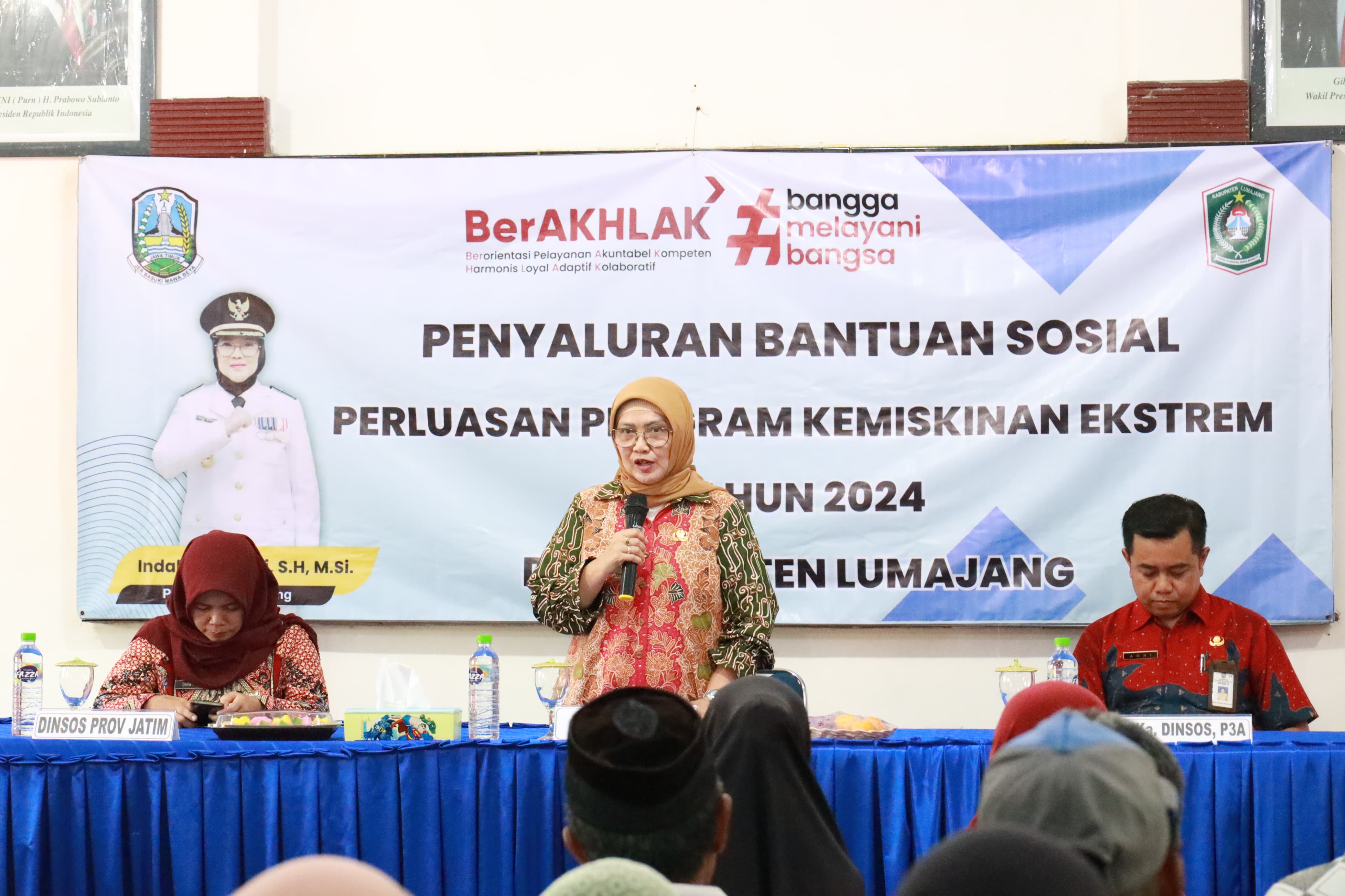 Guna menurunkan angka kemiskinan ektrem di Kabupaten Lumajang, Pj. Bupati Lumajang, Indah Wahyuni menyalurkan secara simbolis Bantuan Sosial Perluasan Program Kemiskinan Ekstrem Tahun 2024 di Kabupaten Lumajang, bertempat di Aula Raden Pandjidarkosoegondo Kecamatan Lumajang, Kamis (14/11/2024).