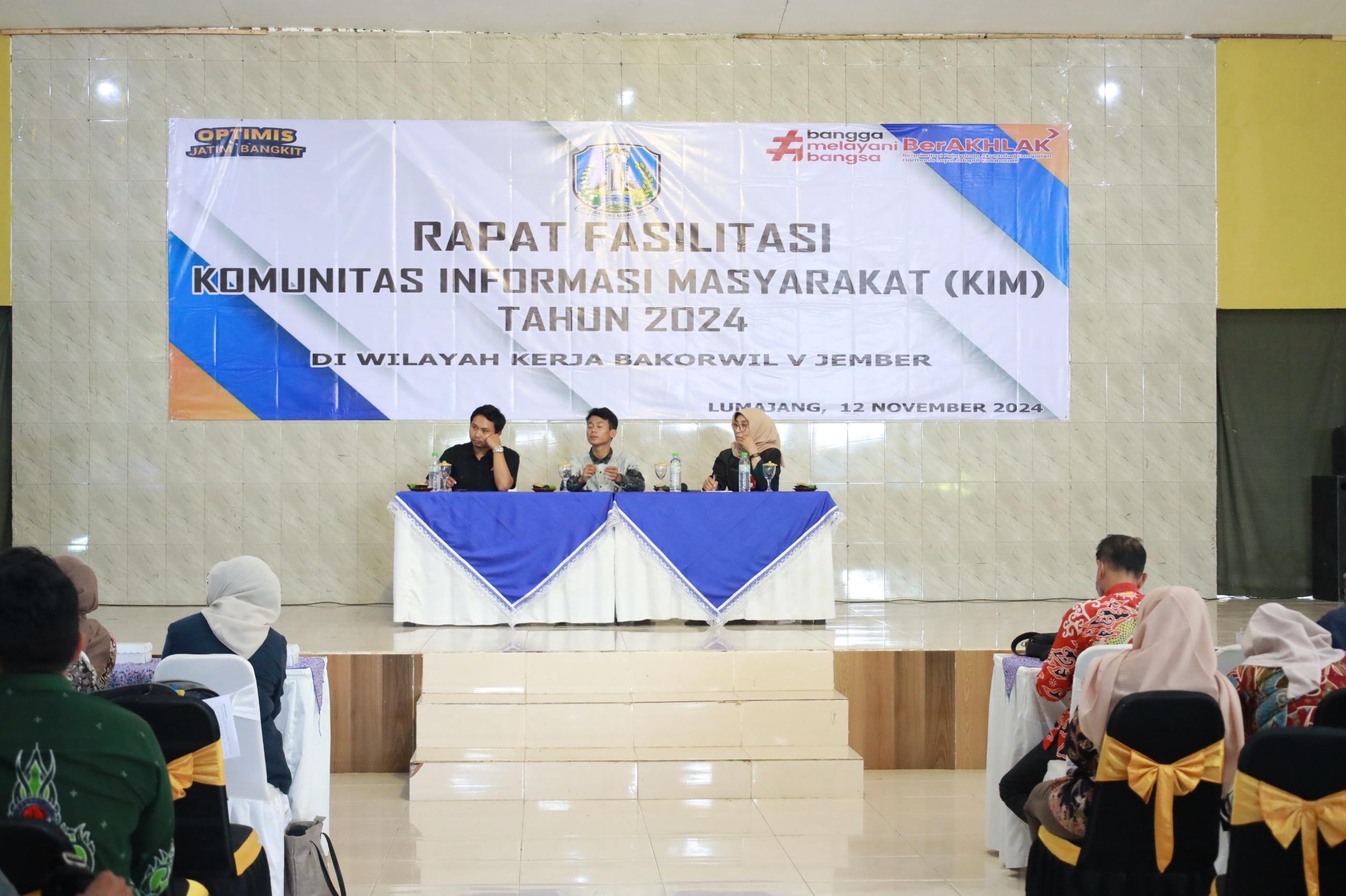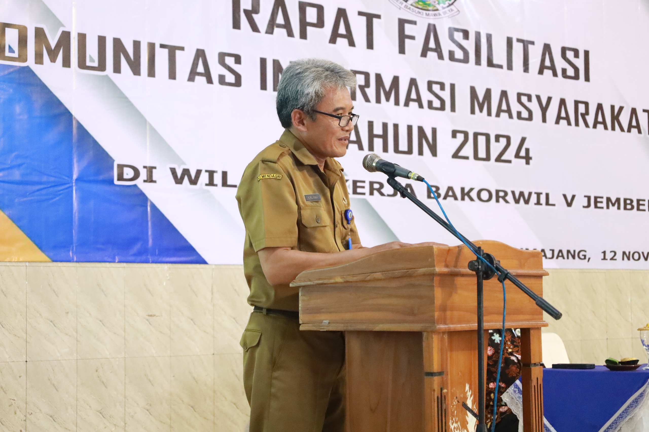 Bakorwil V Jember bersama dengan Pemerintah Kabupaten Lumajang melalui Dinas Komunikasi dan Informatika Kabupaten Lumajang menggelar kegiatan Rapat Fasilitasi Komunitas Informasi Masyarakat (KIM) Tahun 2024 di Wilayah Kerja Bakorwil V Jember, di Hall Istana Kuliner Lumajang, Selasa (12/11/2024).