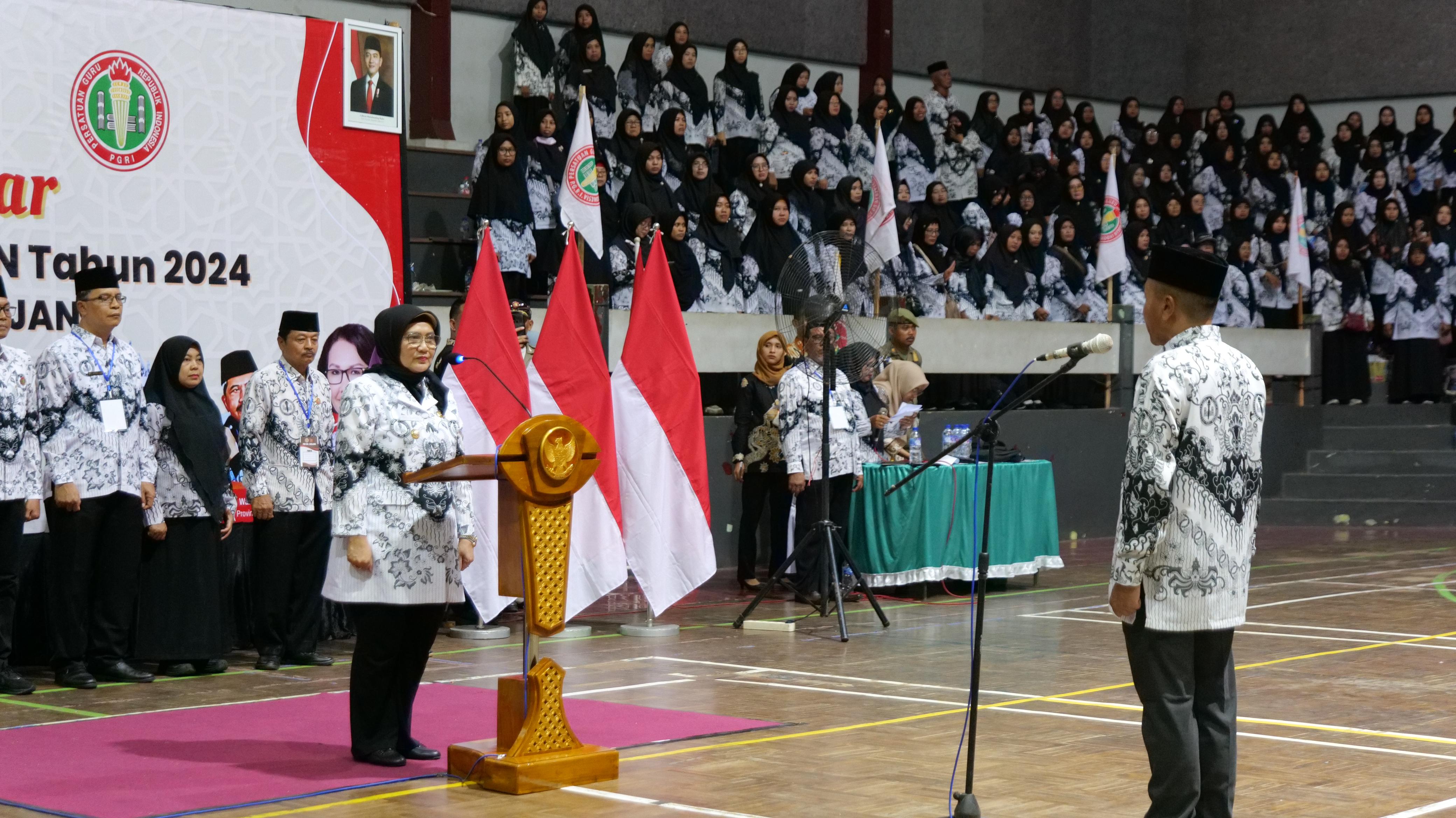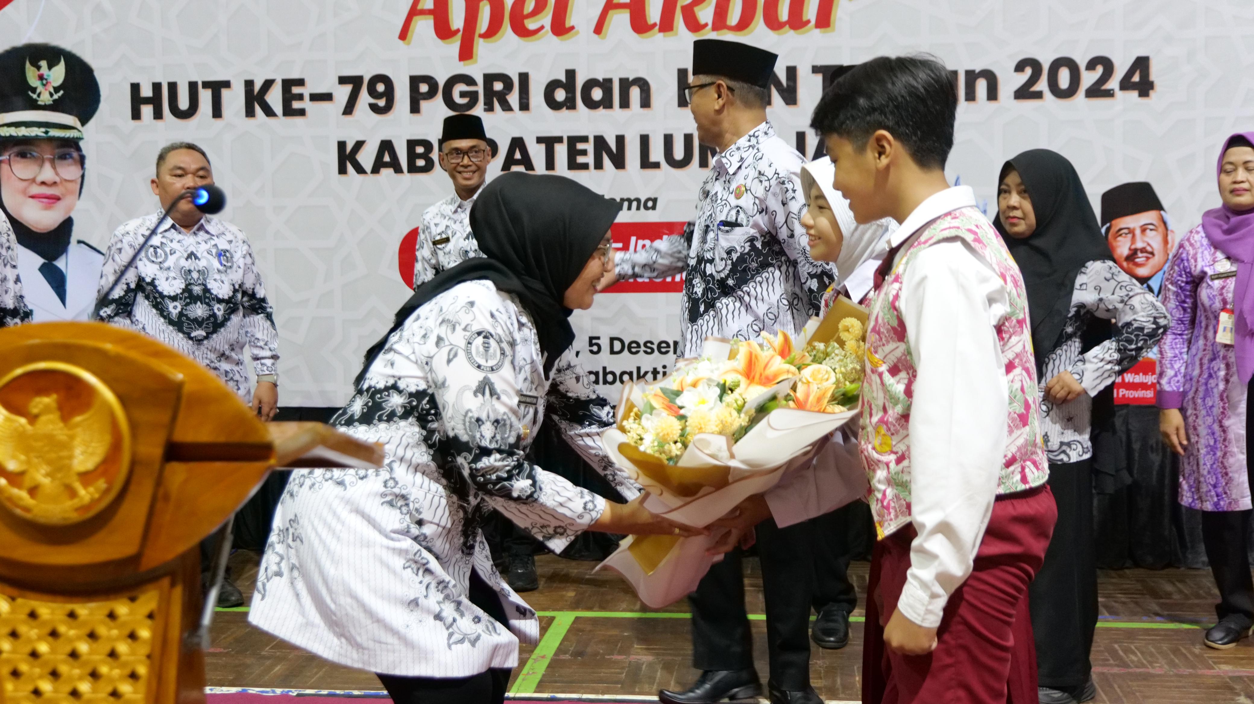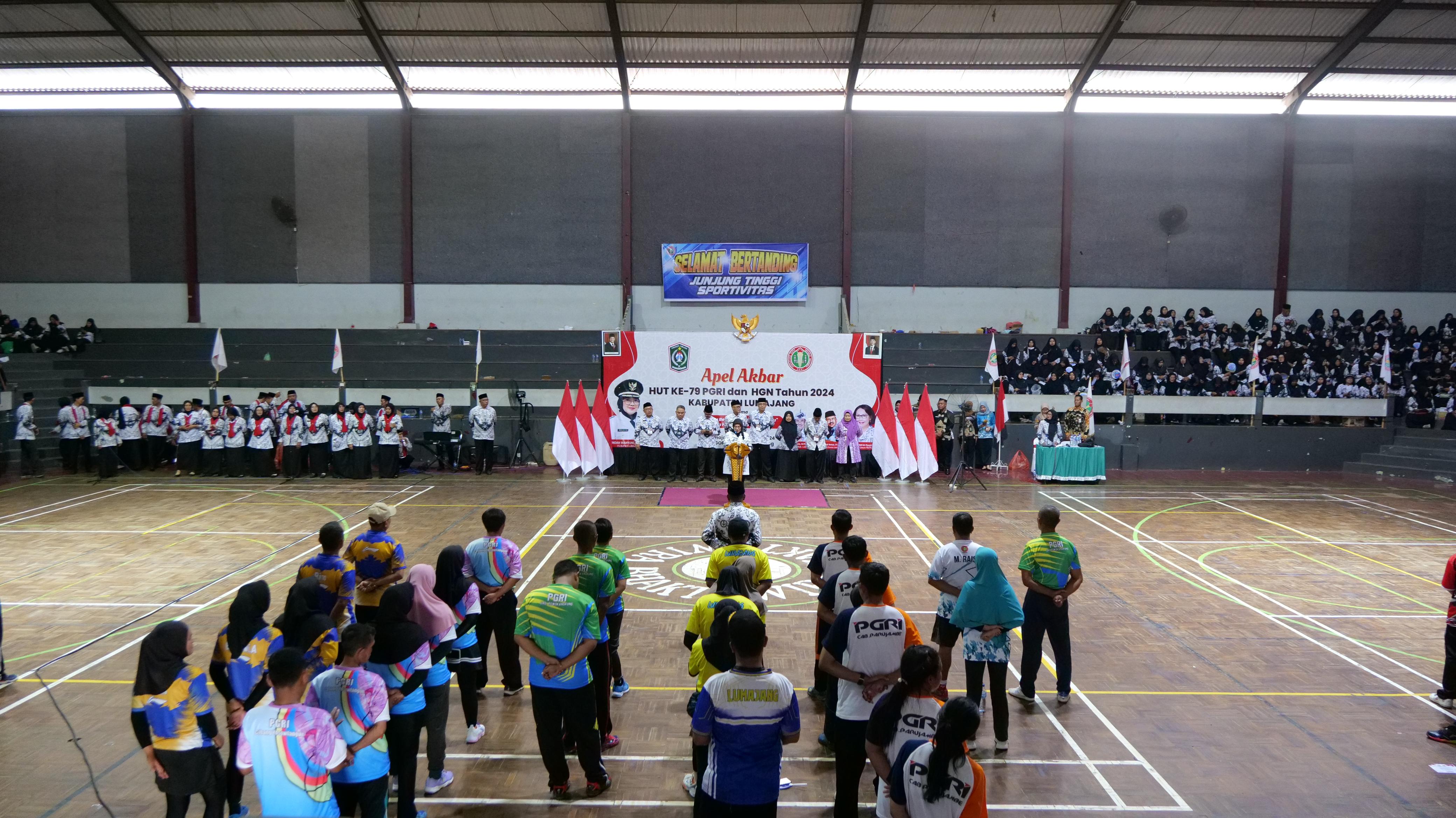 Penjabat (Pj) Bupati Lumajang Indah Wahyuni (Bunda Yuyun), membuka secara resmi apel peringatan Hari Guru Nasional (HGN) 2024 sekaligus Hari Ulang Tahun ke-79 Persatuan Guru Republik Indonesia (PGRI) yang berlangsung GOR Wira Bhakti Lumajang, Kamis (5/12/2024).